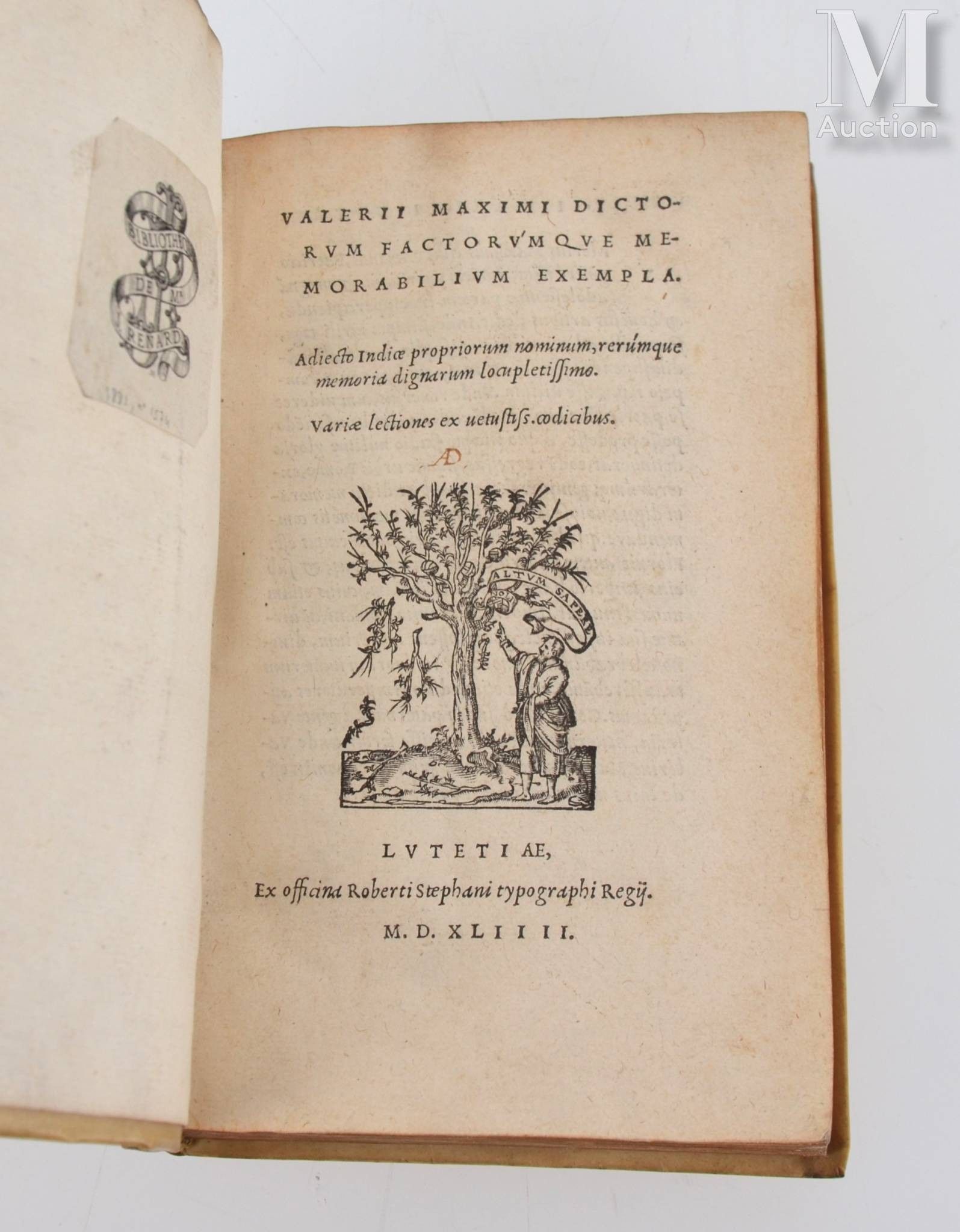 Dictorum factorumque memorabilium exempla. Paris, Robert Estienne, 1544 [at the end]: 7 January 1545. In-8, limp vellum overlay, double gilt fillet, foliate medallion with numeral in centre, smooth spine decorated with the same numeral repeated, gilt edges (Binding of the period).