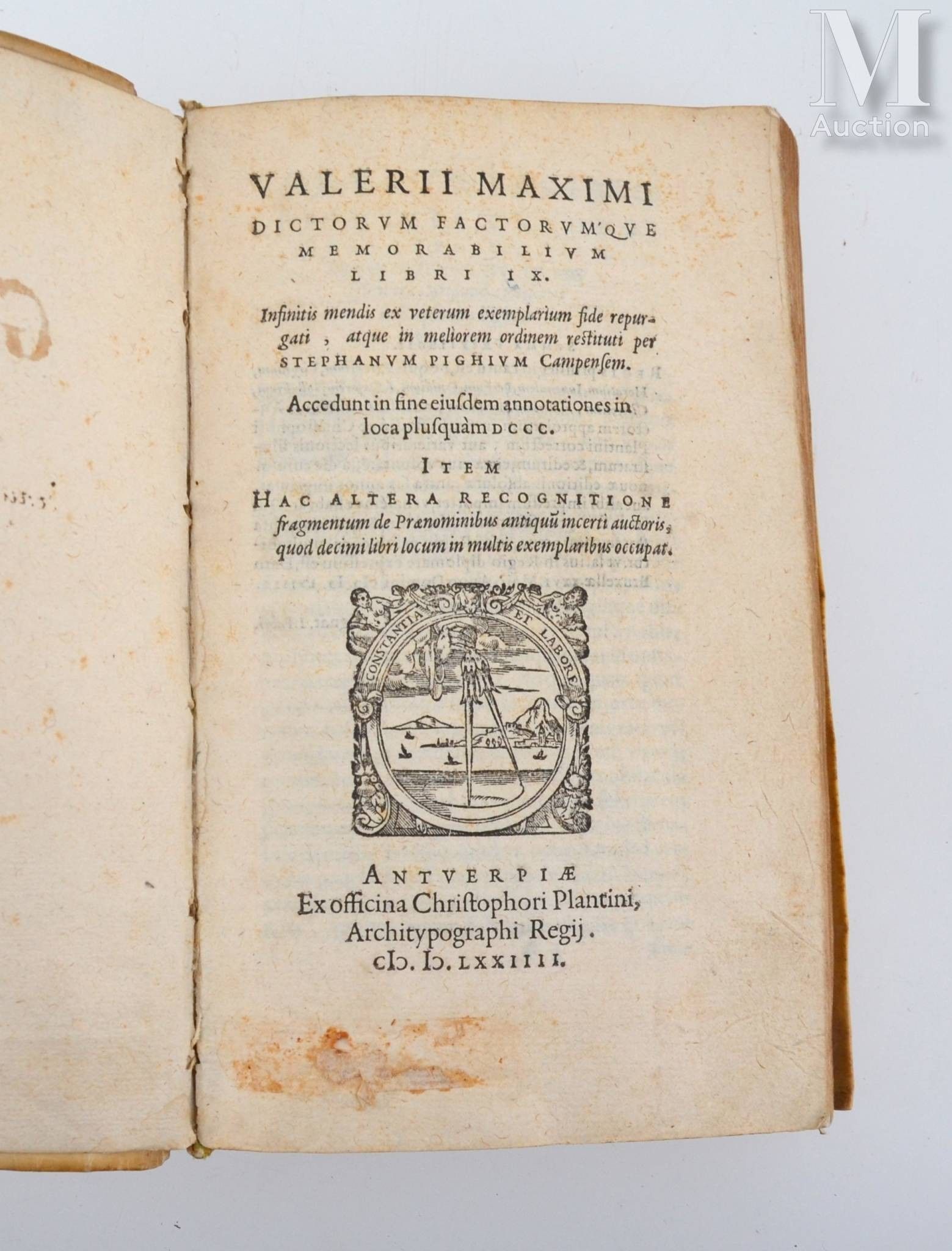 Dictorum factorumque memorabilium libri IX. Antwerp, Christophe Plantin, 1574. In-8, supple vellum overlay, double gilt fillet, spandrels, central cartouche, traces of laces, smooth spine decorated, gilt edges (Binding of the period).