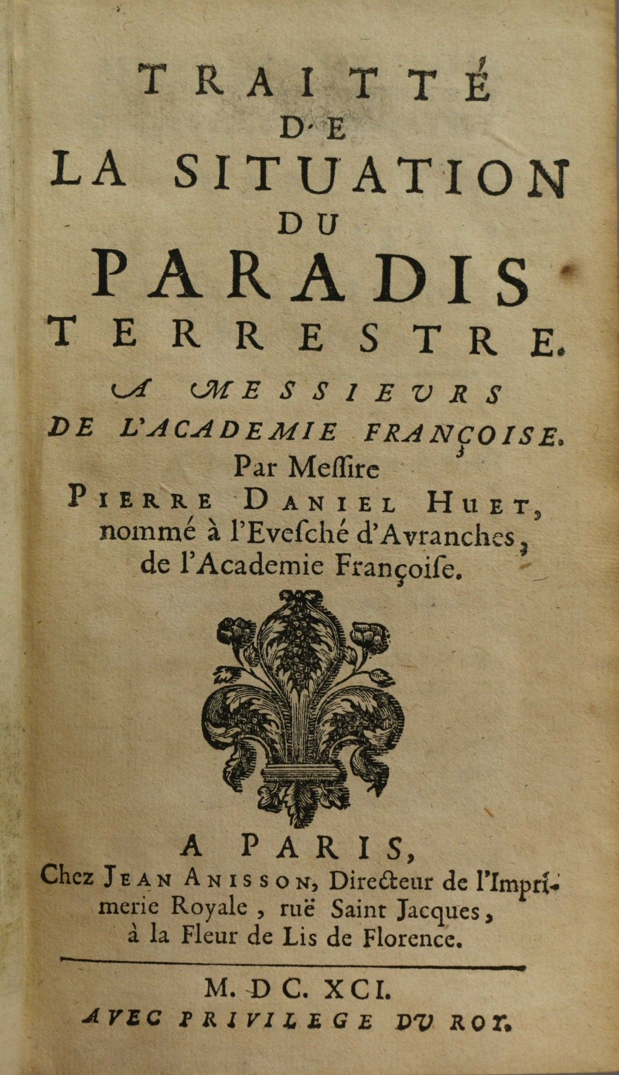 HUET (Pierre Daniel). Traité de la situation du paradis terrestre. Paris, Anisson, 1691, in-12, brown calf, ribbed spine (contemporary binding).