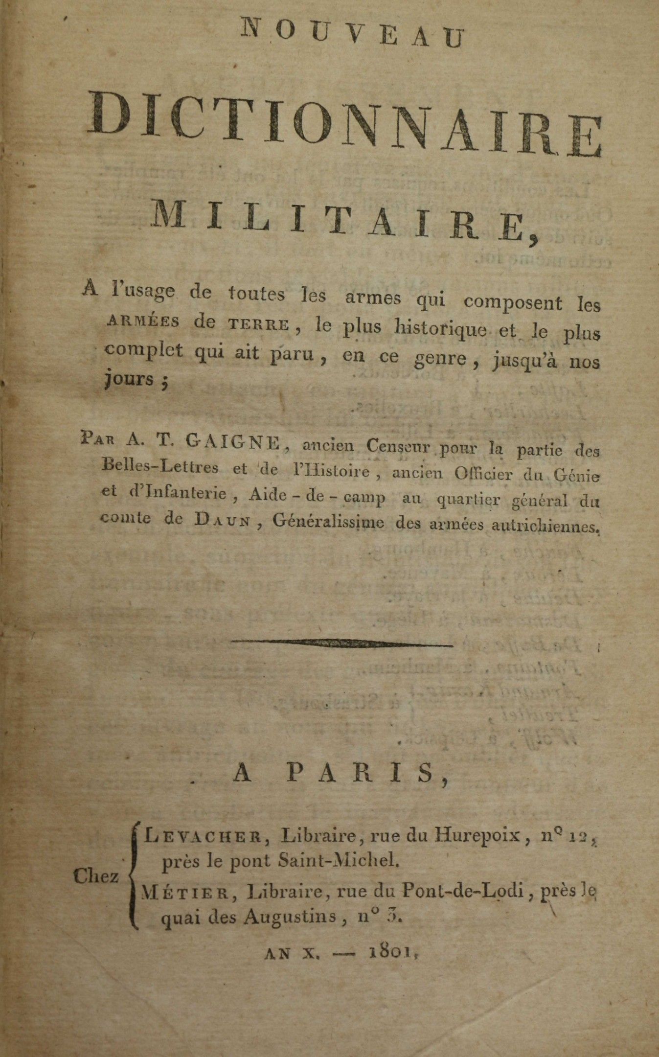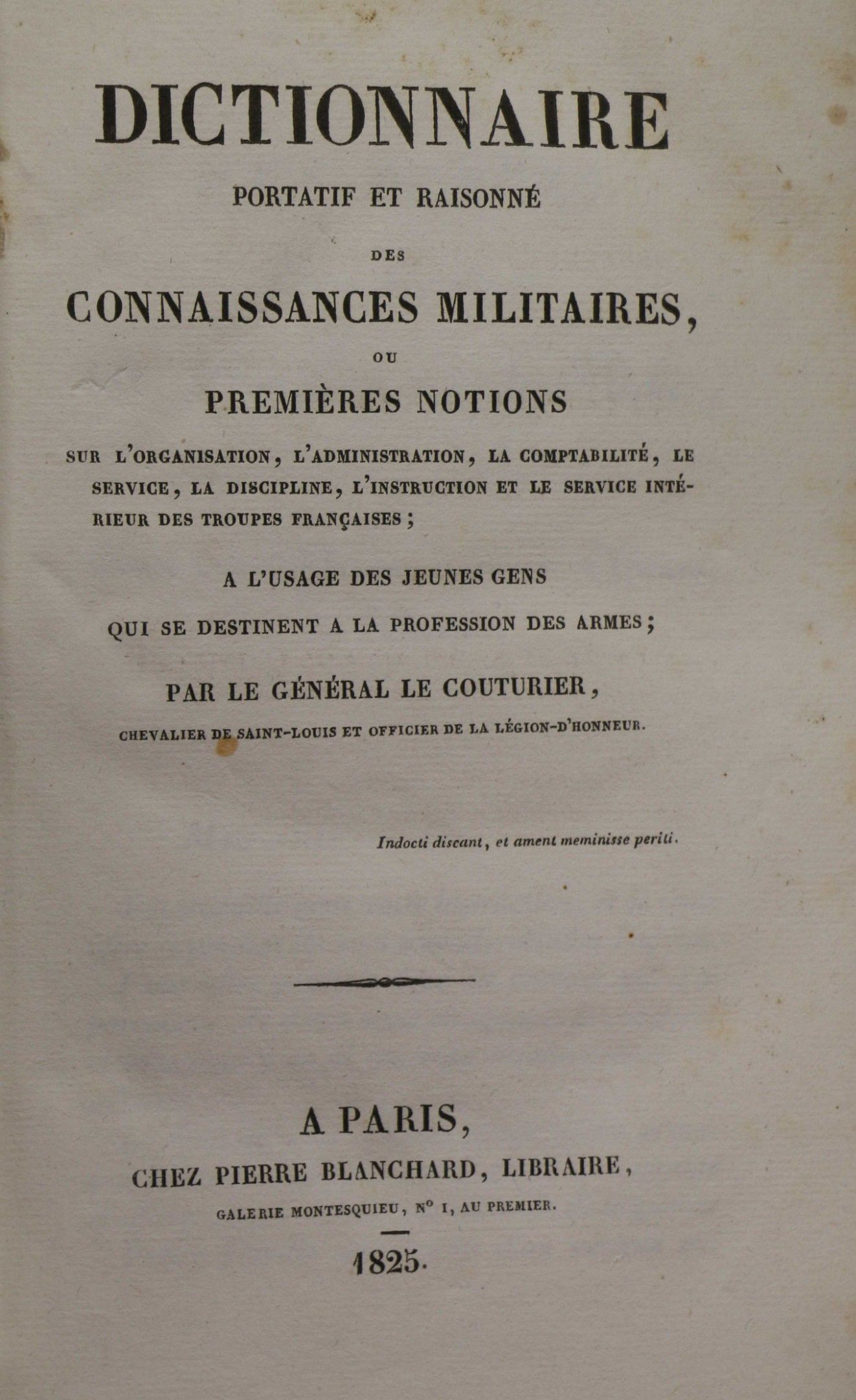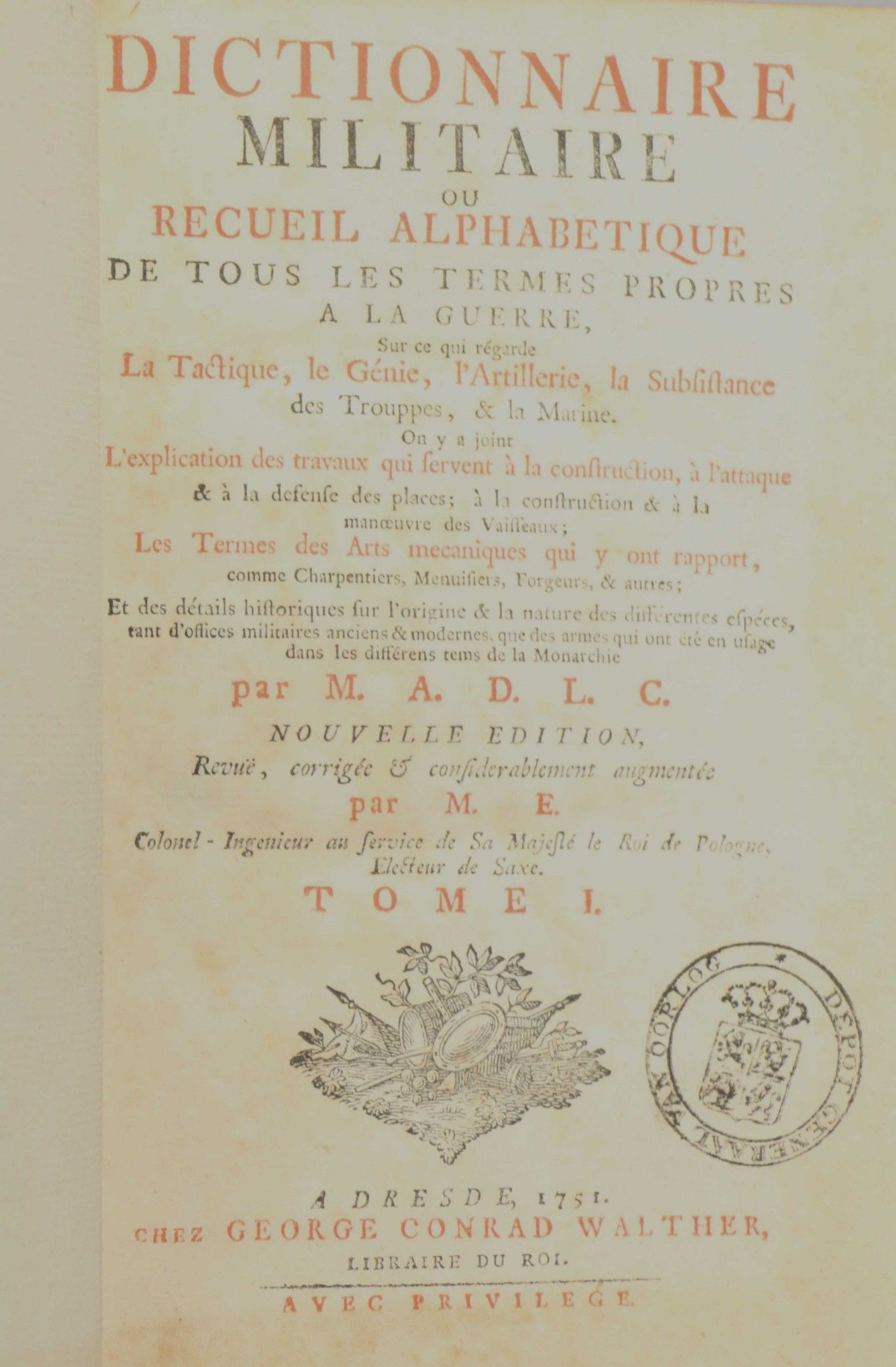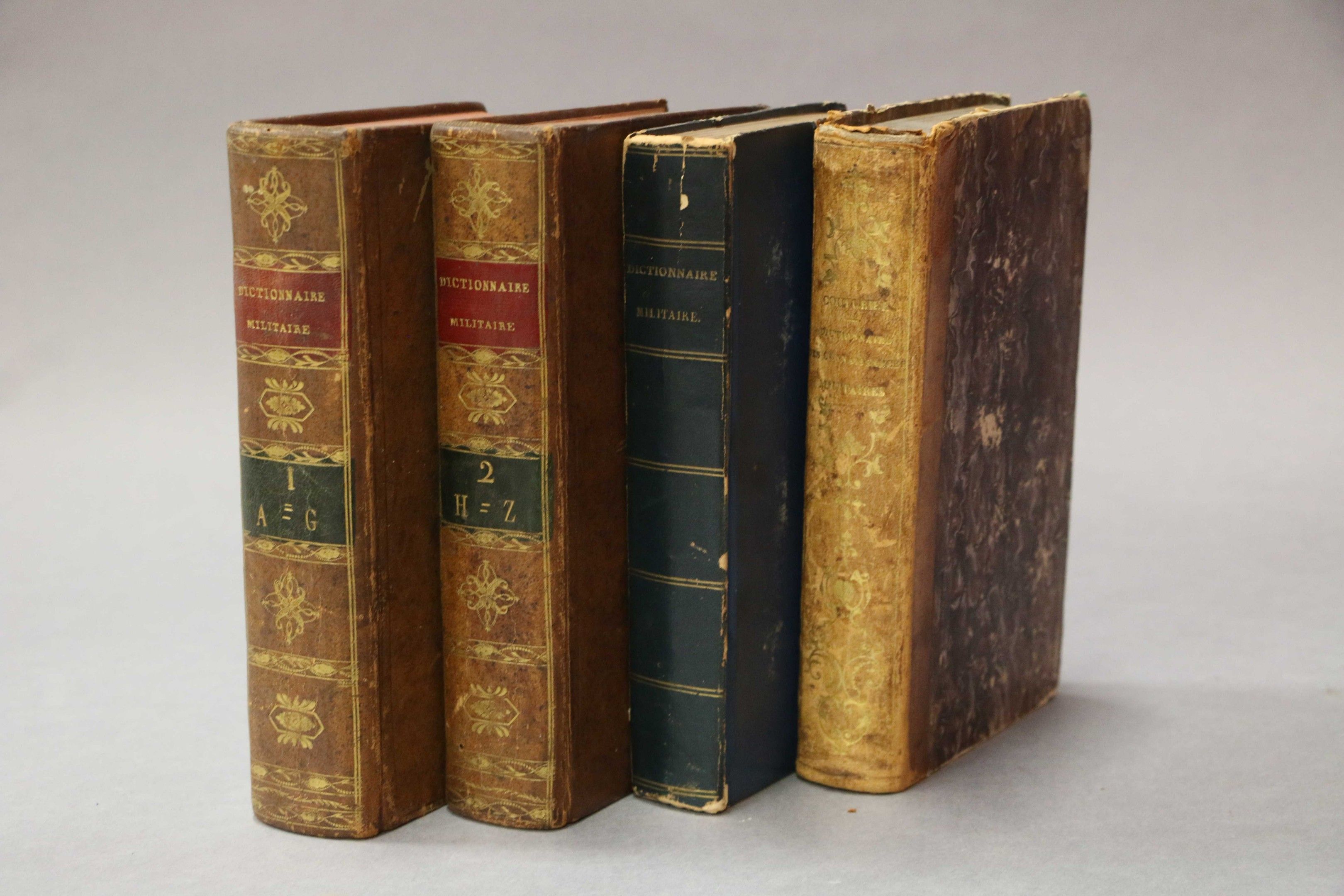 LA CHESNAYE DES BOIS. Dictionnaire militaire ou recueil alphabétique de tous les termes propres à la guerre. By M.A.D.L.C. Dresden, 1751, 2 vol. in-8, brown bas., smooth spine, ornamented, Van Oorlog deposit stamp. With a painting. - GAIGNE. New military dictionary. Paris, Levacher, An X - 1801, in-8, full worn blue paper. - LE COUTURIER (General). Dictionnaire portatif et raisonné des connaissances militaires ou premières notions sur l'organisation, l'administration, etc., in French. Paris, Blanchard, 1825, in-8, half calf, smooth spine, decorated (worn binding). Set of 3 vols.