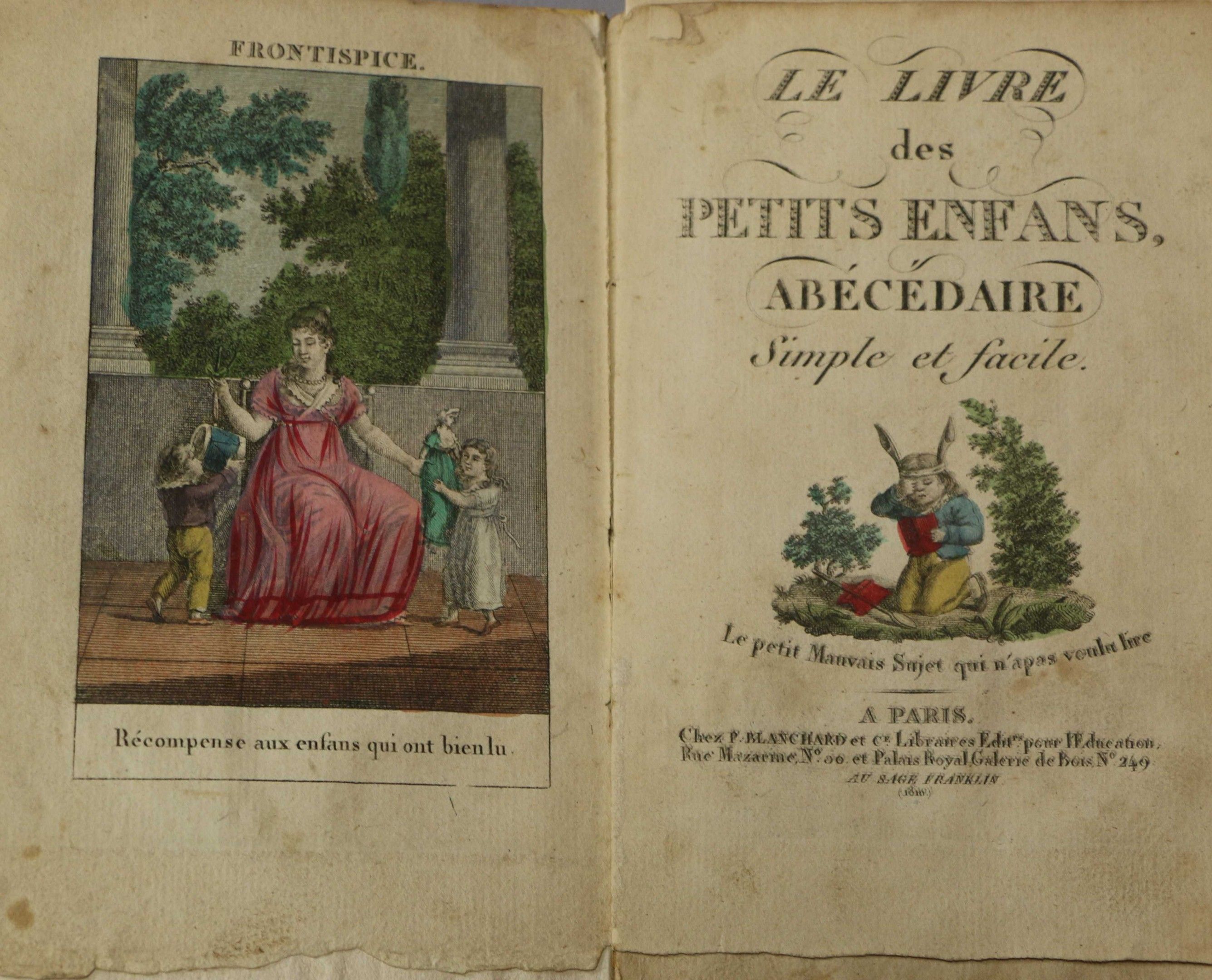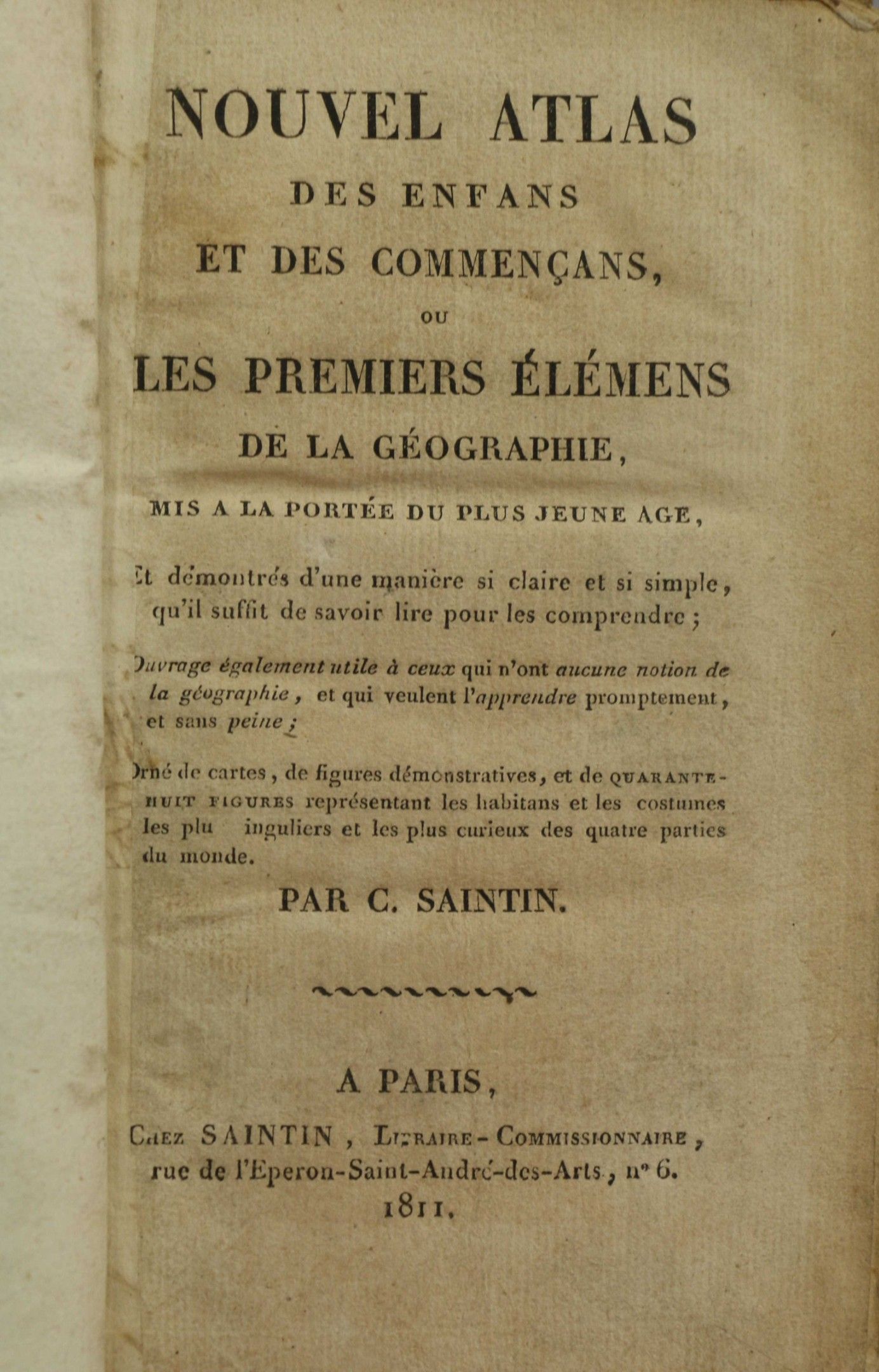 RIZZI-ZANNONI. Atlas géographique et militaire ou théâtre de la guerre présente en Allemagne. Paris, Balthard, s.d., in-12, marbled calf, ribbed spine. With a title, a faux-title, a general map and 16 coloured outline maps. Ex-libris Esse. - SAINTIN. Nouvel atlas des enfants et des commerçants ou les premiers éléments de la géographie. Paris, Sauntin, 1811, in-12, flowered boards. With 5 maps and 4 plates. - LE LIVRE des petits enfants, simple and easy primer. Paris, Blanchard, 1811, in-12, floral paper boards. With a coloured frontispiece and 4 coloured plates.