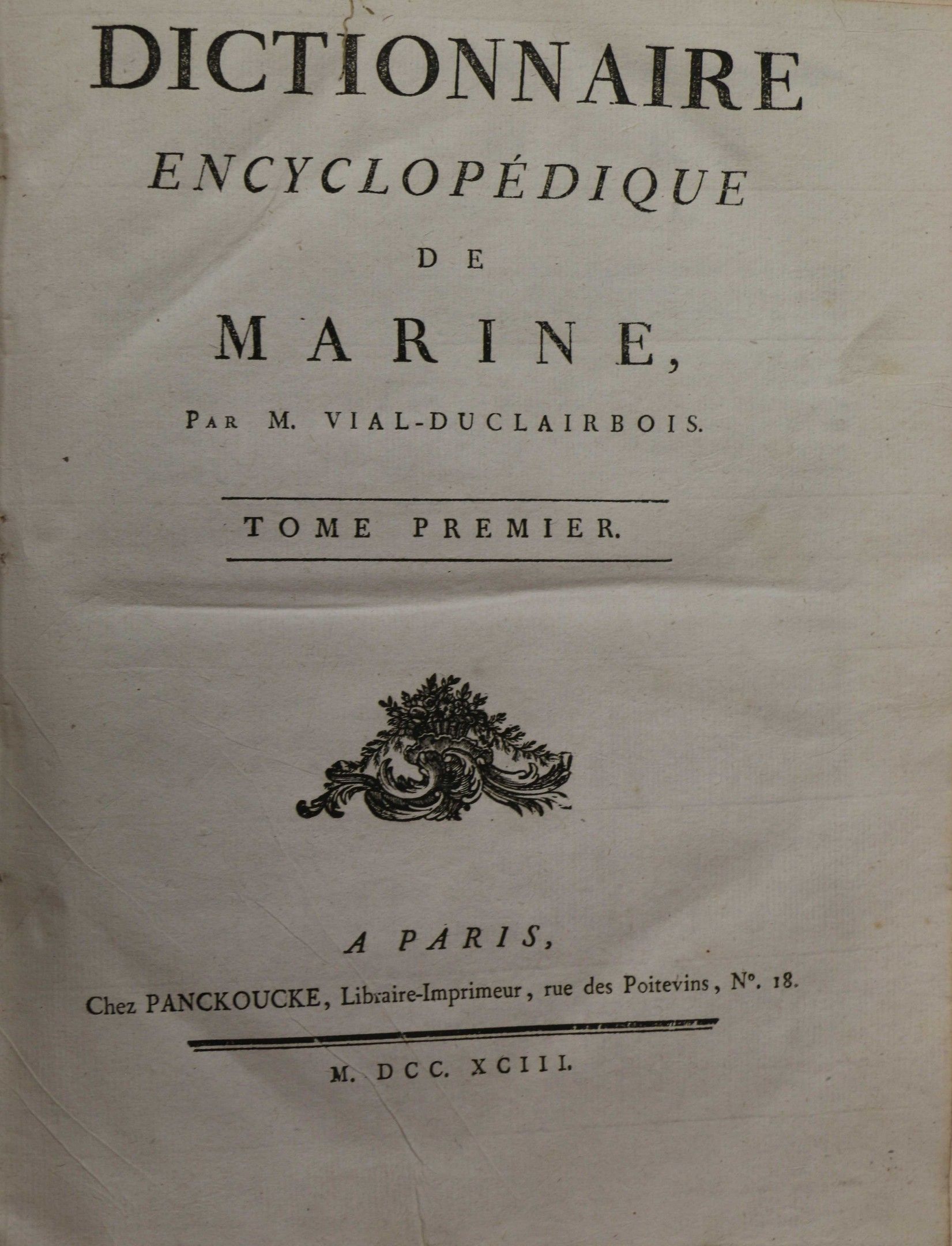 VIAL-DUCLAIRBOIS. Dictionnaire encyclopédique de marine. Paris, Panckoucke, 1793, 3 vol. in-4, marbled calf, ribbed spine (worn binding, missing title-piece on spine). Without the atlas.