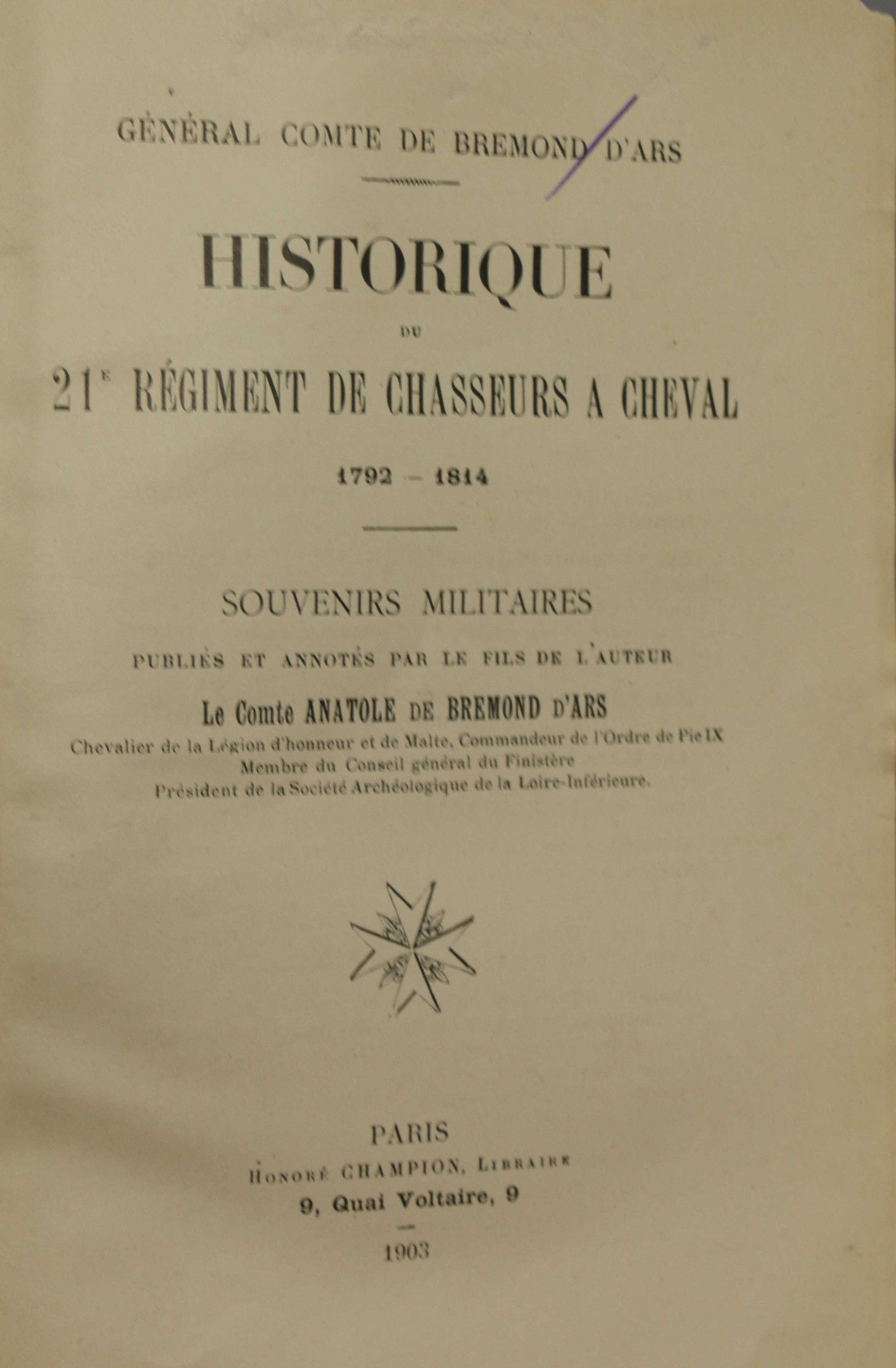 BREMOND D'ARS (Cte Anatole de). Historique du 21e régiment de chasseurs à cheval. 1792-1814. Paris, Champion, 1903, in-8, black half calf, ribbed spine (modern binding). FIRST EDITION.