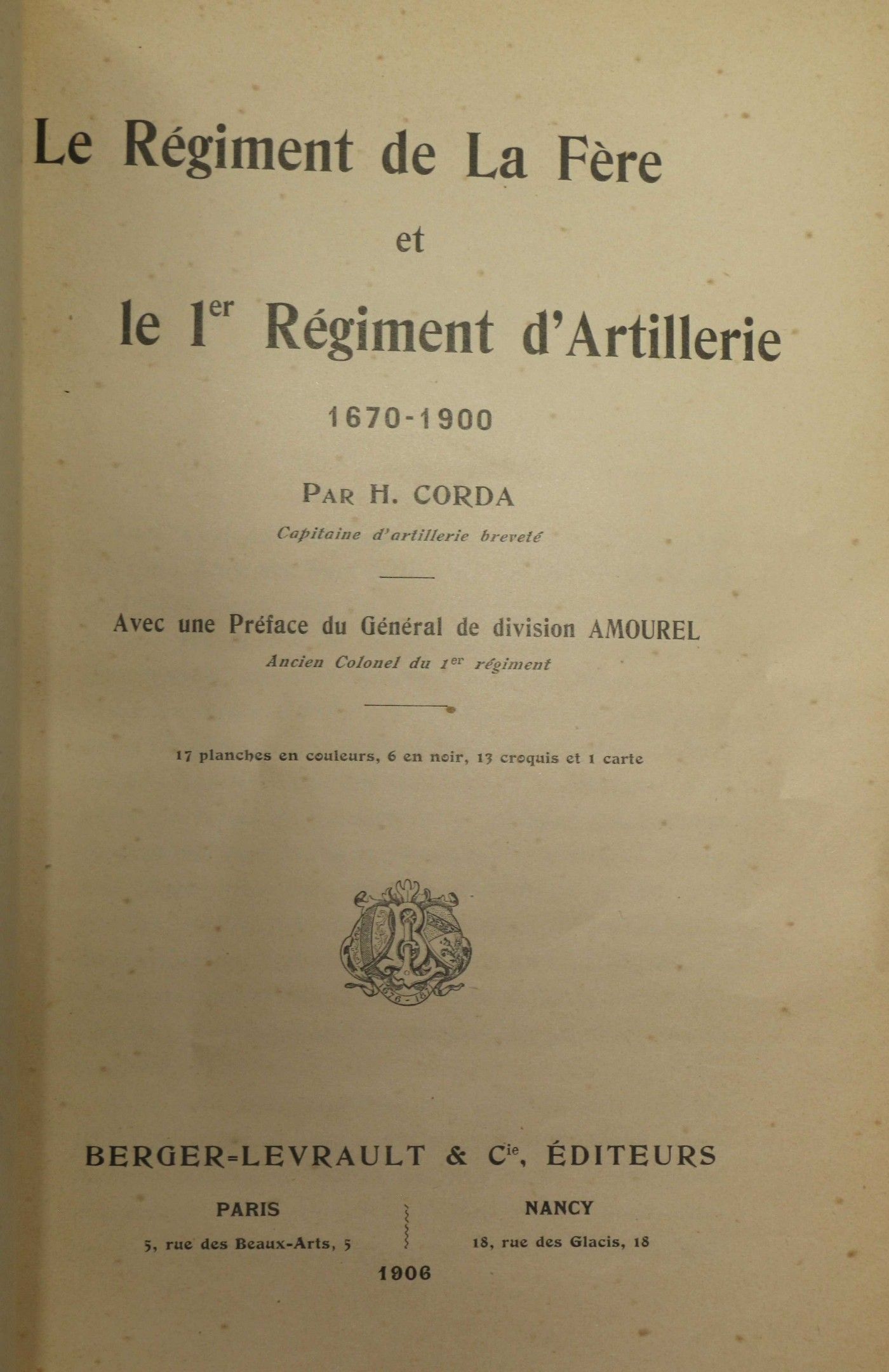 CORDA (H.). The La Fère Regiment and the 1st Artillery Regiment. 1670-1900. Paris, Berger-Levrault, 1906, gd. In-8, full mar. Bleu marine janséniste, spine ribbed, cover and spine preserved (rel. mod.). With 17 plates in colour, 6 in black, 13 sketches and a map.