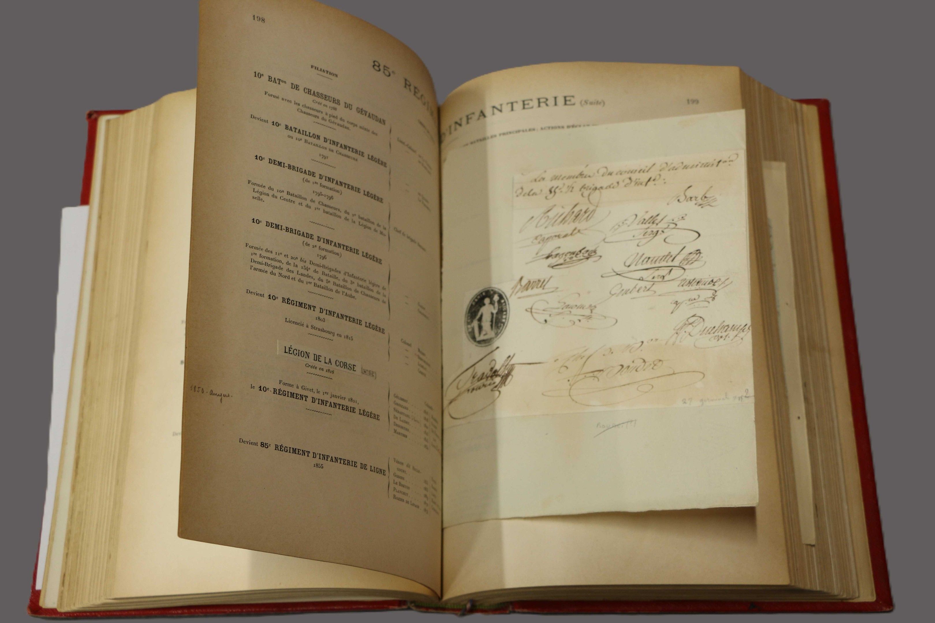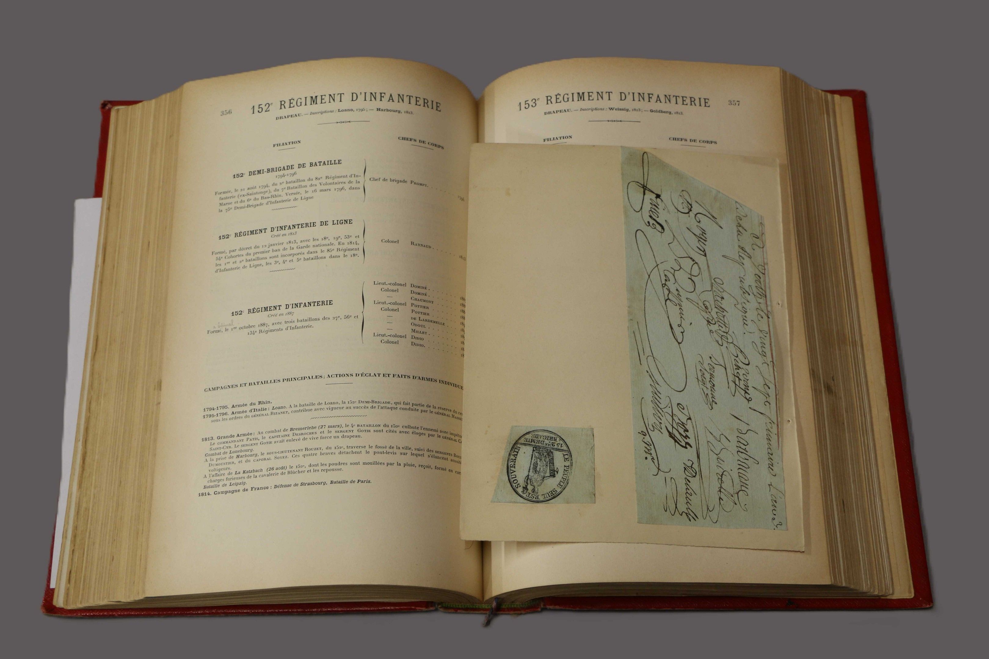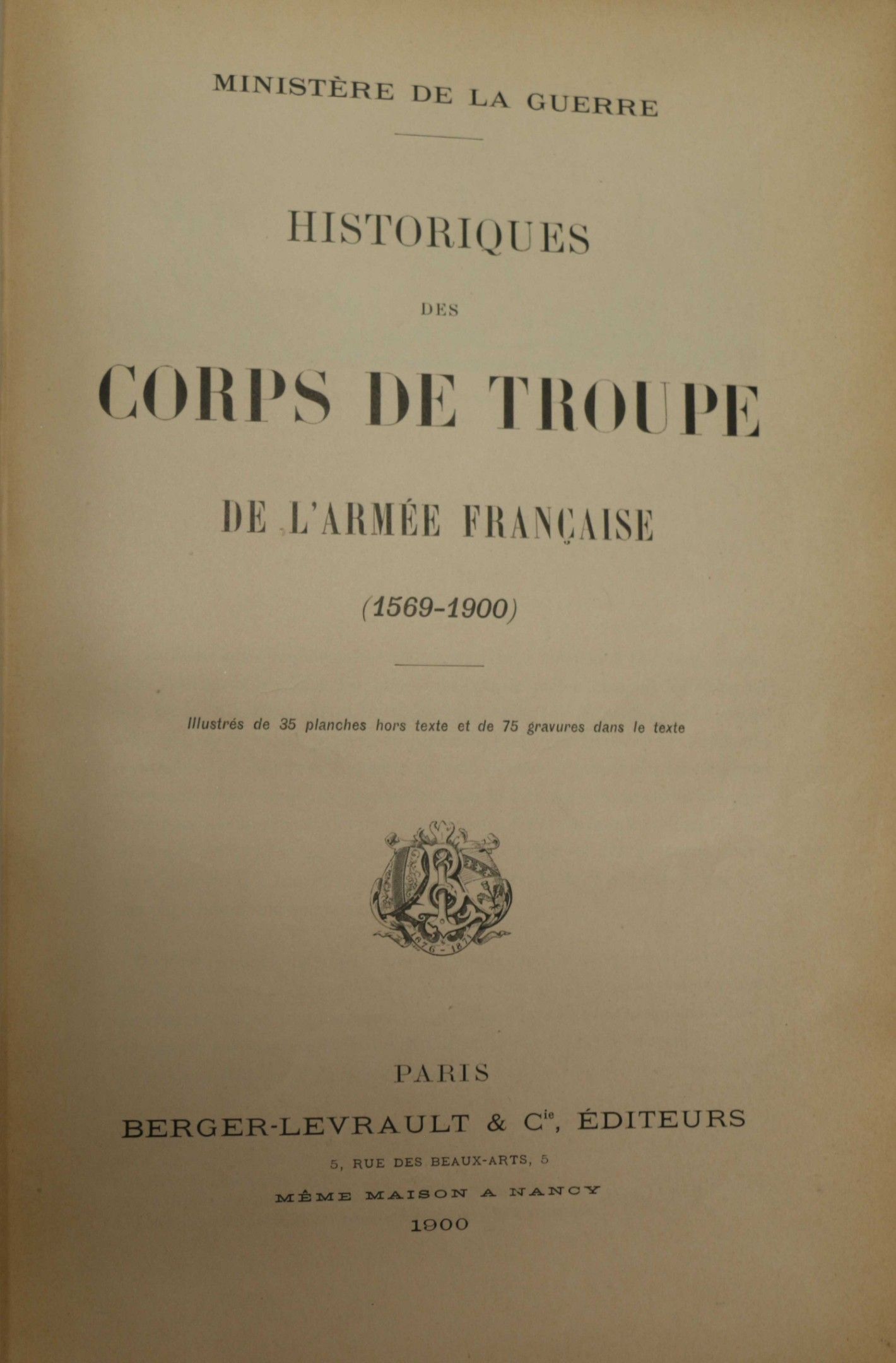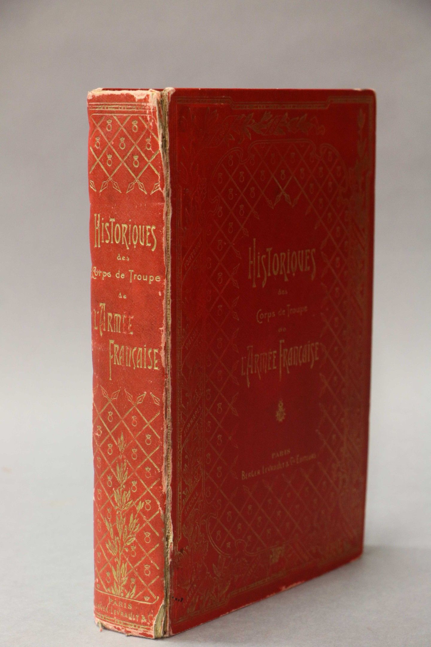 HISTORICALS OF THE TROOPS OF THE FRENCH ARMY. (1569-1900). Paris, Berger-Levrault, 1900, large vol. in-4, publisher's red percal. cart. Red of the publisher, gilt tr. (worn binding). Illustrated. Attached loose documents.