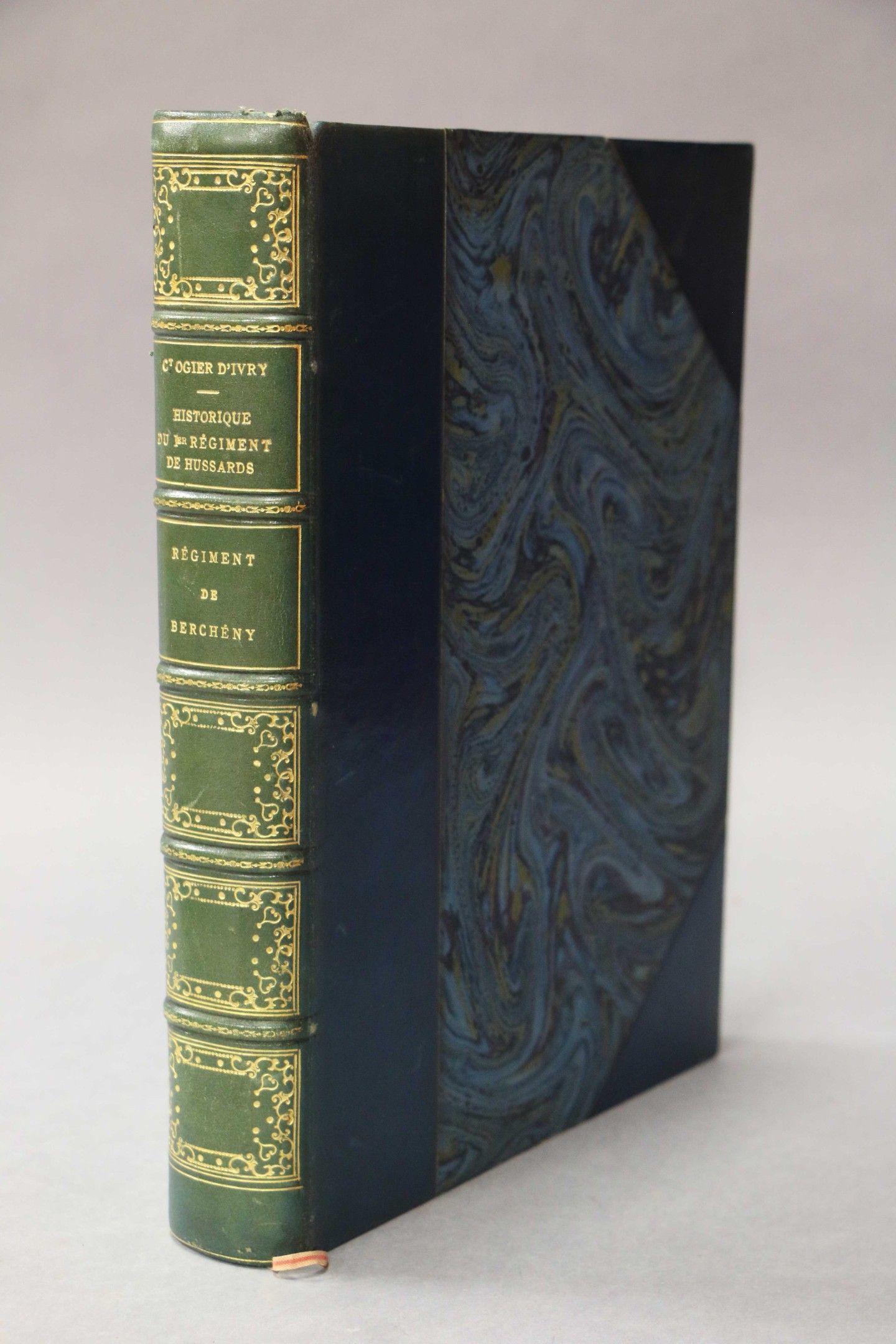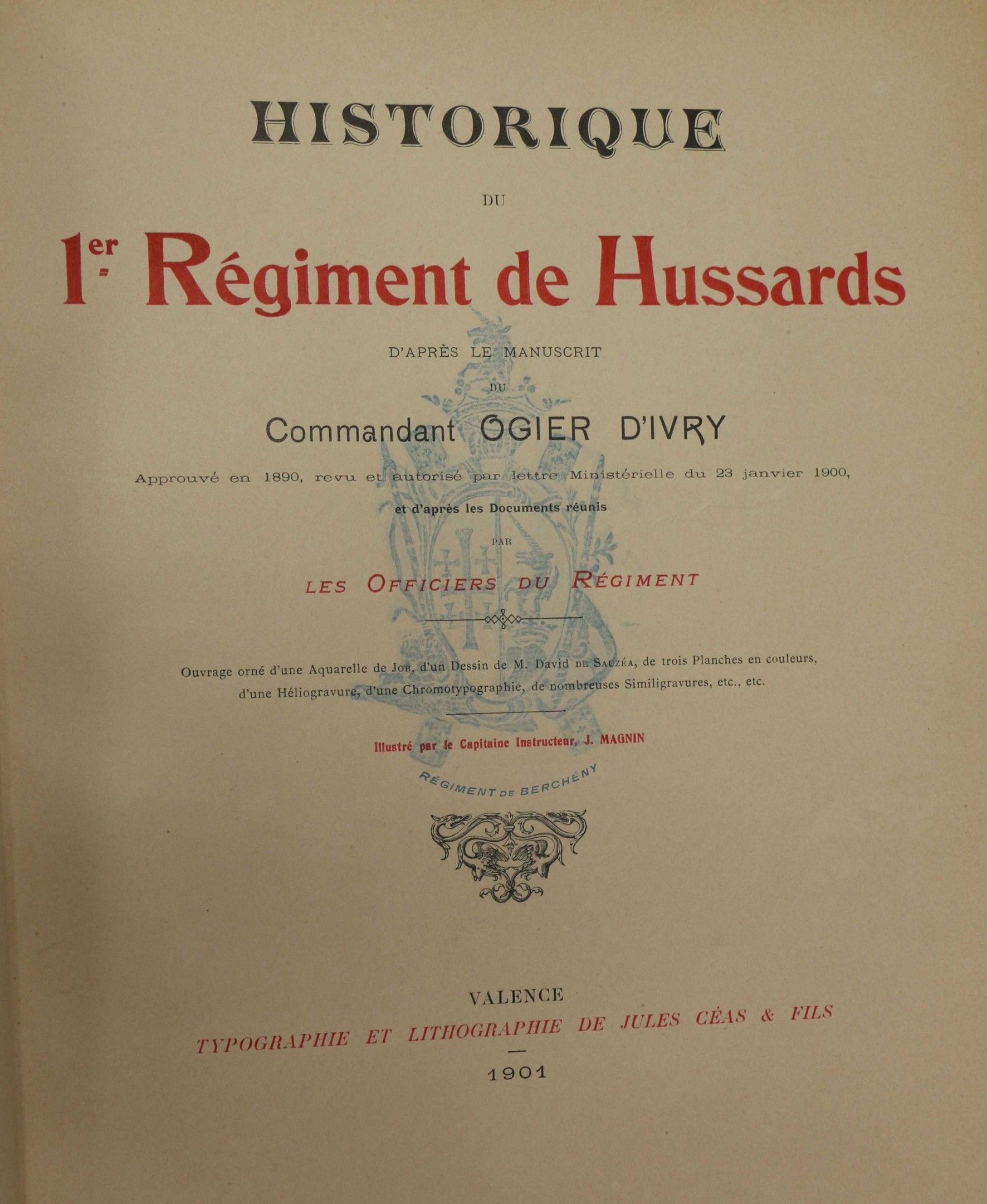 OGIER D'IVRY HISTORIQUE DU 1er REGIMENT DE HUSSARDS. Valence, Céas & fils, 1901, large vol. in-4, half-rel. with light blue chag. corners, ribbed spine, richly decorated and sunned, covers preserved. Numerous plates hors-texte including 4 in colour. Ex-libris Comte de Bourqueney. One of 500 numbered copies on Alfa paper. Sporadic spotting.