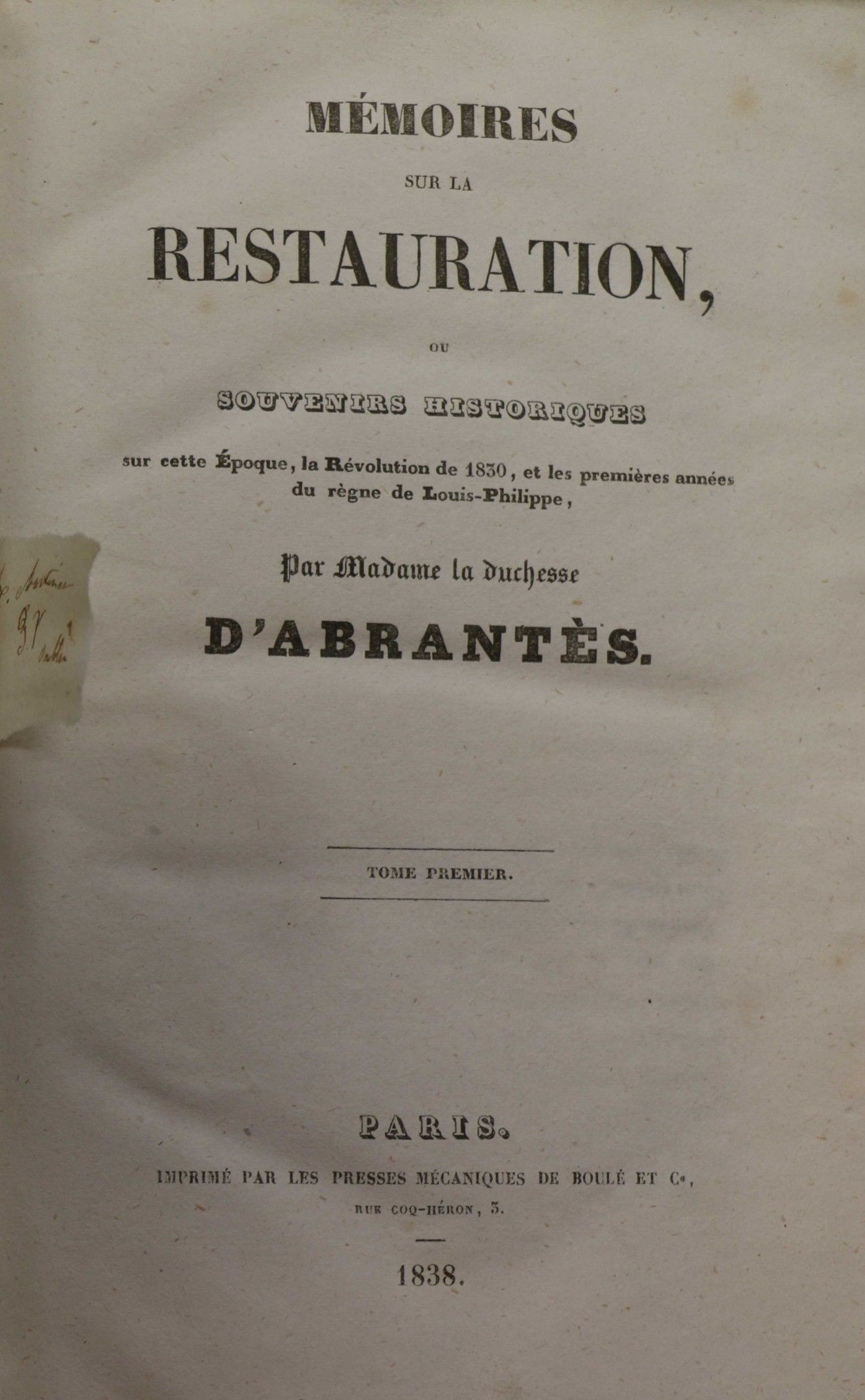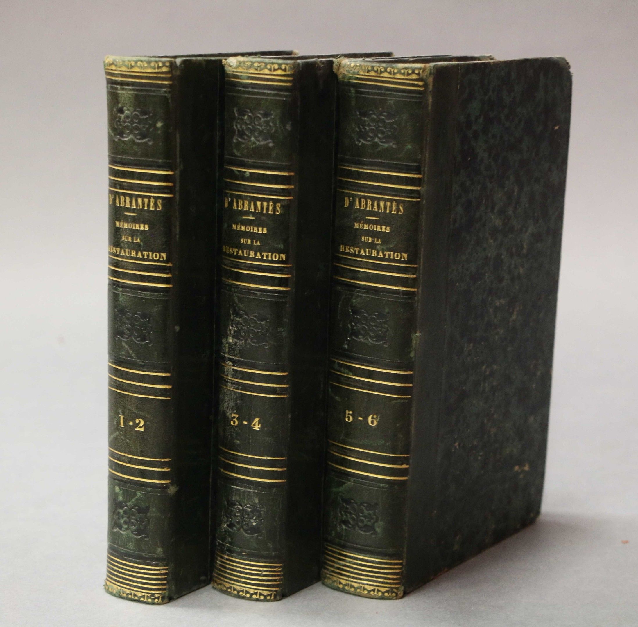 ABRANTES (Duchess D'). Mémoires sur la Restauration ou souvenirs historiques sur cette époque, la Révolution de 1830 et les premières années du règne de Louis-Philippe. Paris, Boulé, 1838, 6 volumes bound in 3 vol. in-8, green bas. half-rel., smooth spine, ornamented.