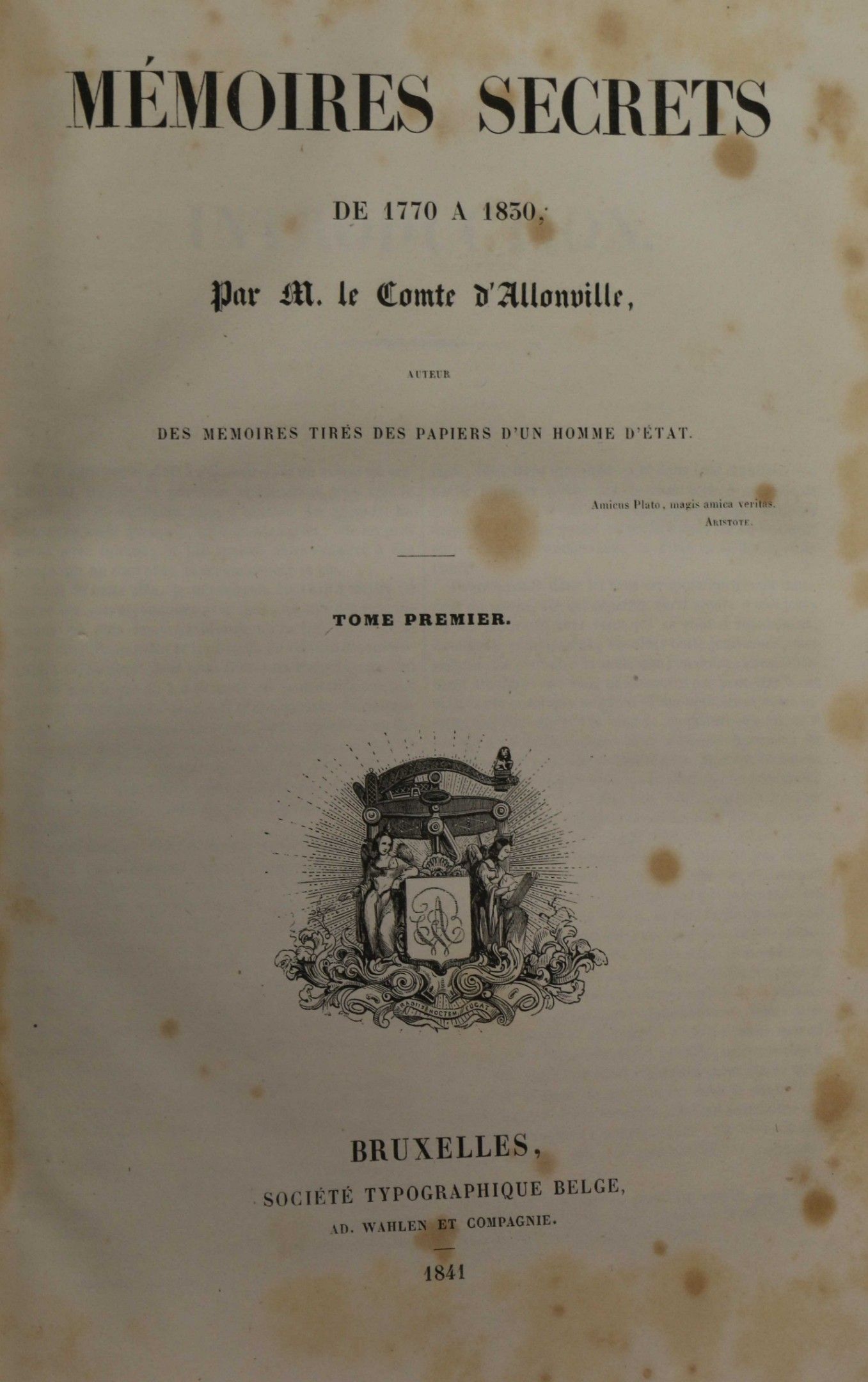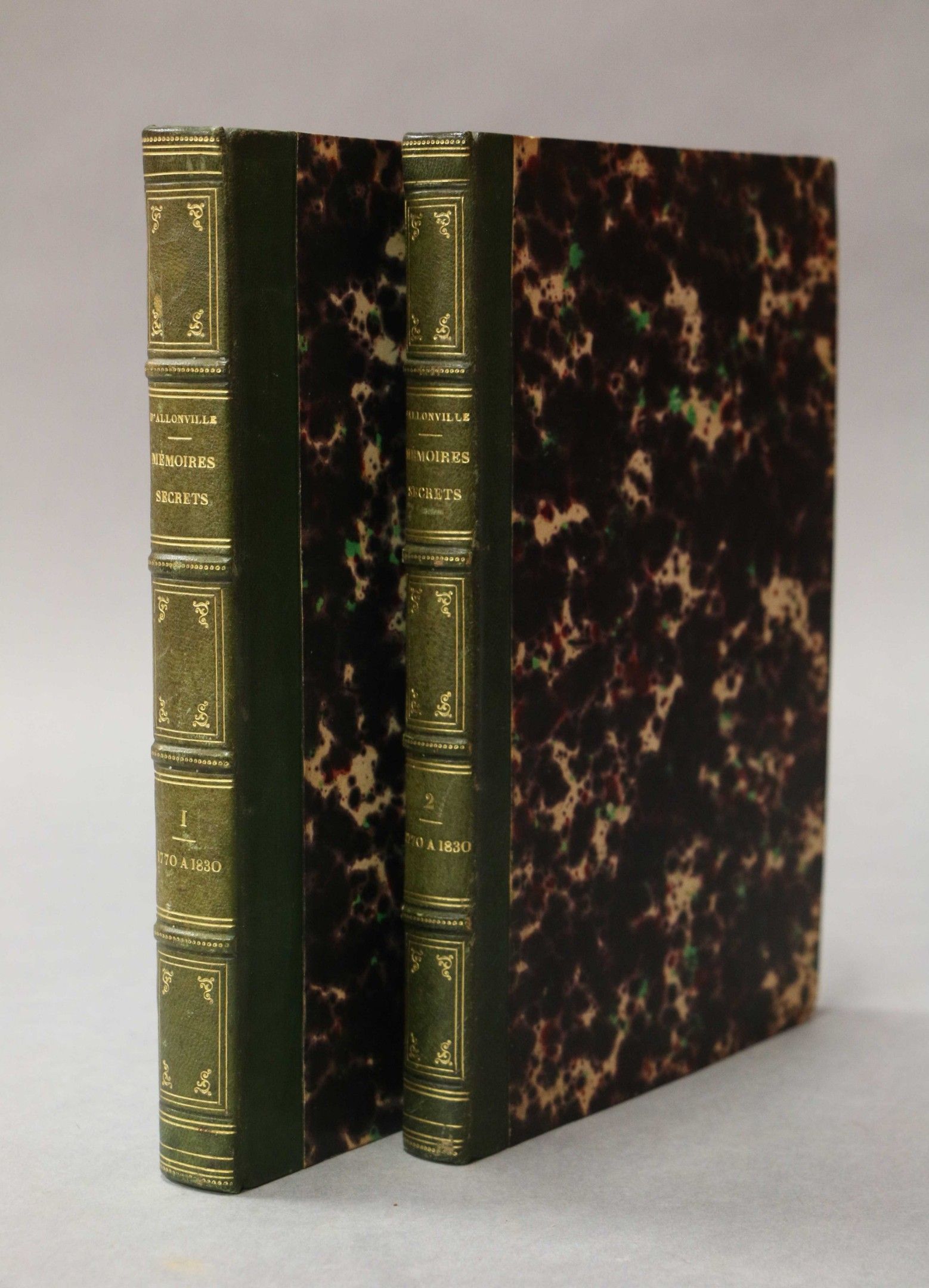 ALLONVILLE (Cte D'). Secret memoirs from 1770 to 1830. Brussels, Société typographique belge, 1841, 2 vol. gd. in-8, half-rel. green chag., spines ribbed, decorated (contemporary binding). Heavy spotting and freckling.