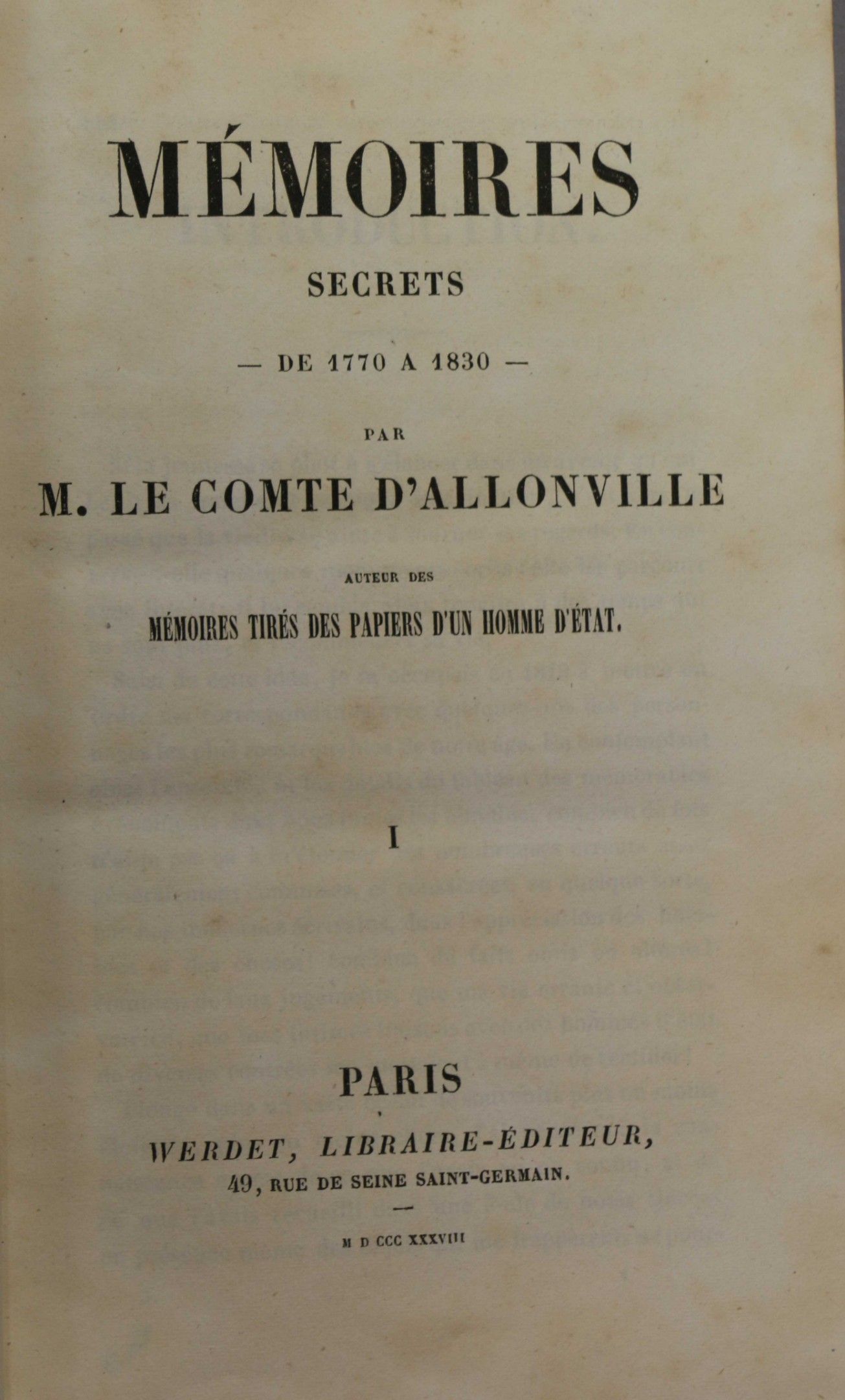 ALLONVILLE (Cte D'). Secret memoirs from 1770 to 1830. Paris, Werdet, 1838-1841, 5 vol. in-8, half calf with corners, glazed fawn calf, spine ribbed, richly decorated, black title page (contemporary binding). Some scattered foxing.