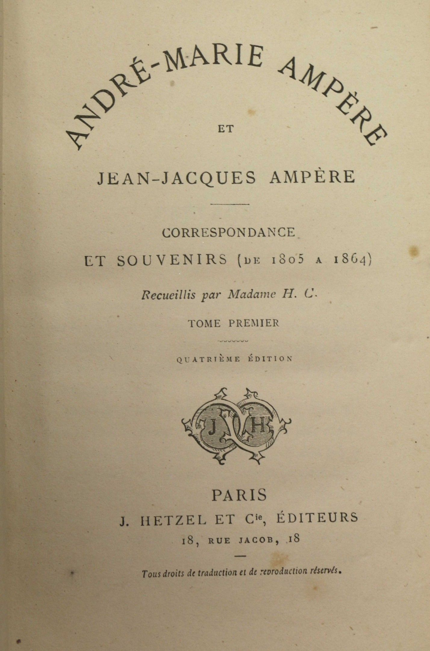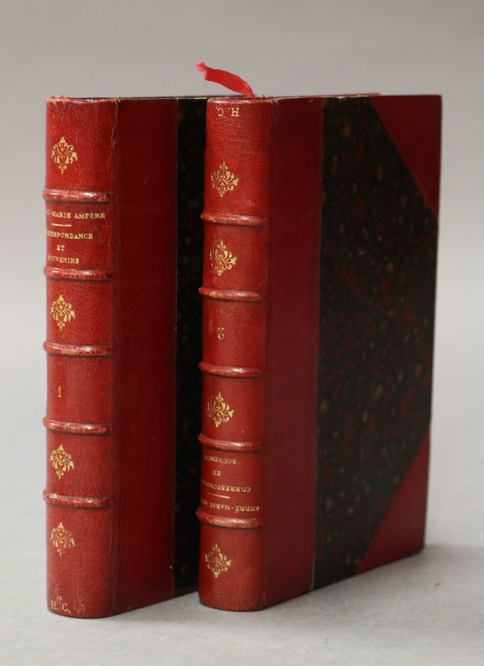 AMPERE (André-Marie) and AMPERE (Jean-Jacques). Correspondence and souvenirs from 1803 to 1864. Paris, Heztel, s.d., 2 vol. in-12, half-rel. with red chag. corners, spine ribbed.