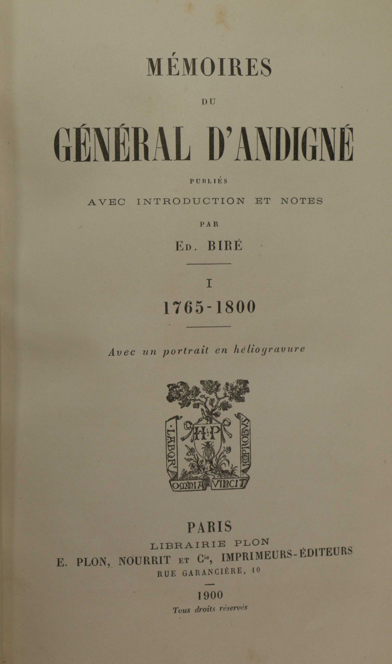 ANDIGNE (General d'). Memoirs of General d'Andigné. 1765-1857. Paris, Plon, 1900-1901, 2 vol. in-8, half calf chag. fawn, spine ribbed (binding slightly different). With 2 frontispieces.