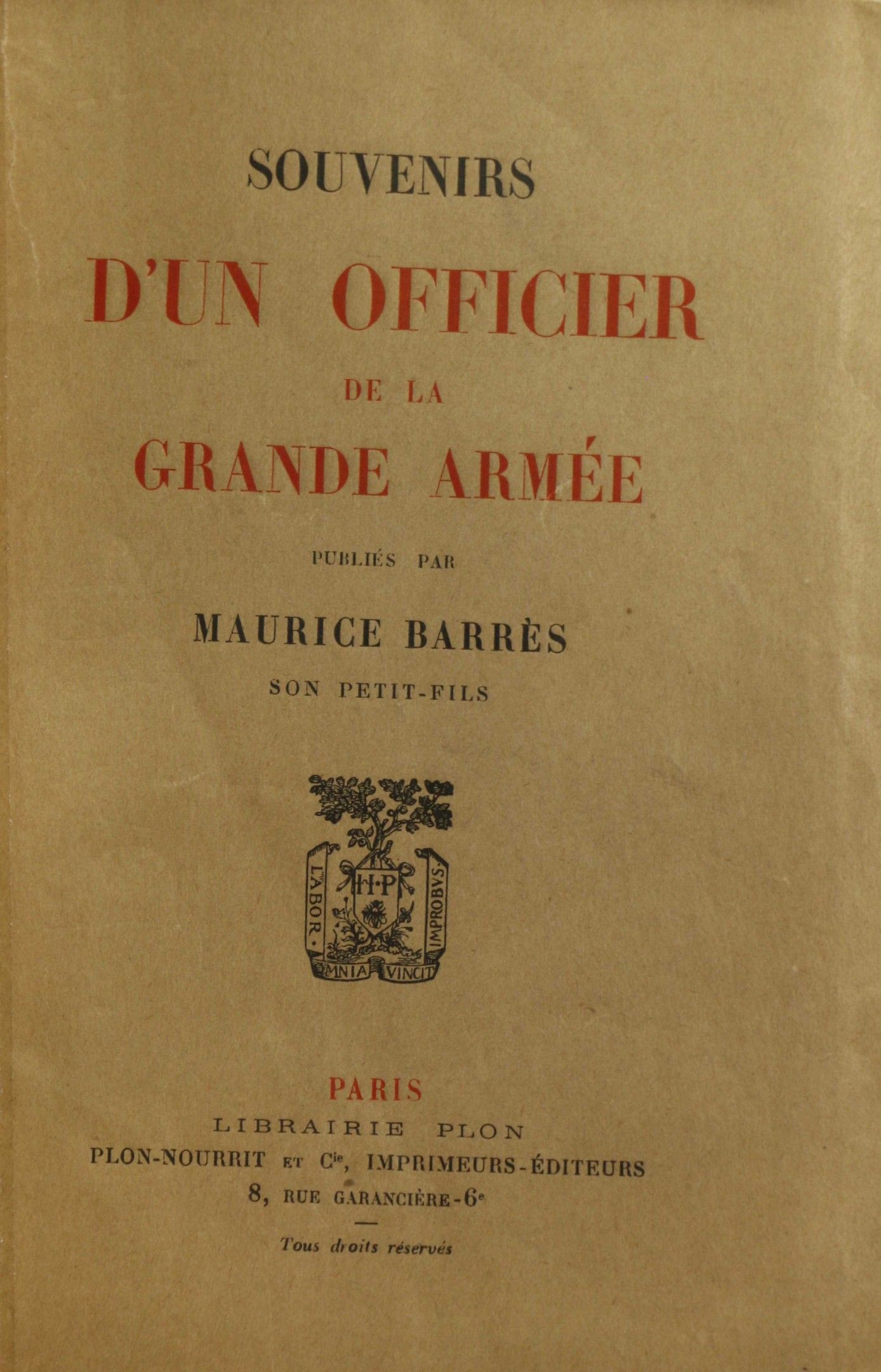 BARRES (Maurice). Souvenirs d'un officier de la grande armée. Paris, Plon, s.d., in-8, full red chag. with gilt eagles in the centre, spine ribbed, richly illustrated, cover preserved (mod. rel.). One of 20 copies on China paper (n°13).