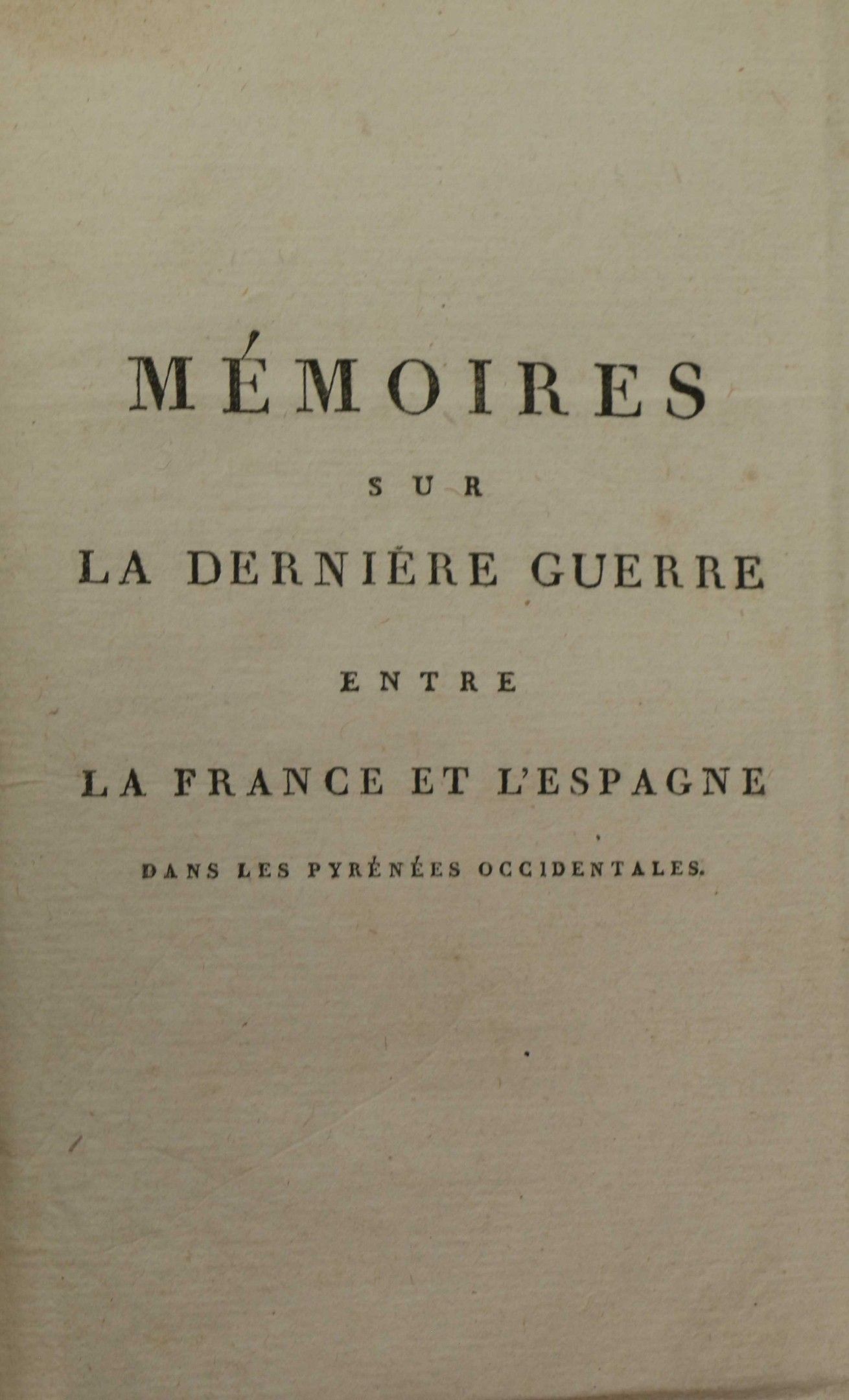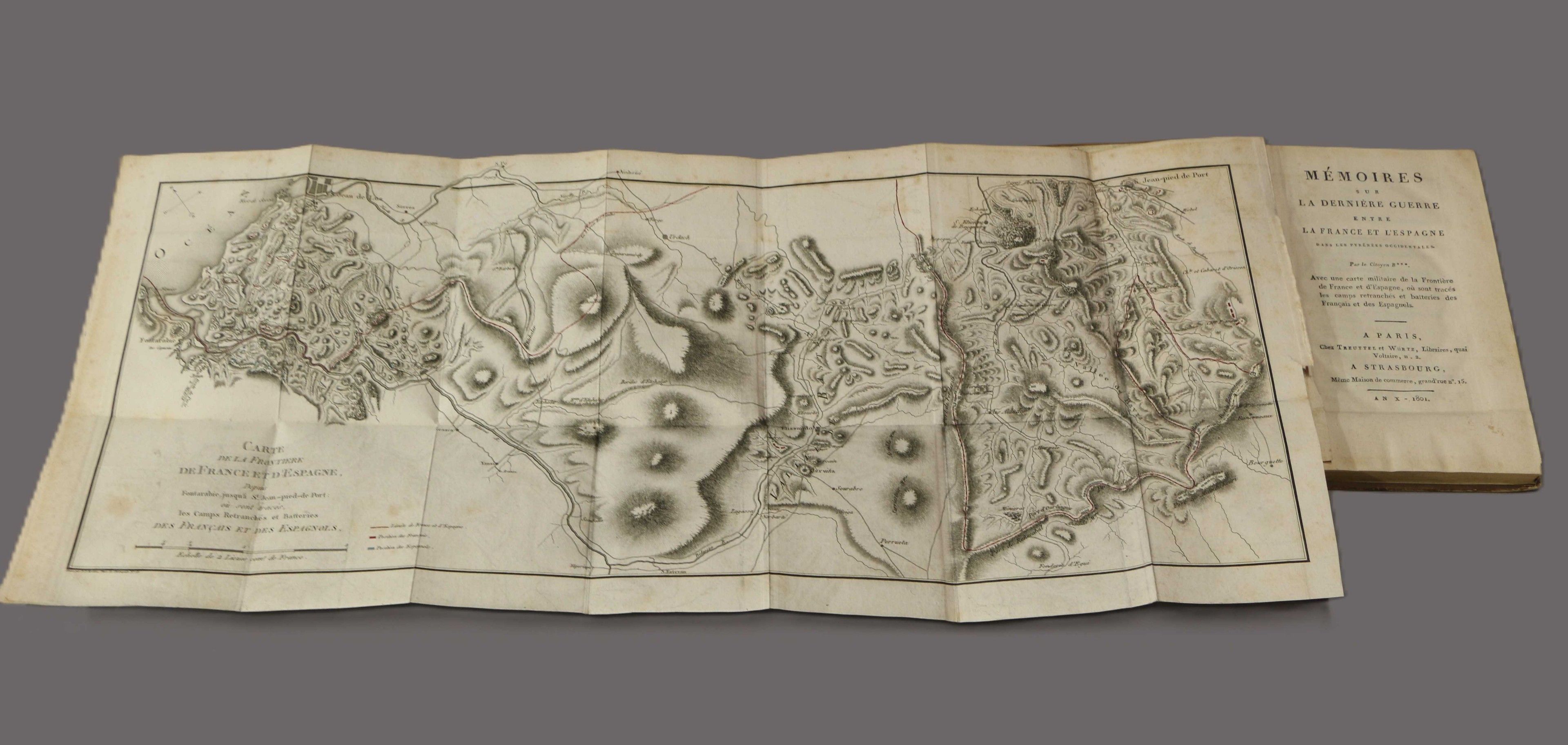 BAULAC. Mémoires sur la dernière guerre entre la France et l'Espagne dans les Pyrénées occidentales. Paris, Treuttel et Würtz, An X- 1801, in-8, half-rel. bas. fawn, inscription on a red mar. label on the 1st plate general of cavalry Lasalle . FIRST EDITION. With a military map.