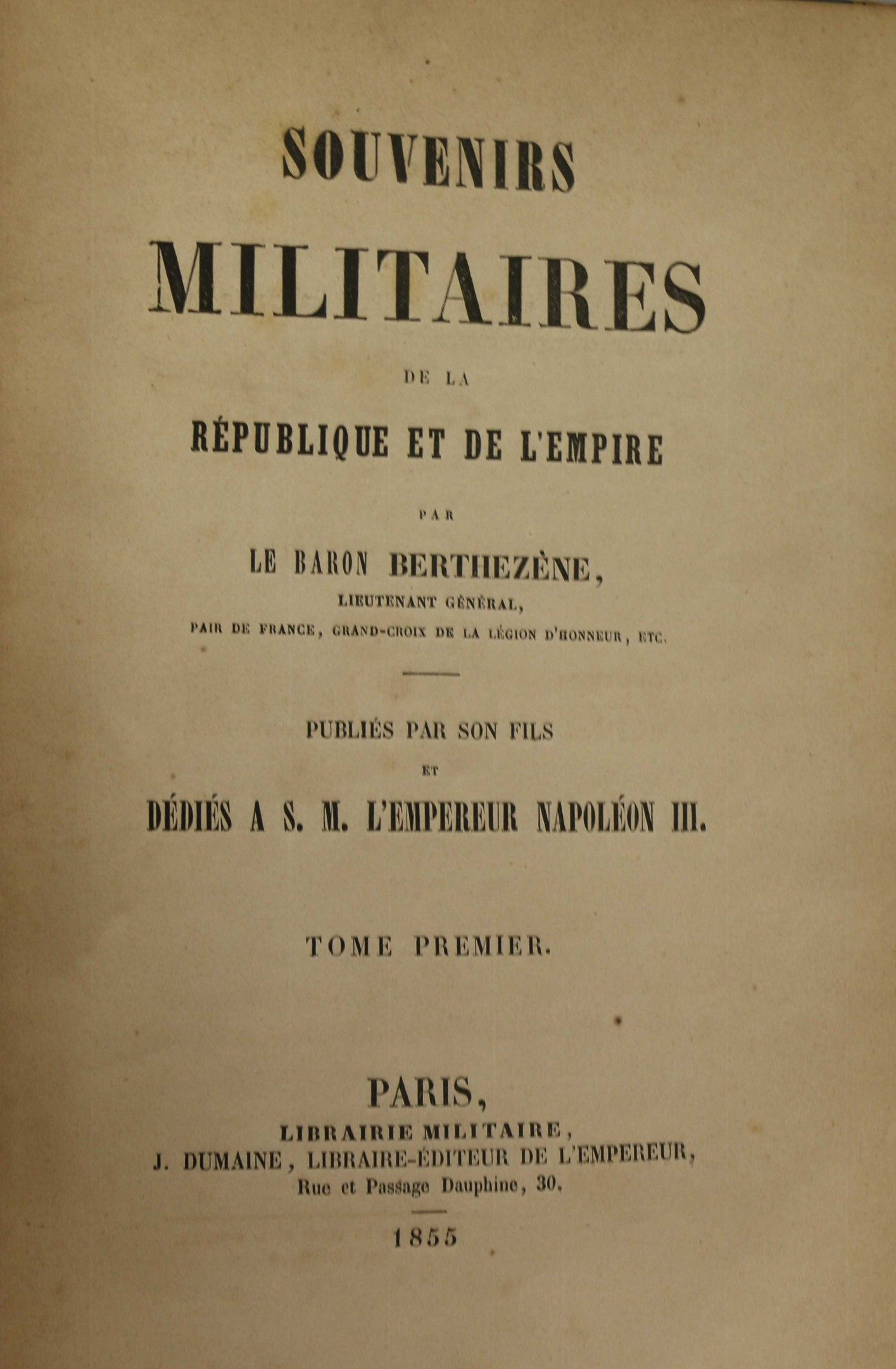 BERTHEZENE (Baron). Souvenirs militaires de la République et de l'Empire. Paris, Dumaine, 1855, 2 vol. in-8, green half calf, smooth spine (worn binding). FIRST EDITION. With a portrait. Browning.