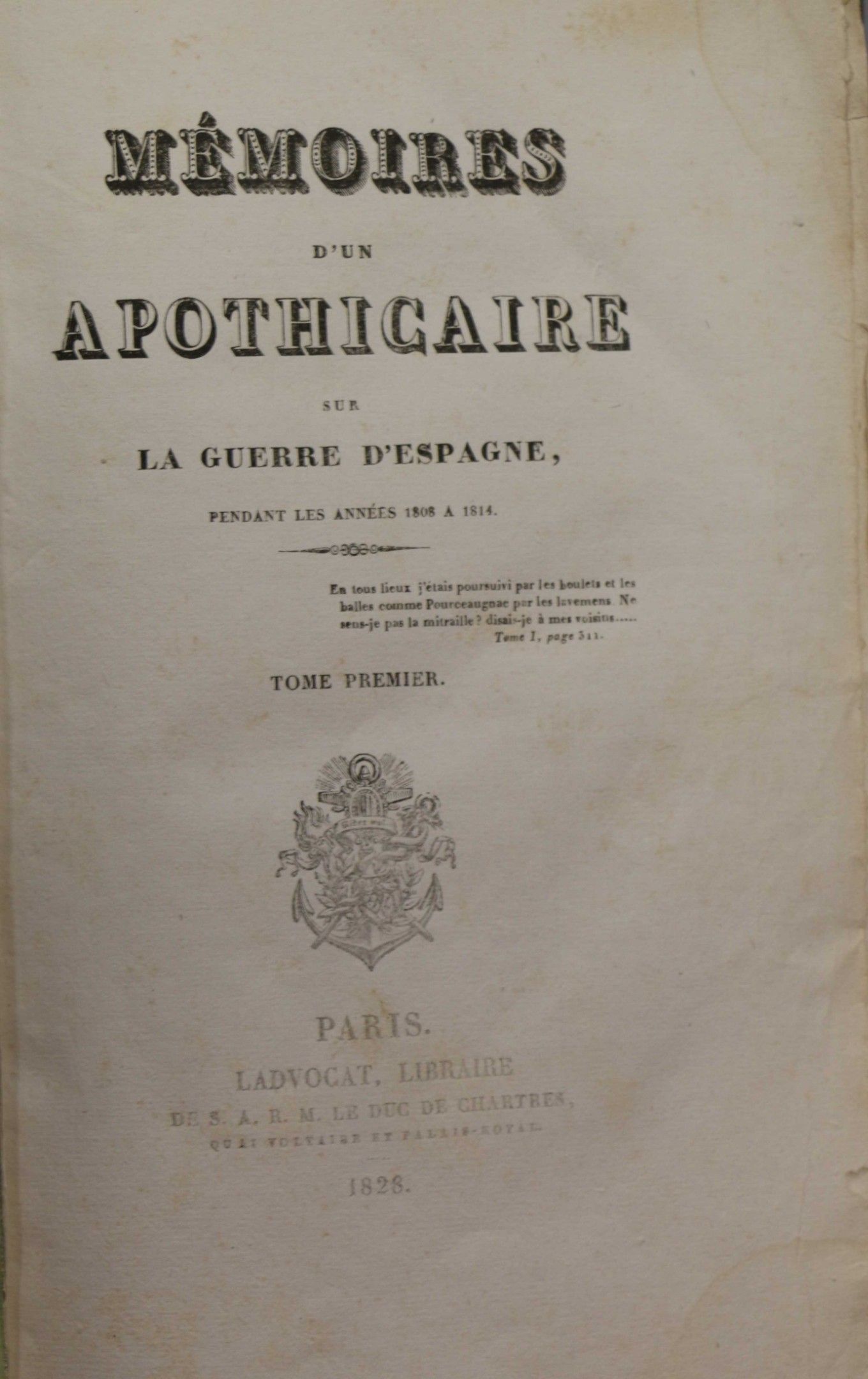BLAZE (Sébastien) Mémoires d'un apothicaire sur la guerre d'Espagne pendant les années 1808 à 1814. Paris, Ladvocat, 1828, 2 vol. in-8, half calf green chag., spine ribbed, browned (mod. rel.). FIRST EDITION. The page of volume 1 is a little worn (facsimile).
