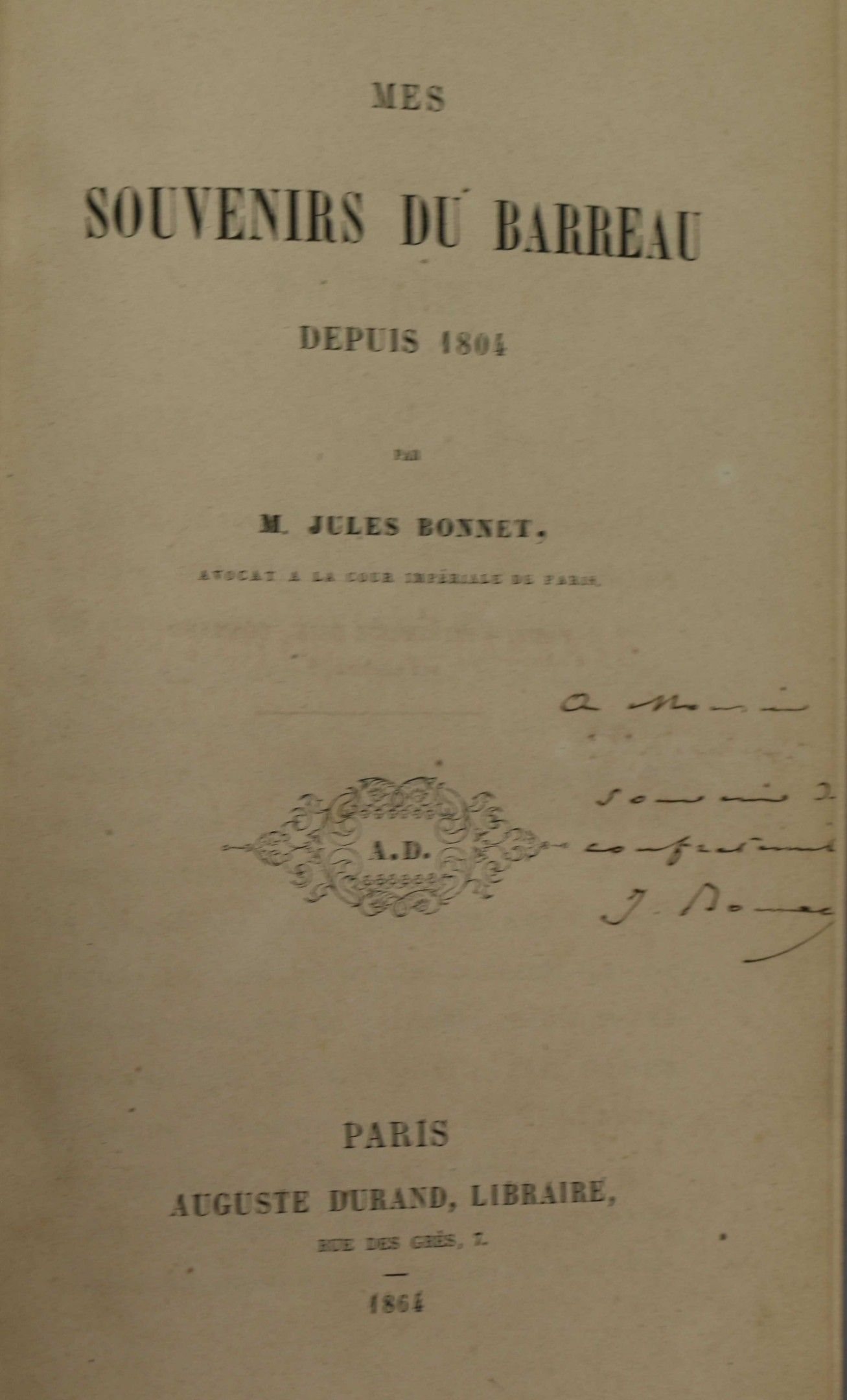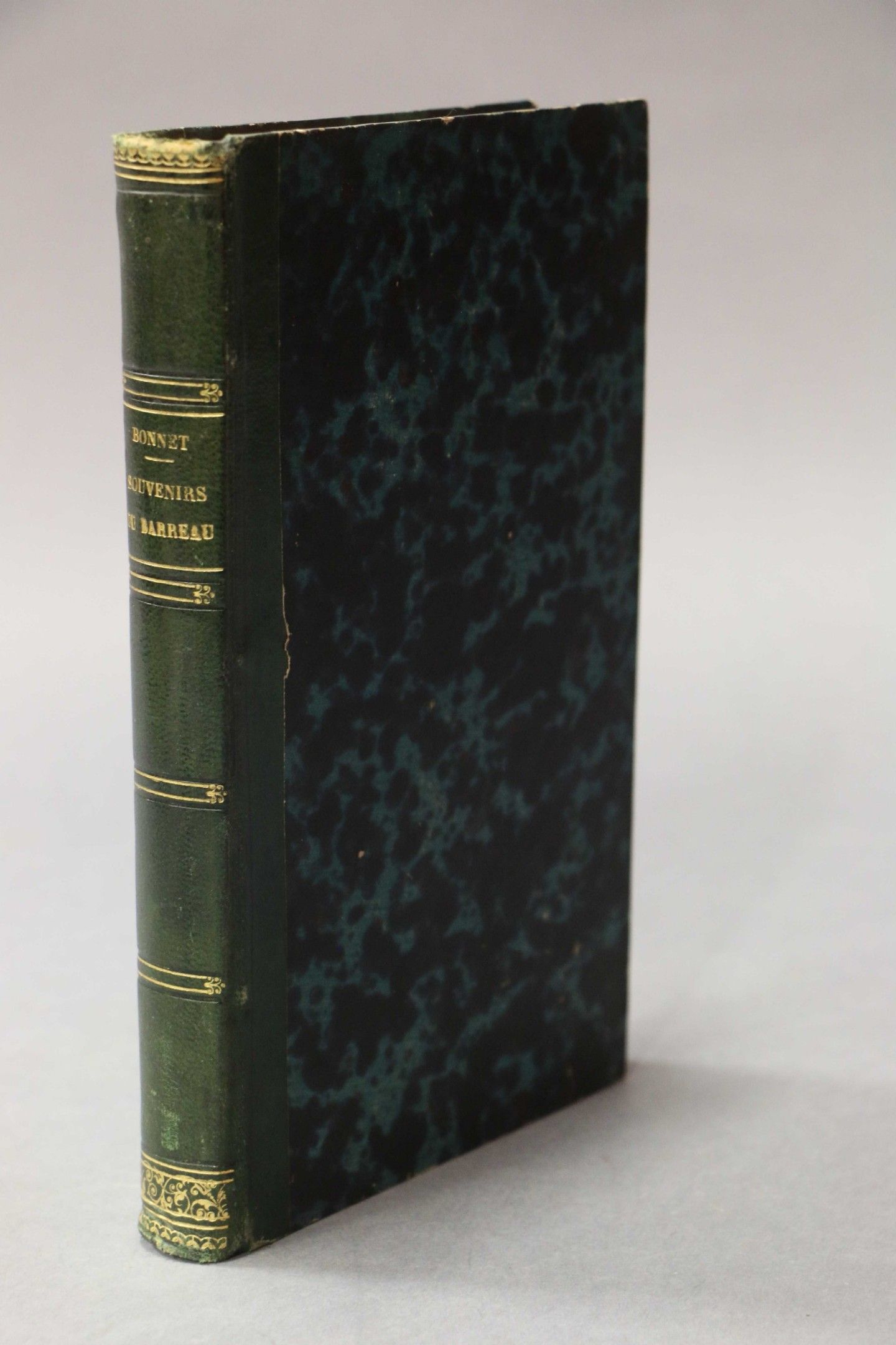 BONNET (Jules). Mes souvenirs du barreau depuis 1804. Paris, Durand, 1864, in-8, green bas. half-rel., smooth spine, decorated. Letter from the author on the title.