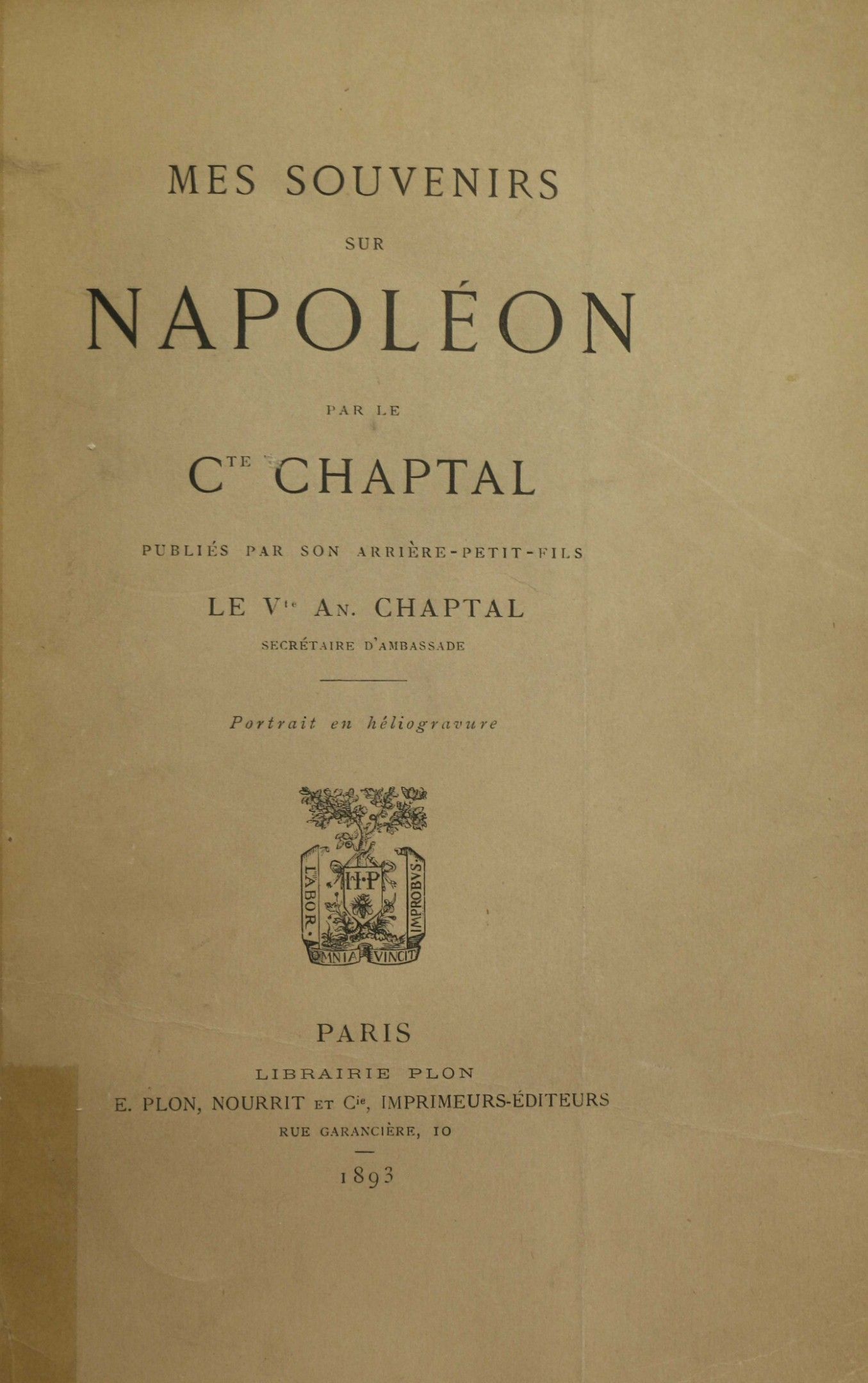 CHAPTAL (Cte). Mes souvenirs sur Napoléon. Paris, Plon, 1893, in-8, half-rel. red chag. spine, covers preserved (mod. rel.). With frontispiece portrait.