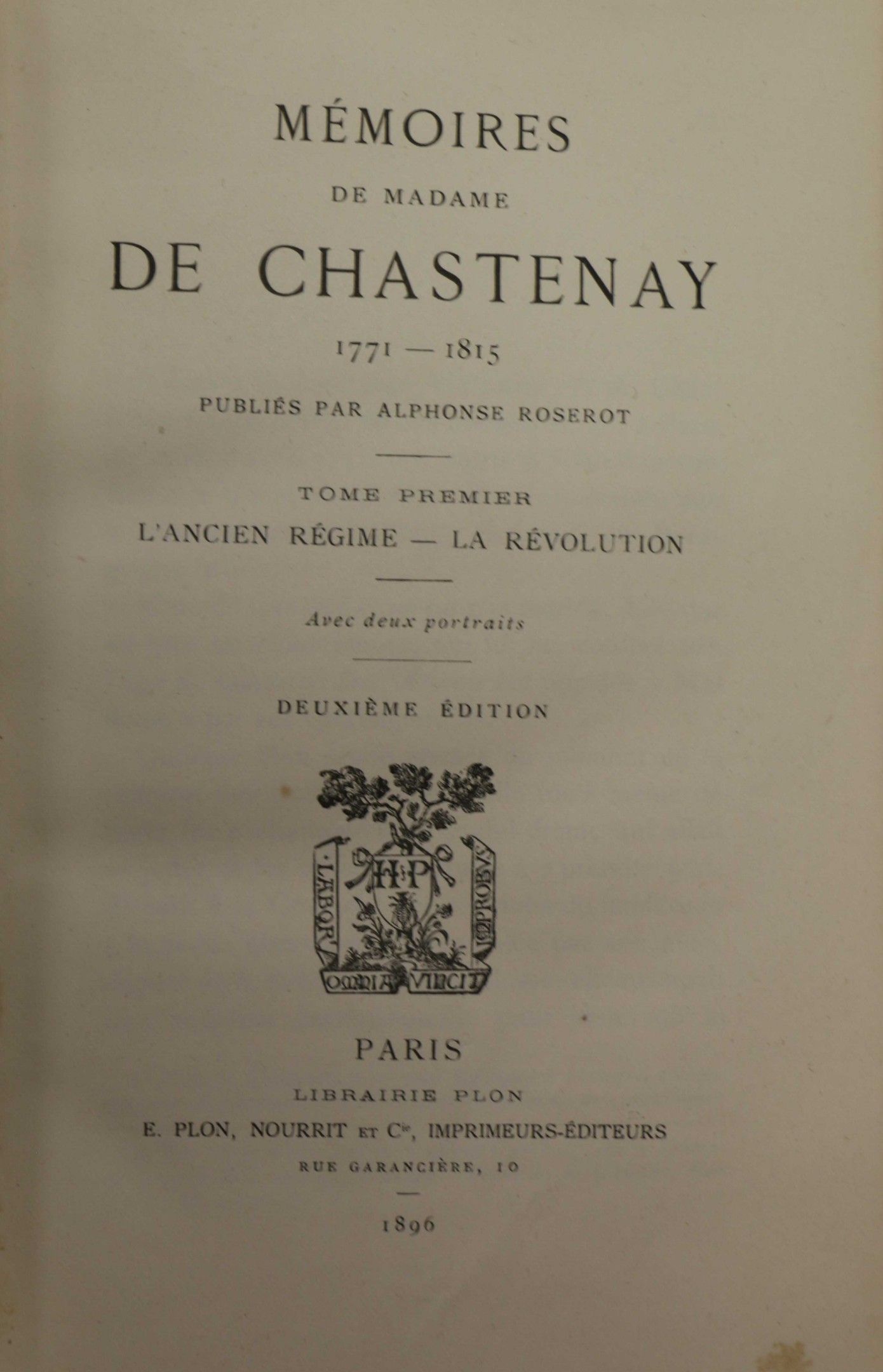 CHASTENAY (Mme de). Memoirs of Madame de Chastenay.1771-1815. Second edition. Paris, Plon, 1896, 2 vol. in-8, half brown chag., spine ribbed (bindings rubbed). With 2 portraits.