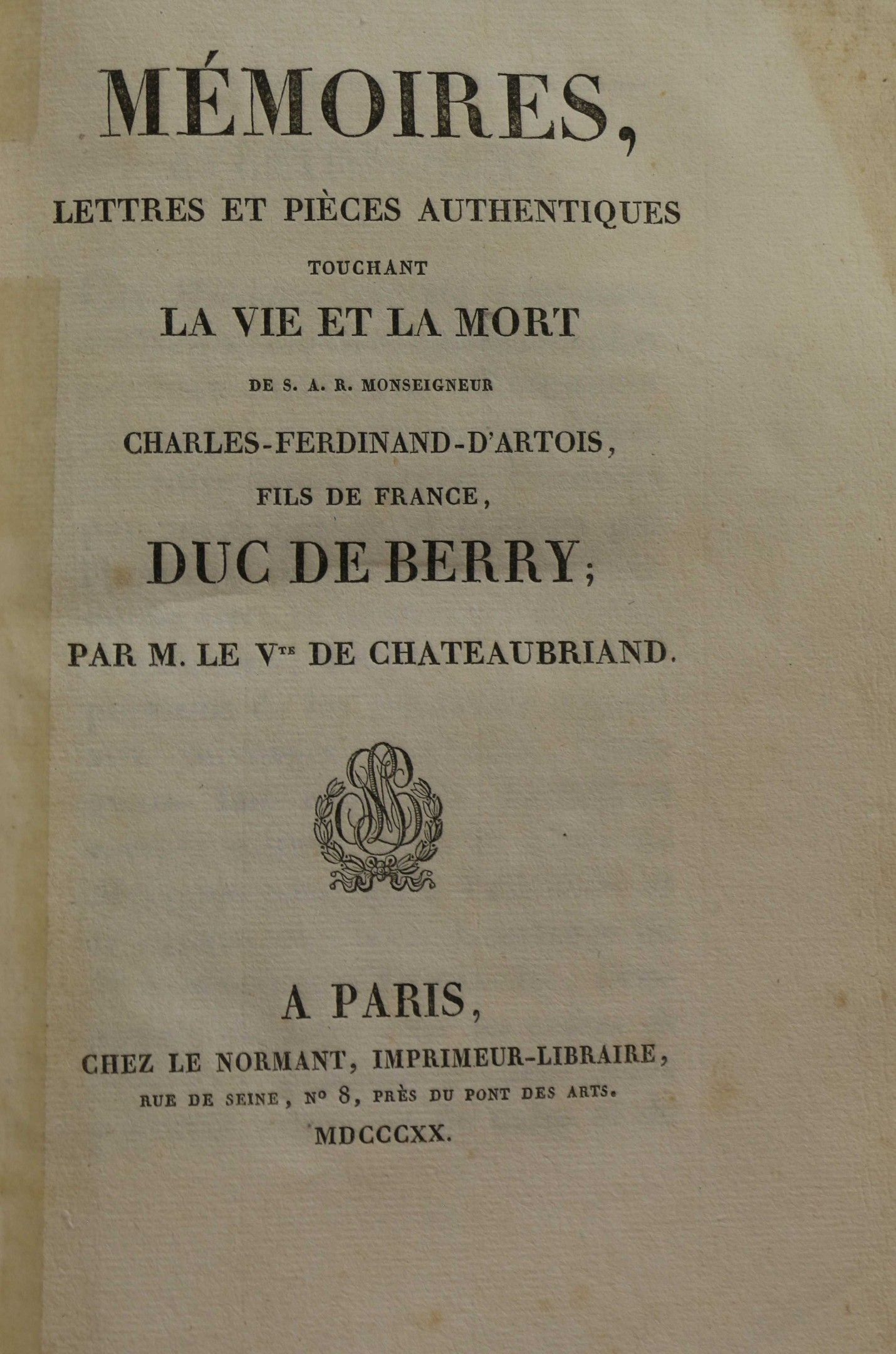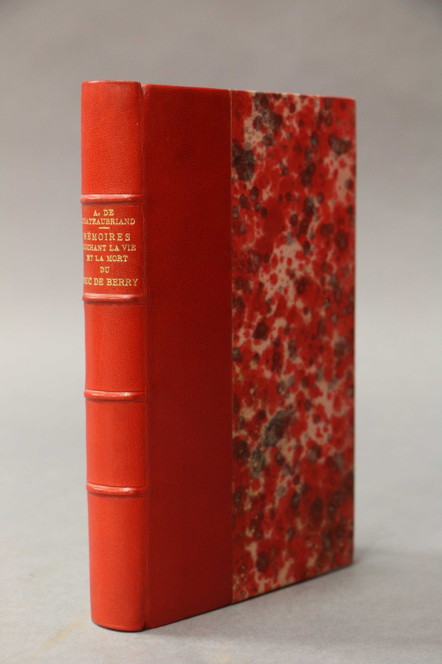 CHATEAUBRIAND (Cte de). Mémoires, lettres et pièces authentiques touchant la vie et la mort de S.A.R. monseigneur Charles-Ferdinand d'Artois, fils de France duc de Berry. Paris, Le Normant, 1820, in-8, half-rel. red chag. spine with nerves (modern binding).