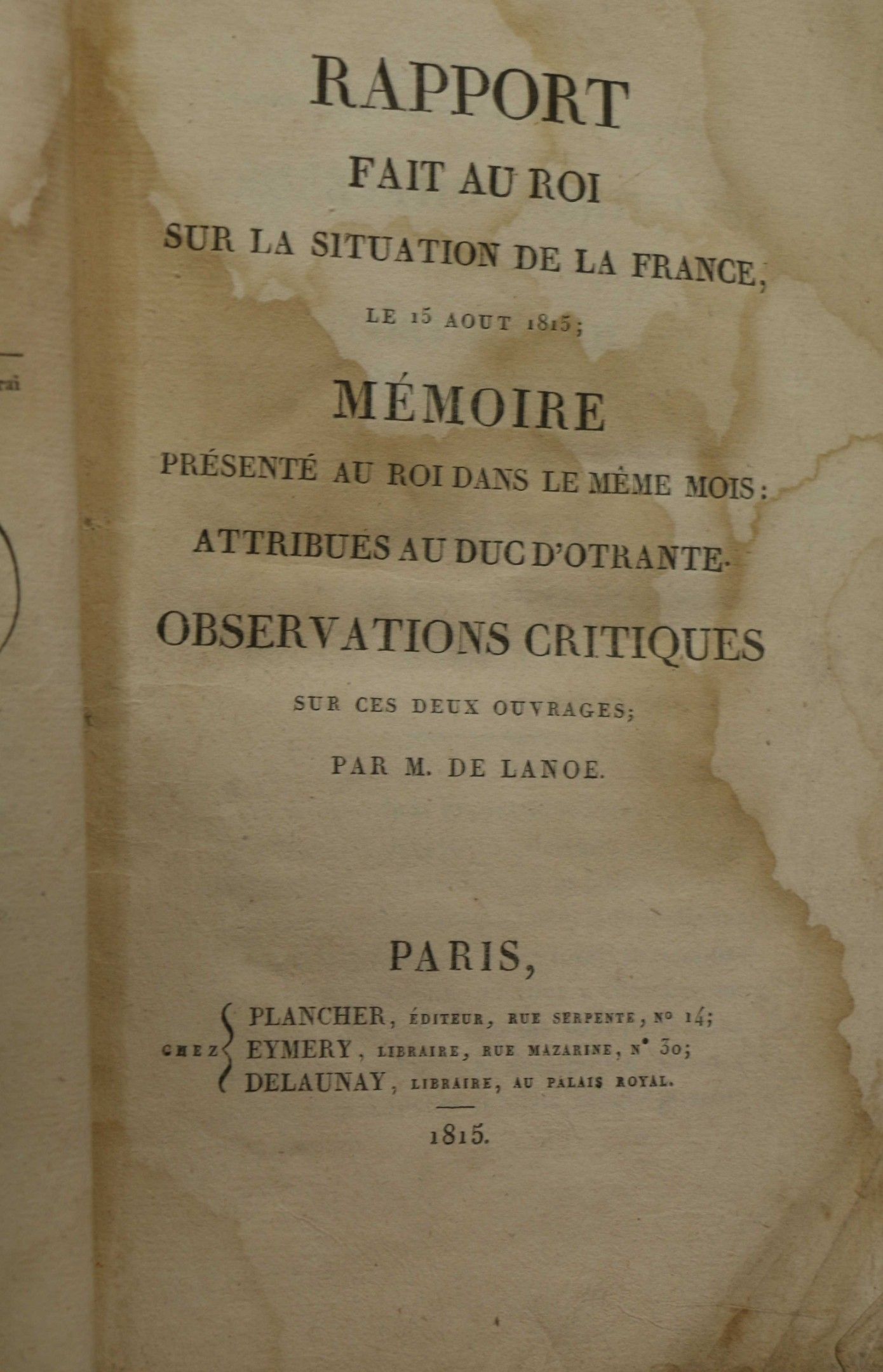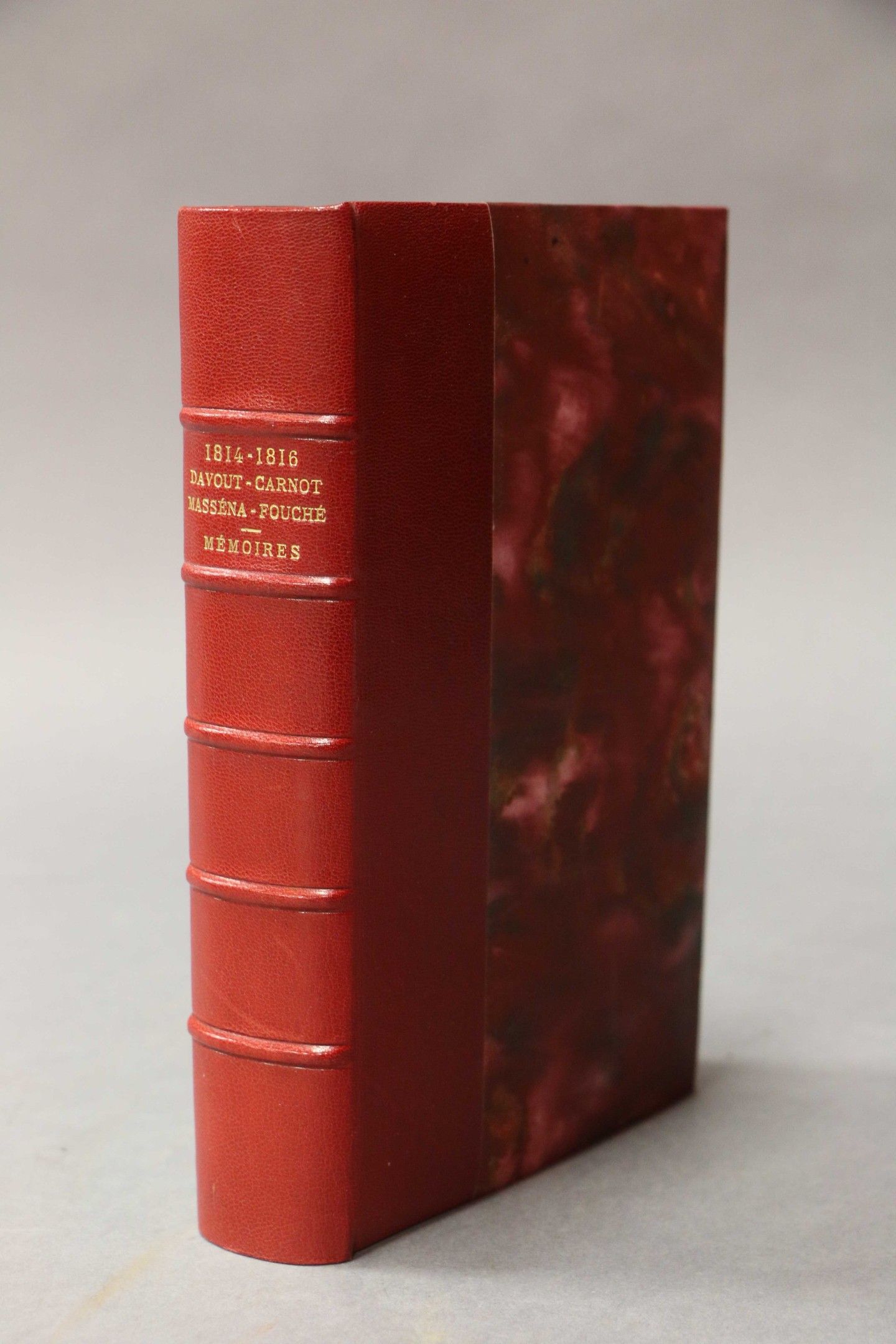 CHATEAUBRIAND. Rapport fait au roi sur la situation de la France le 15 août 1815, mémoires présentés au roi dans le même mois attribuée au duc d'Otrante observations critiques sur ces deux ouvrages. By de Lanoé. Paris, Plancher, 1815, in-8, 48 pp. half calf, red chag, ribbed spine (modern binding). Heavy spotting to first pages. Following: Mémoire de M. le maréchal Davout, prince d'Eckmühl au roi. Paris, Warée,1814. 160 pp. With 2 tables. - Dictionnaire des immobiles. Paris, 1815. 38 pp. - De l'impossibilité d'établir un gouvernement constitutionnel sous un chef militaire et particulièrement sous Napoléon. Paris, 1815. 47 pp. - MEMOIRE justificatif du duc de Raguse. Paris, 1815. 14 pp. - MEMOIRE de M. le maréchal Masséna, duc de Rivoli, prince d'Essling. Paris, Delaunay, 1816. 89 pp. With a map.