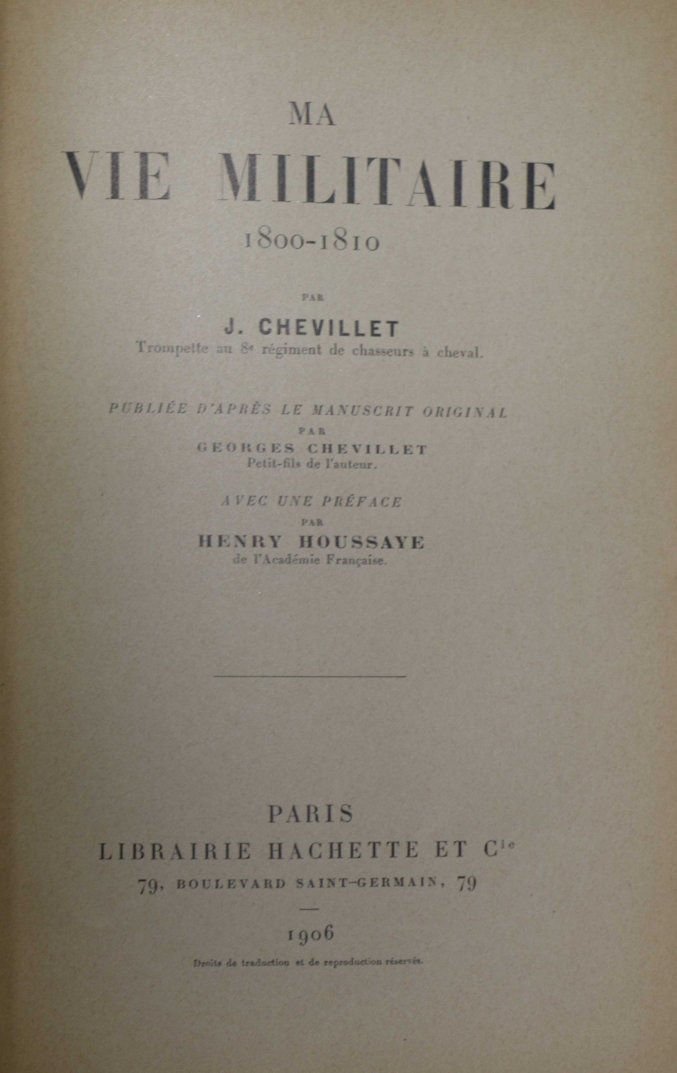 CHEVILLET. My military life. 1800-1810. Paris, Hachette, 1906, in-12, navy blue half calf chag. spine, covers preserved (mod. rel.). With a frontispiece.