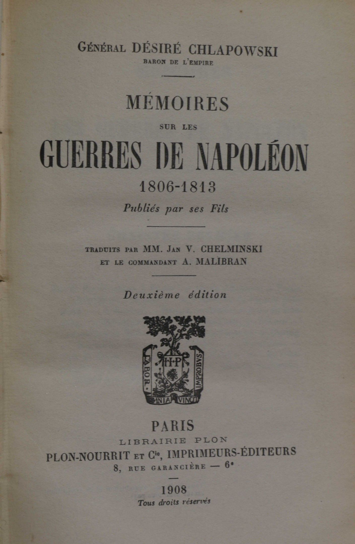 CHLAPOWSKI (General Désiré). Memoirs on Napoleon's wars.1806-1813. Second edition. Paris, Plon, 1908, in-12, green percal. boards, gilt monogram on covers, stamps. With a frontispiece portrait.