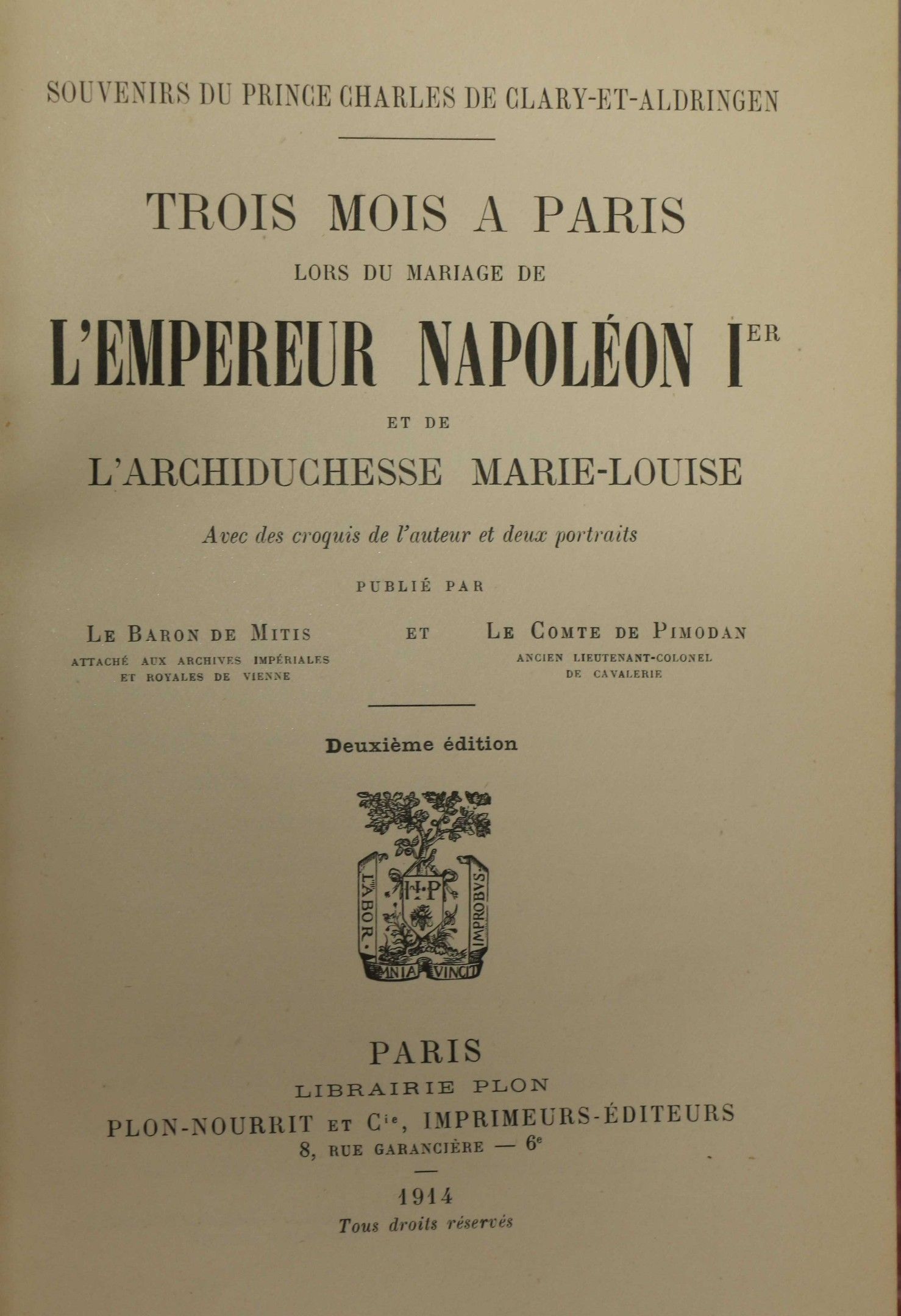 CLARY & ALDRINGEN (Charles, Prince of). Memories of Prince Charles of Clary and Aldringen. Three months in Paris during the marriage of Emperor Napoleon 1st and Archduchess Marie-Louise. Paris, Plon, 1914, in-8, burgundy half-rel. chag., spine ribbed, decorated and unsealed. Second edition. With 2 portraits, one of which is a frontispiece.