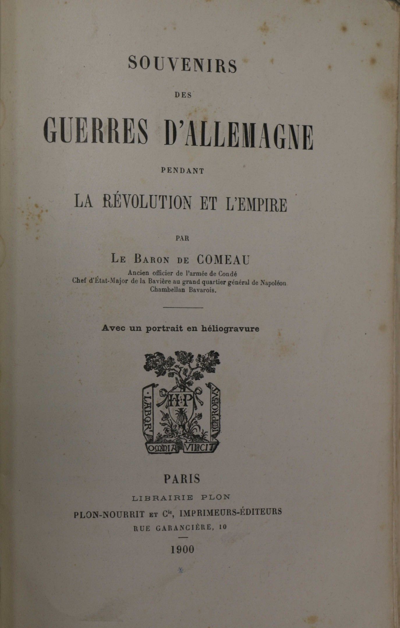 COMEAU (Baron de). Souvenirs des guerres d'Allemagne pendant la Révolution et de l'Empire. Paris, Plon, 1900, in-8, half calf black chag. spine, covers preserved (modern binding). FIRST EDITION. With a frontispiece portrait. A few scattered brown spots.
