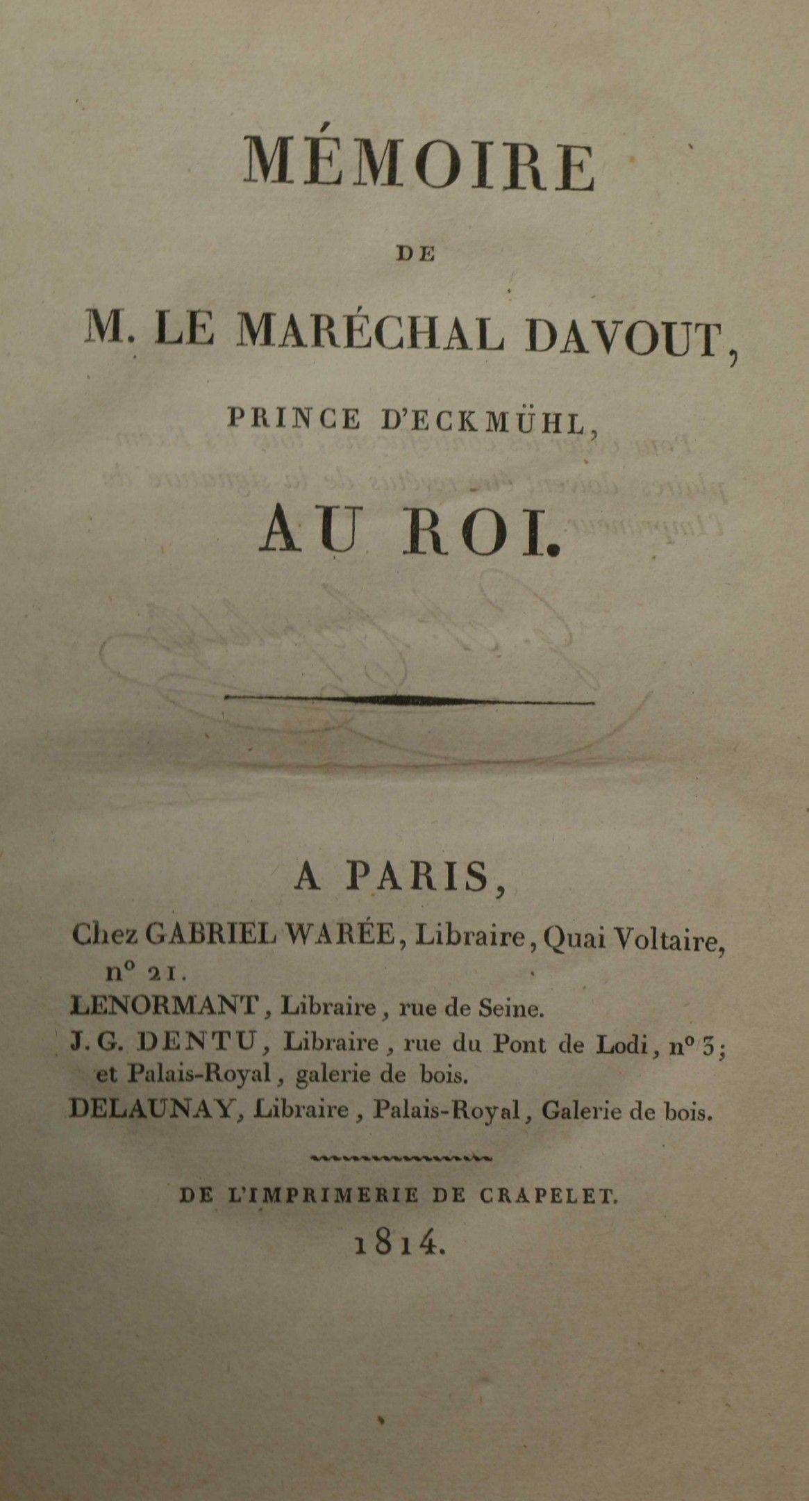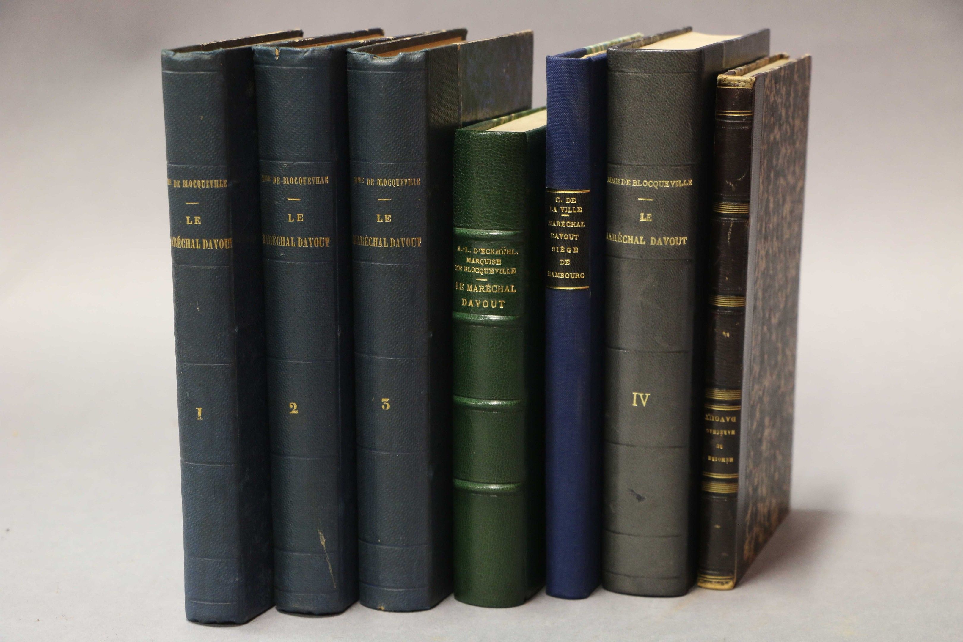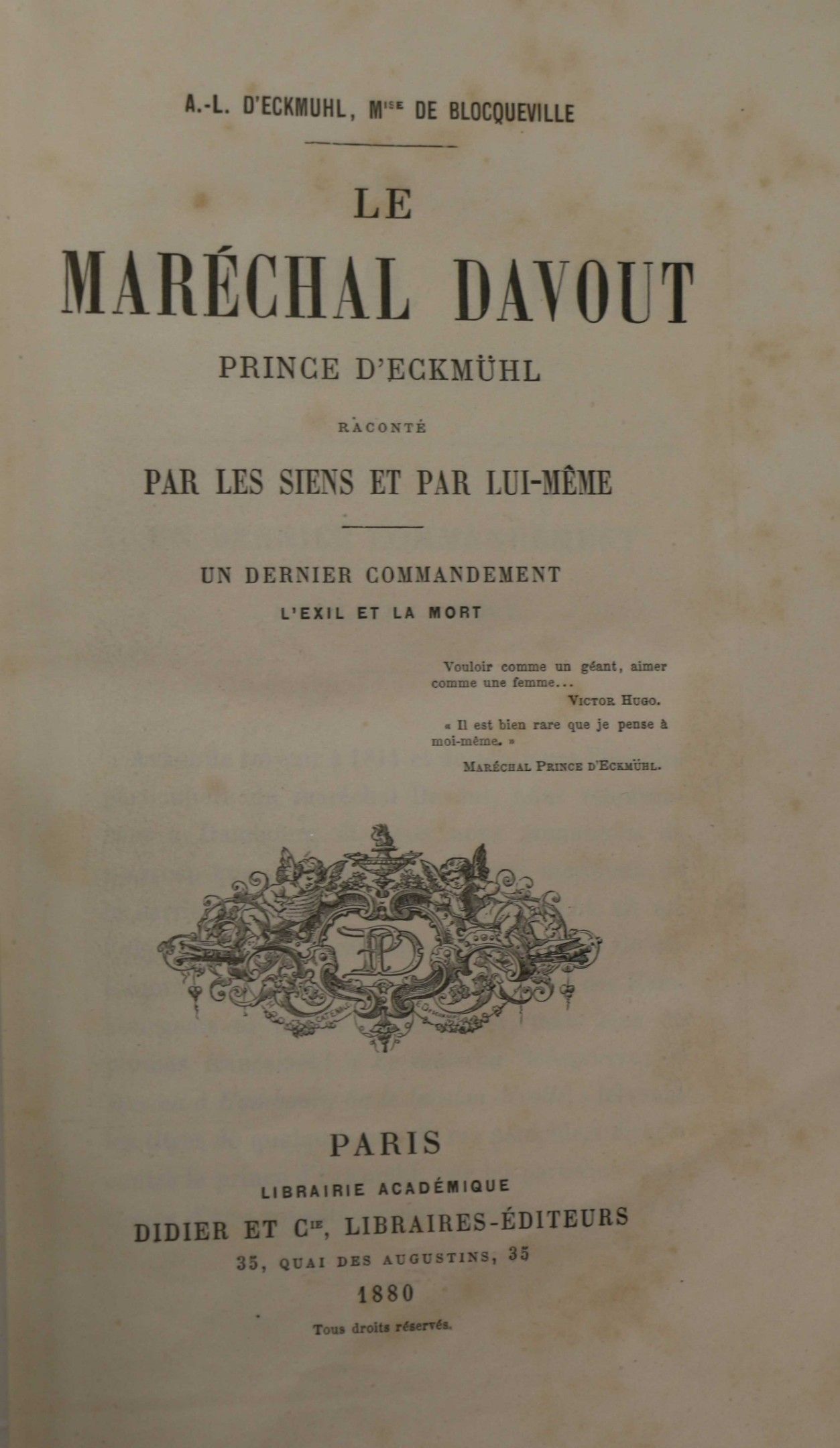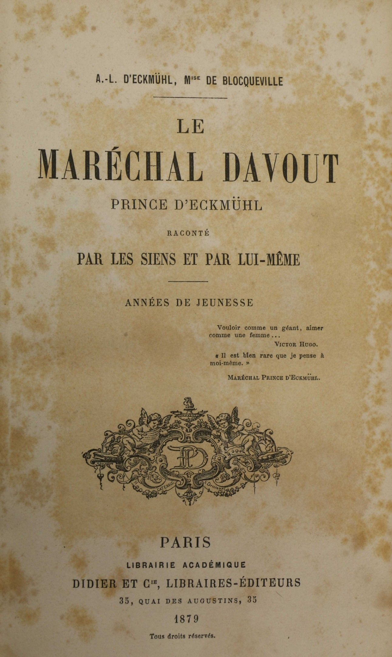 DAVOUT (Maréchal) - ECKMUHL (Miss de Blocqueville). Le Maréchal Davout, prince d'Eckmühl raconté par les siens et par lui-même. Paris, Didier, 1877-1880, 3 vol. in-8, navy blue half-rel. percal. With 3 frontispieces. Some foxing. - ECKMUHL. Le Maréchal Davout, prince d'Eckmühl. Paris, 1880, in-8, navy blue half calf, smooth spine, decorated. With a frontispiece. - DE LA VILLE. Maréchal Davout et siège de Hambourg. Mémoires de M. le Maréchal Davout, prince d'Eckmühl et roi. Paris, 1814, in-8, half-rel. blue cloth. With 2 sketches. - ECKMUHL. Marshal Davout, prince of Eckmühl. Unpublished correspondence. 1790-1815. Paris, Didier, s.d., in-12, green half calf, ribbed spine (modern binding). Rousseurs. - MEMOIRE de M. Le Maréchal Davout, prince d'Eckmühl, au Roi. Paris, Warée,1814, in-8, half calf plum, smooth spine. With 2 tables. In. of 7 vols.