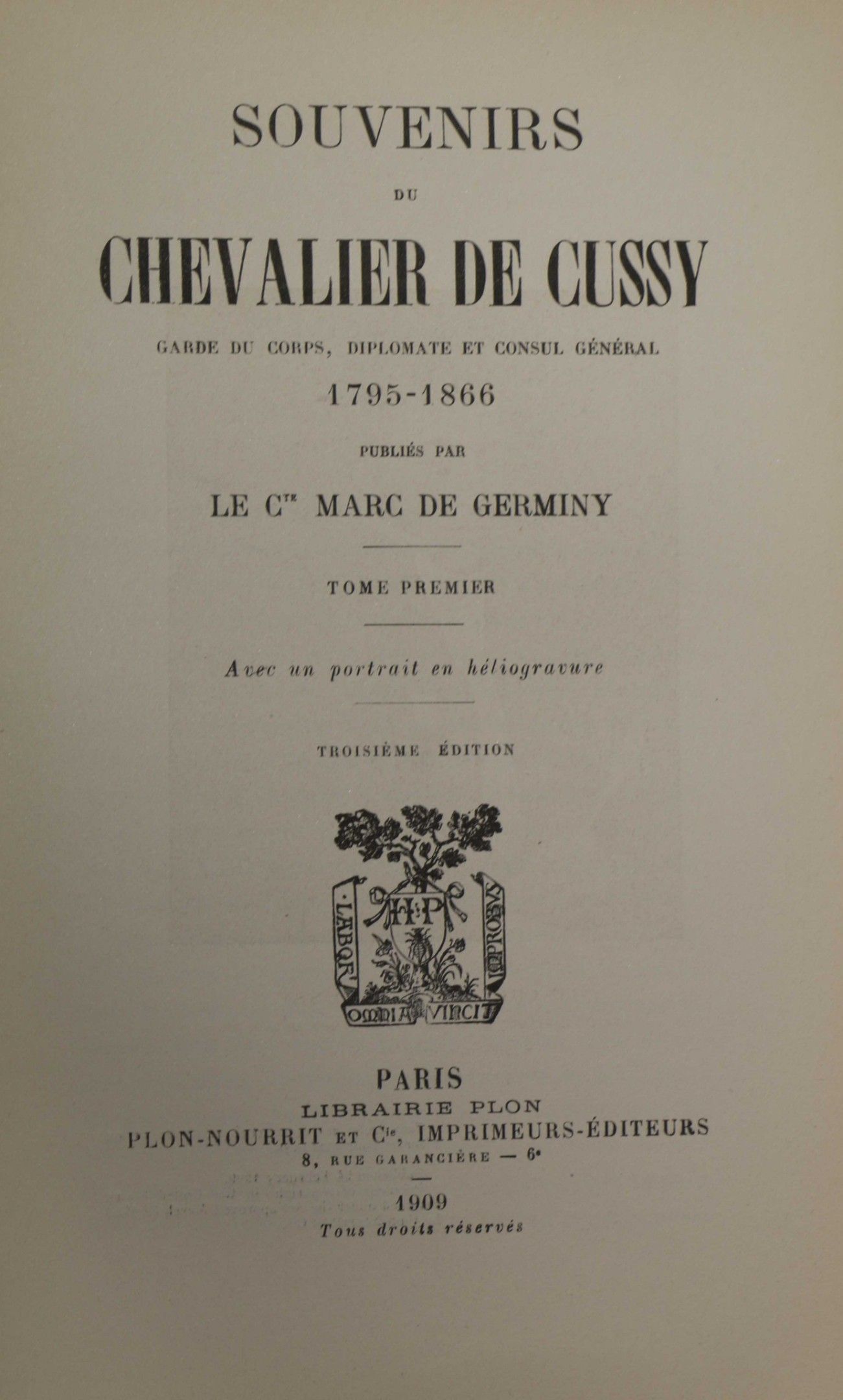 DEDEM DE GELDER. Memoirs. Paris, Plon, 1900, in-8, br. cover, ORIGINAL EDITION. With a frontispiece. - GRIVEL. Memoirs of Vice-Admiral Baron Grivel. Révolution-Empire. Paris, Plon, 1914, in-8, br. with 2 portraits and an engraving. - BOUVET. Précis des campagnes de l'amiral Pierre Bouvet. Second edition. Paris, Lévy, 1875, in-12, half-rel. with red silk corners, smooth spine. - DAMAS (Roger de). Memoirs of Count Roger de Damas. Paris, Plon, 1912-1914, 2 vol. in-8, br. cover, with a colour portrait, 2 black portraits, a map and a facsimile. - DAMAS (Baron de). Mémoires. Paris, Plon, s.d., 2 vol. in-8, br. cover. 4th edition. With 2 heliogravure portraits and a facsimile. - CUSSY. Souvenirs du chevalier de Cussy.1795-1866. Paris, Plon, 1909, 2 vol. in-8, br. couv. Third edition. With a heliogravure portrait. Set of 9 vols.