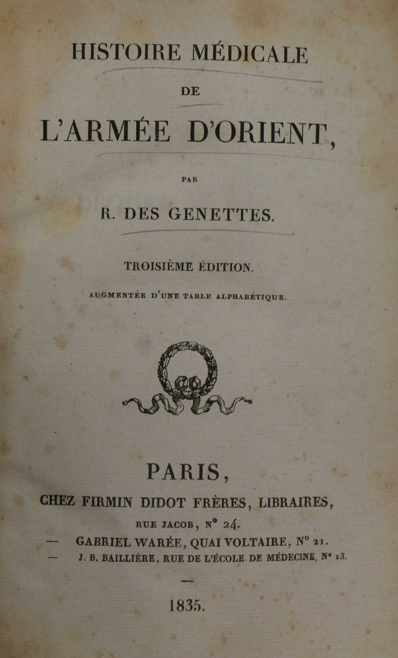 DESGENETTES. Medical history of the army of the East. Third edition. Paris, Firmin-Didot, 1835, in-8, half calf, smooth spine, ornamented and unstained (modern binding). With a table. Some foxing.
