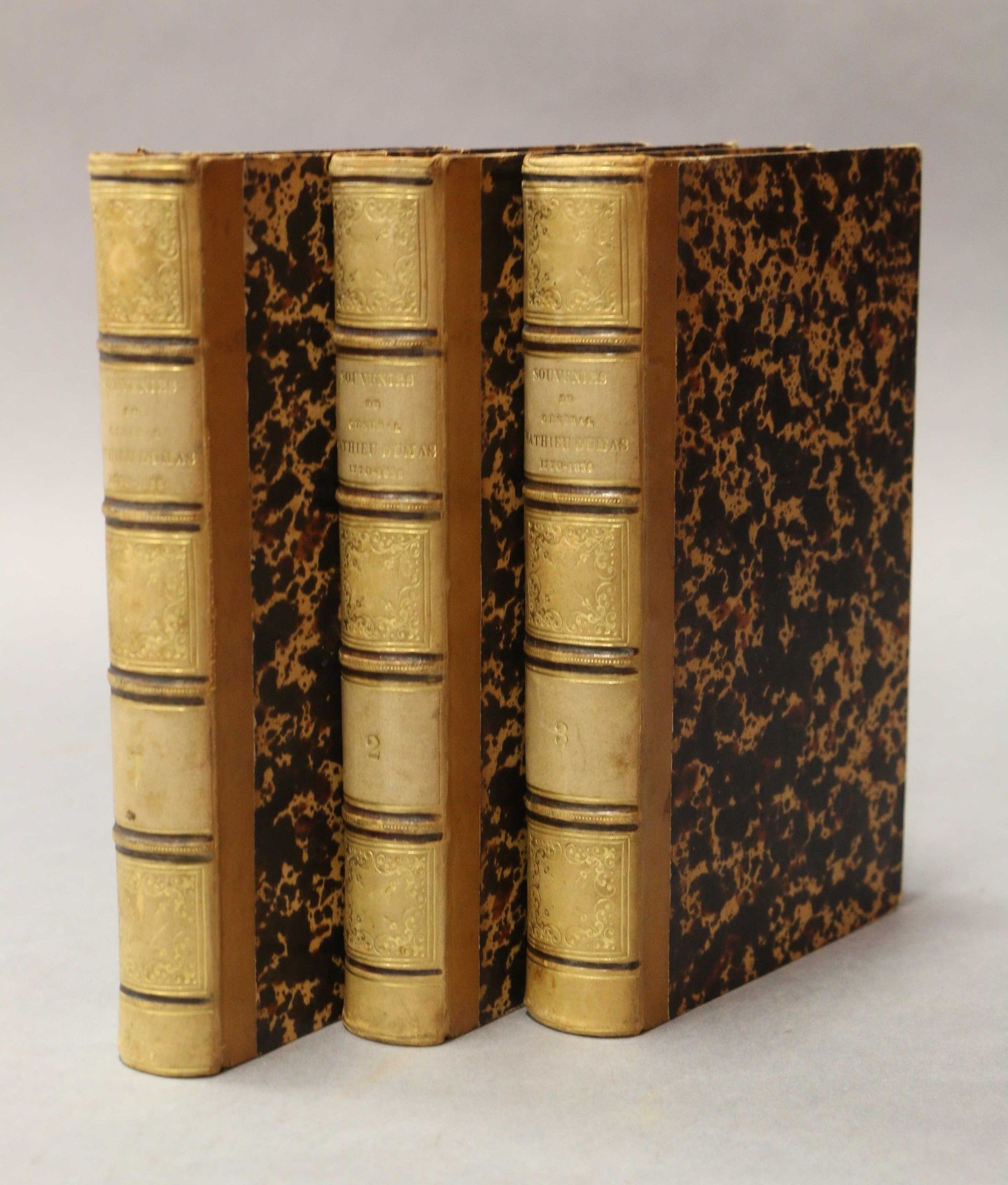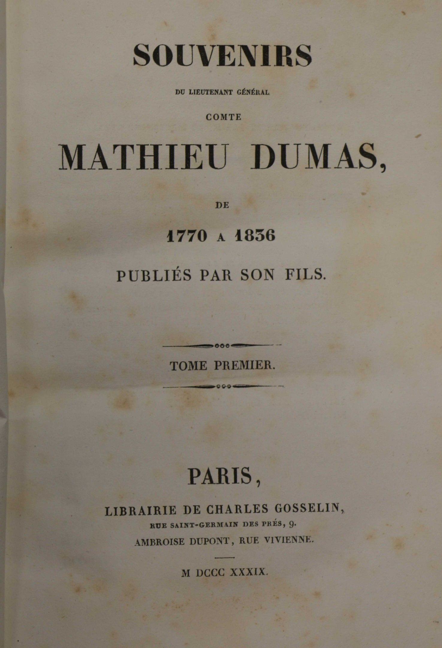 DUMAS (Mathieu). Memoirs of Lieutenant General Count Mathieu Dumas from 1770 to 1836. Published by his son. Paris, Gosselin,1839, 3 vol. in-8, half calf, spine ribbed, decorated (contemporary binding). FIRST EDITION. With a facsimile of a plan.
