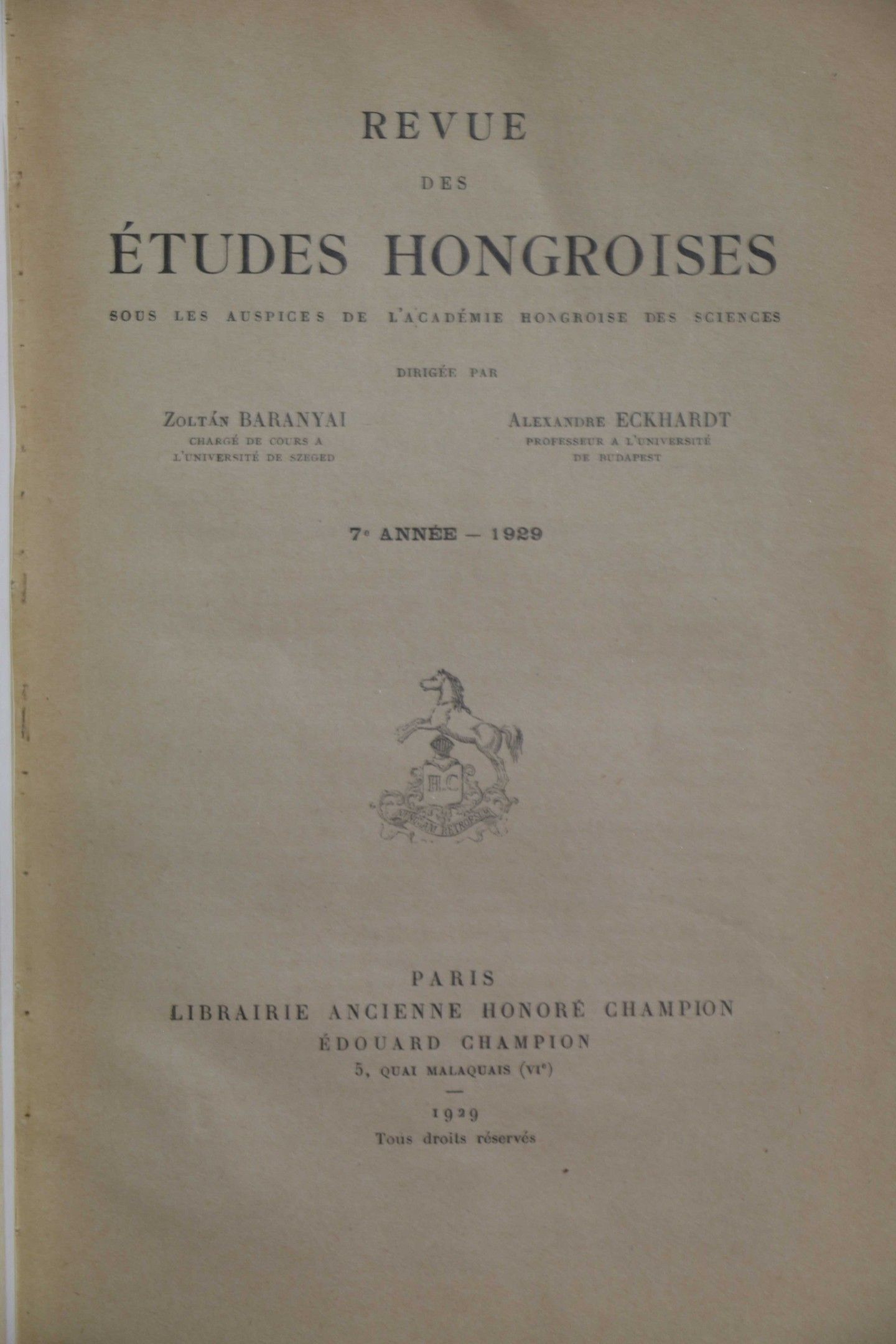 ESTERHAZY (Prince Paul). Stay in France. 1814. Journal of Hungarian Studies. 7th year. 1929. Booklet of 33 pp. in-8, black half leather chag. with long title. Ex-libris Baron Charles d'Huart.