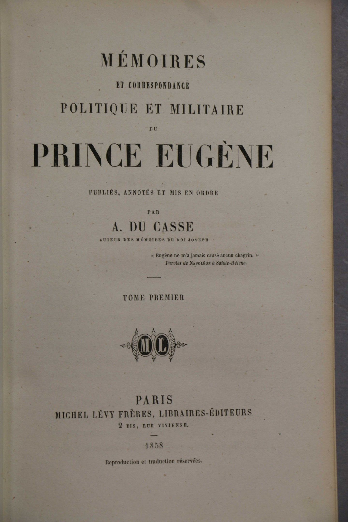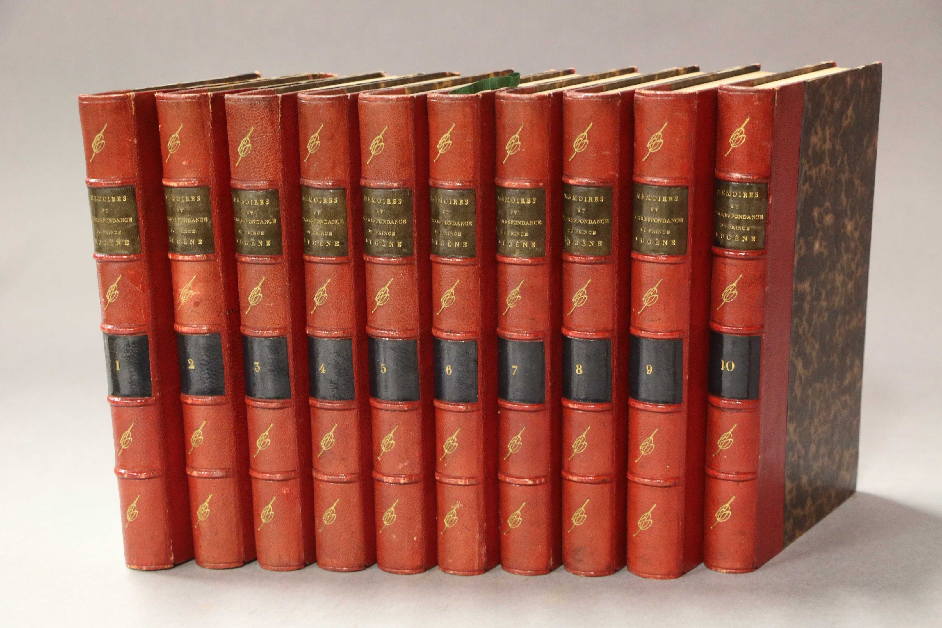 EUGENE (Prince). Memoirs and political and military correspondence of Prince Eugène. Published, annotated and arranged by A. Du Casse. Paris, Michel Lévy, 1858-1860, 10 vol. in-8, half calf, red chag., spine ribbed, decorated, green title page and black tomaison (contemporary binding). FIRST EDITION. From the library of Maxime de Camp with his bookplate.