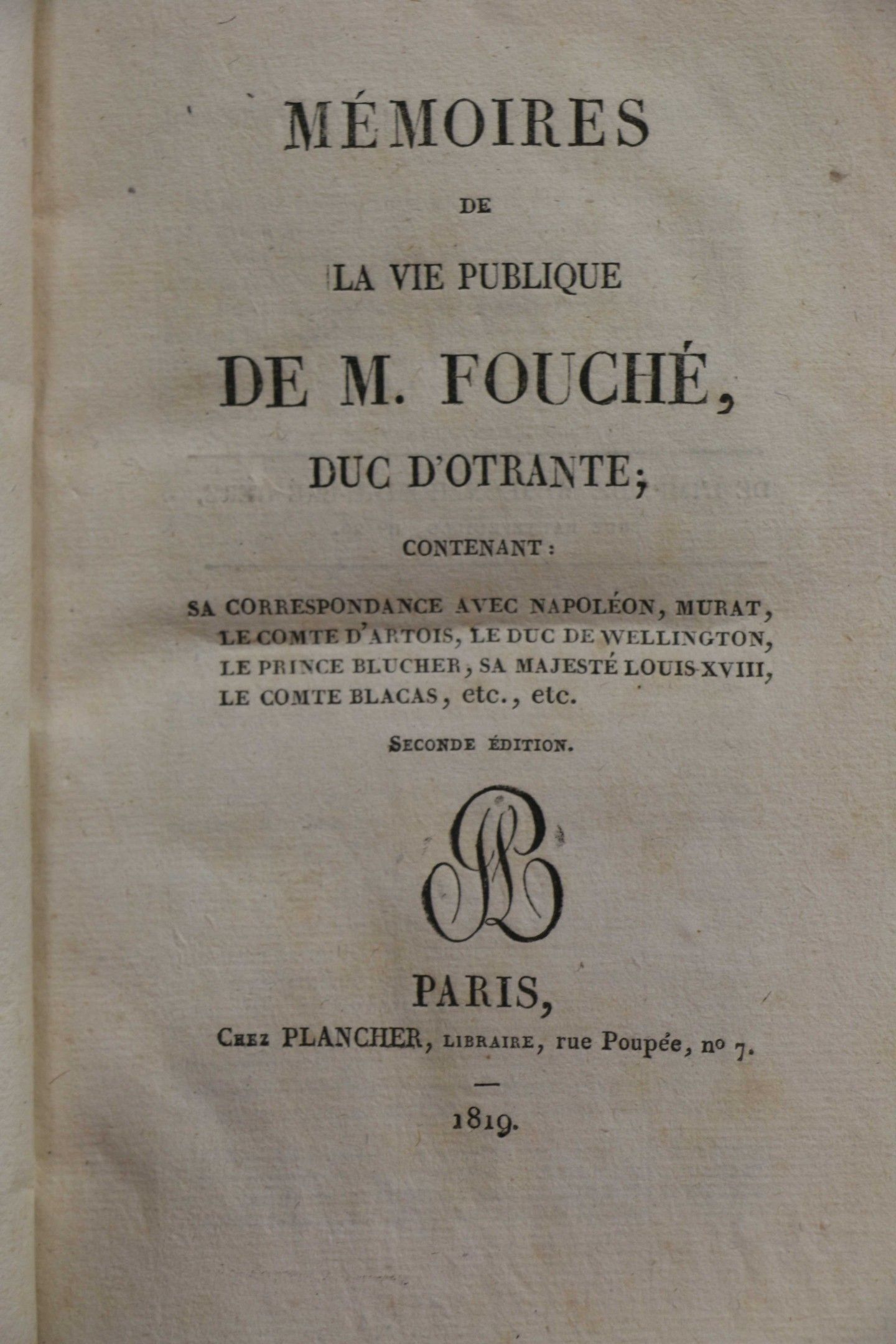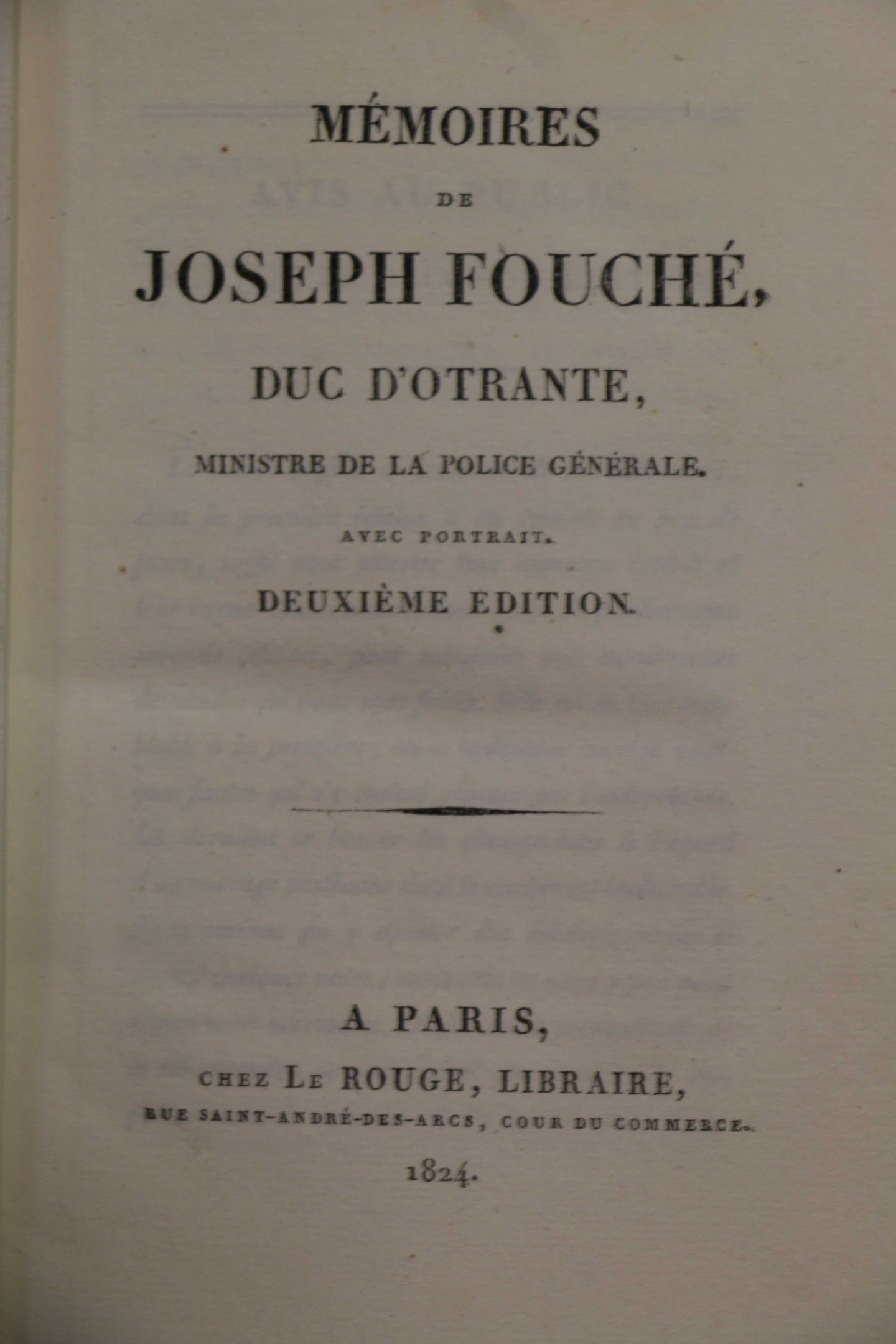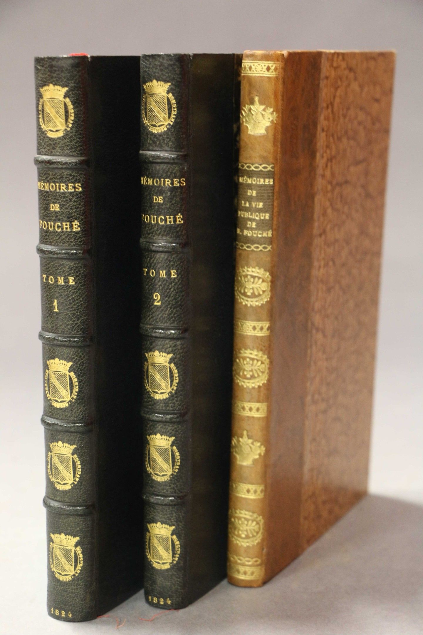 FOUCHE (Joseph). Mémoires de Joseph Fouché, duc d'Otranto, ministre de la police générale. Paris, chez le Rouge, 1824, 2 vol. in-8, navy blue half calf, ribbed spine, decorated with coat of arms on spine with gilt inscription. astra viam monstrant regibus , gilt head. FIRST EDITION. With a portrait. - FOUCHE. Mémoires de la vie publique de M. Fouché, Duc d'Otranto. Paris, Plancher, 1819, in-8, half bas. bas. fawn, smooth spine, decorated (rel. mod.). Set of 3 vols.
