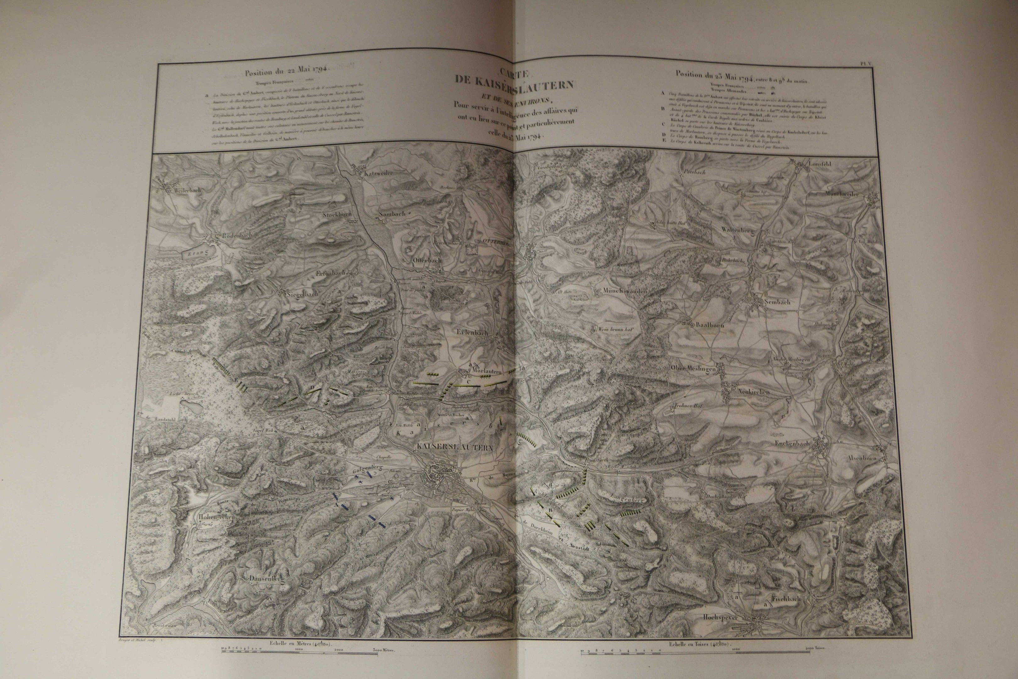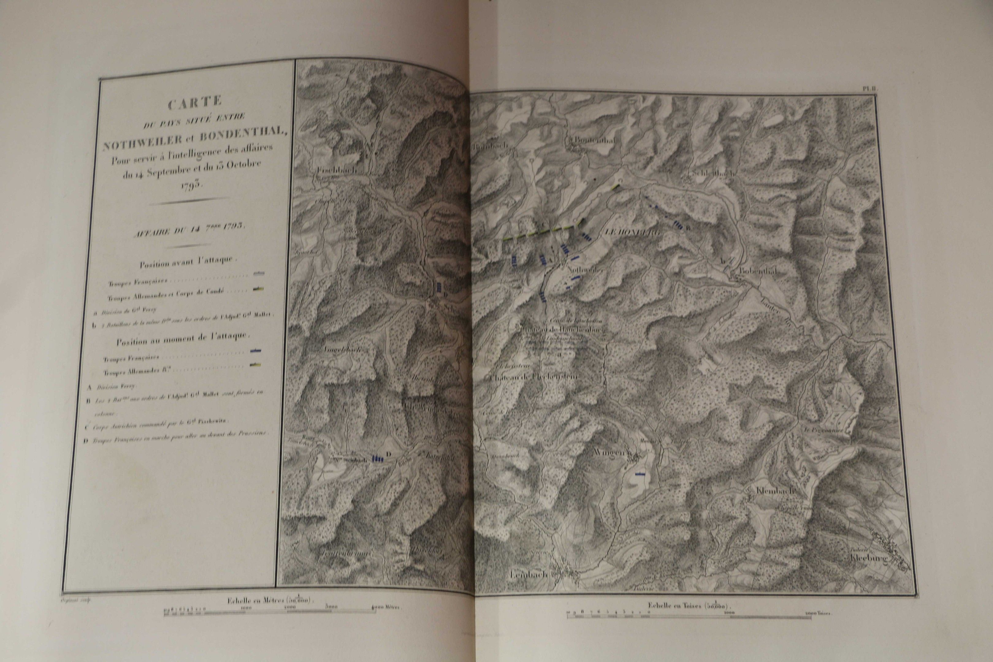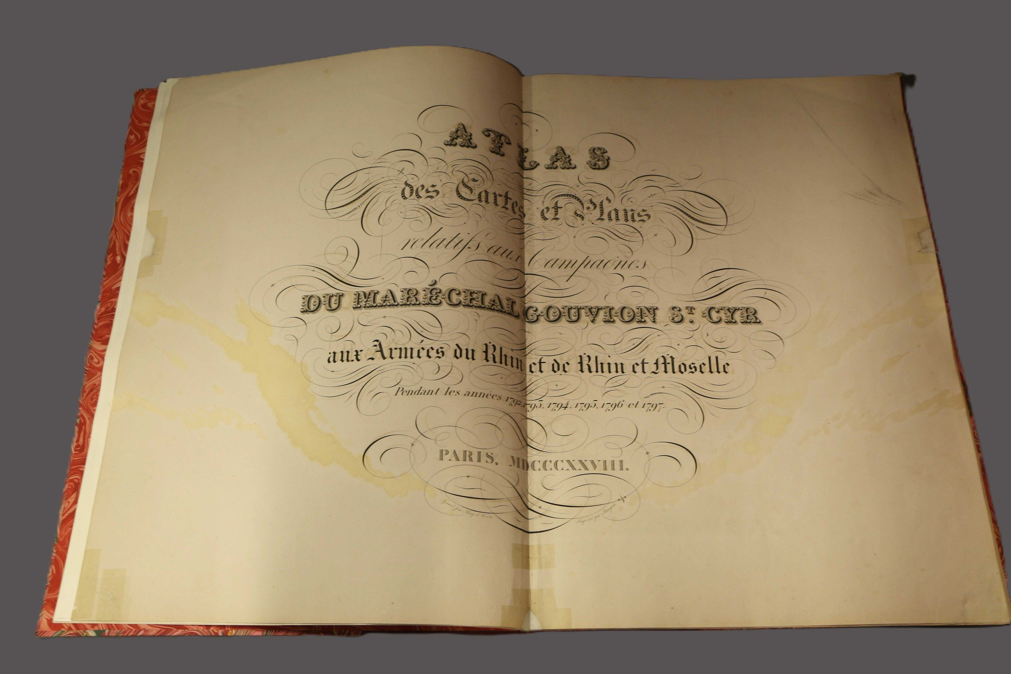 GOUVION SAINT-CYR (Maréchal de). ATLAS of maps and plans relating to the campaigns of Marshal Gouvion Saint-Cyr in the armies of the Rhine and Rhine and Moselle during the years 1792, 1793, 1794, 1795, 1796 and 1797. Paris, 1828, broadside, red half cloth. With 16 maps (including map 2 bis). Title restored, some plates restored with tape. Marginal worm damage to maps 7 to 12.