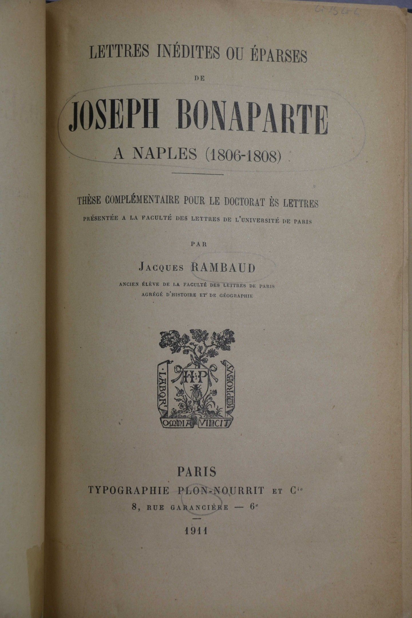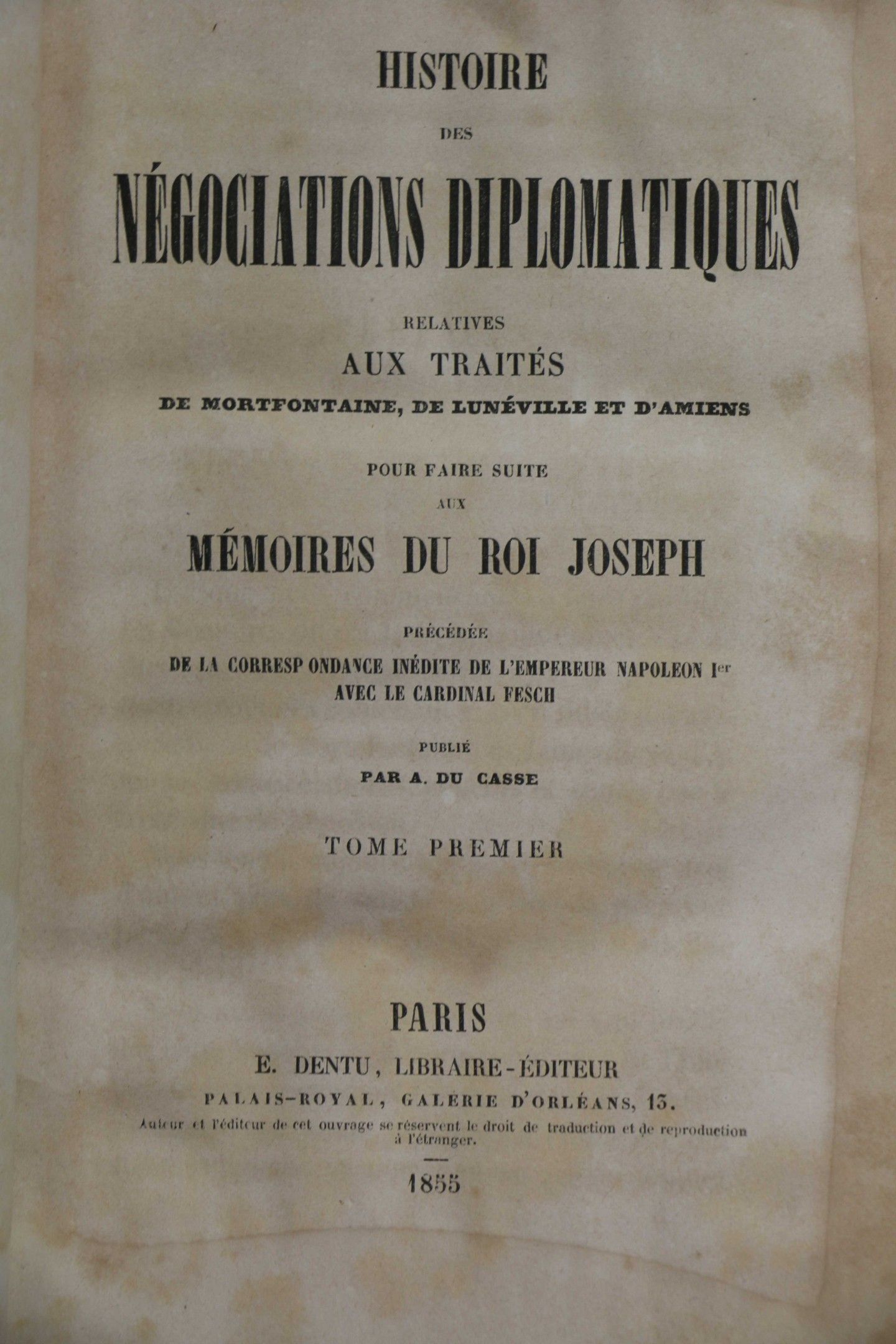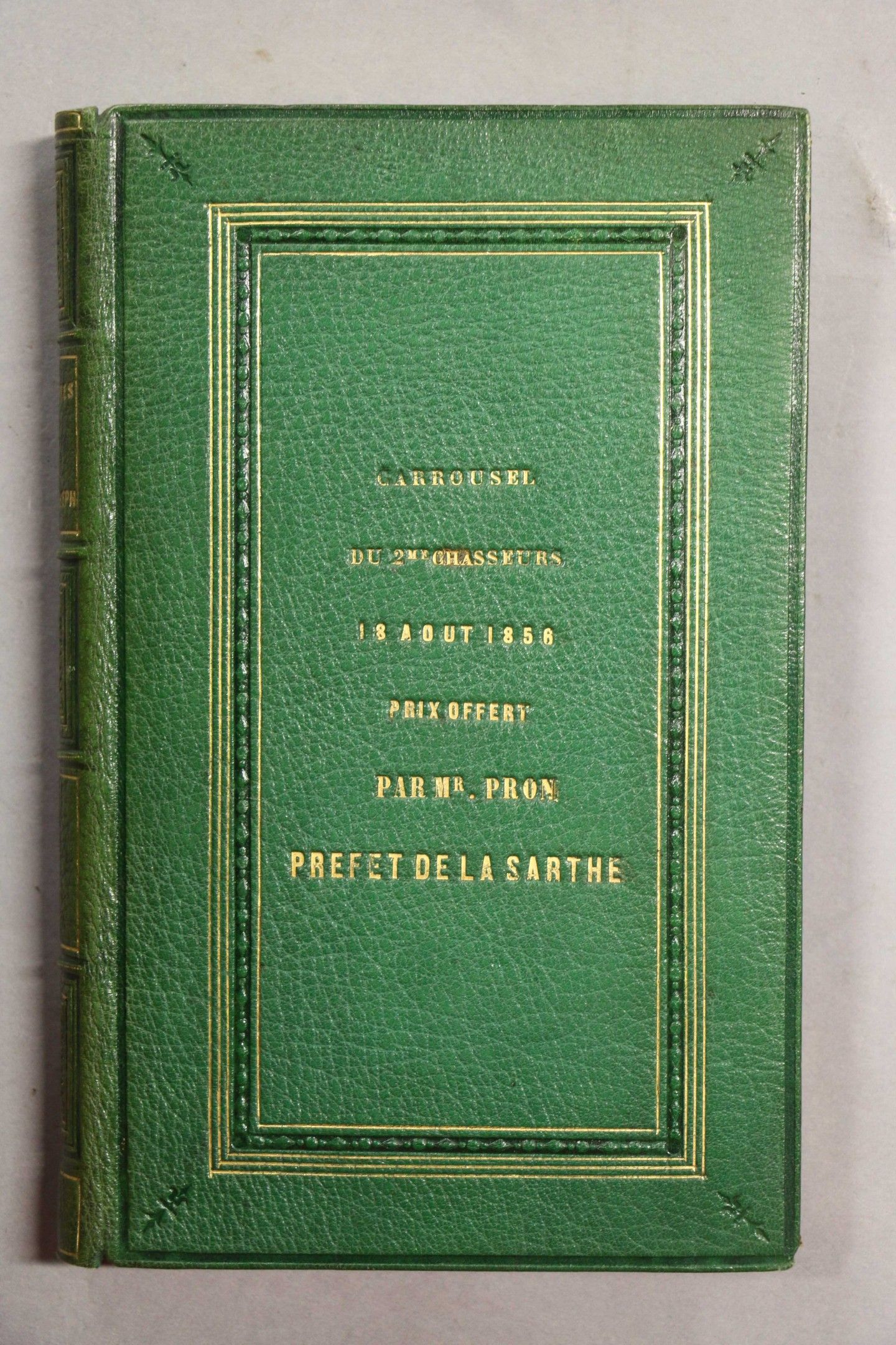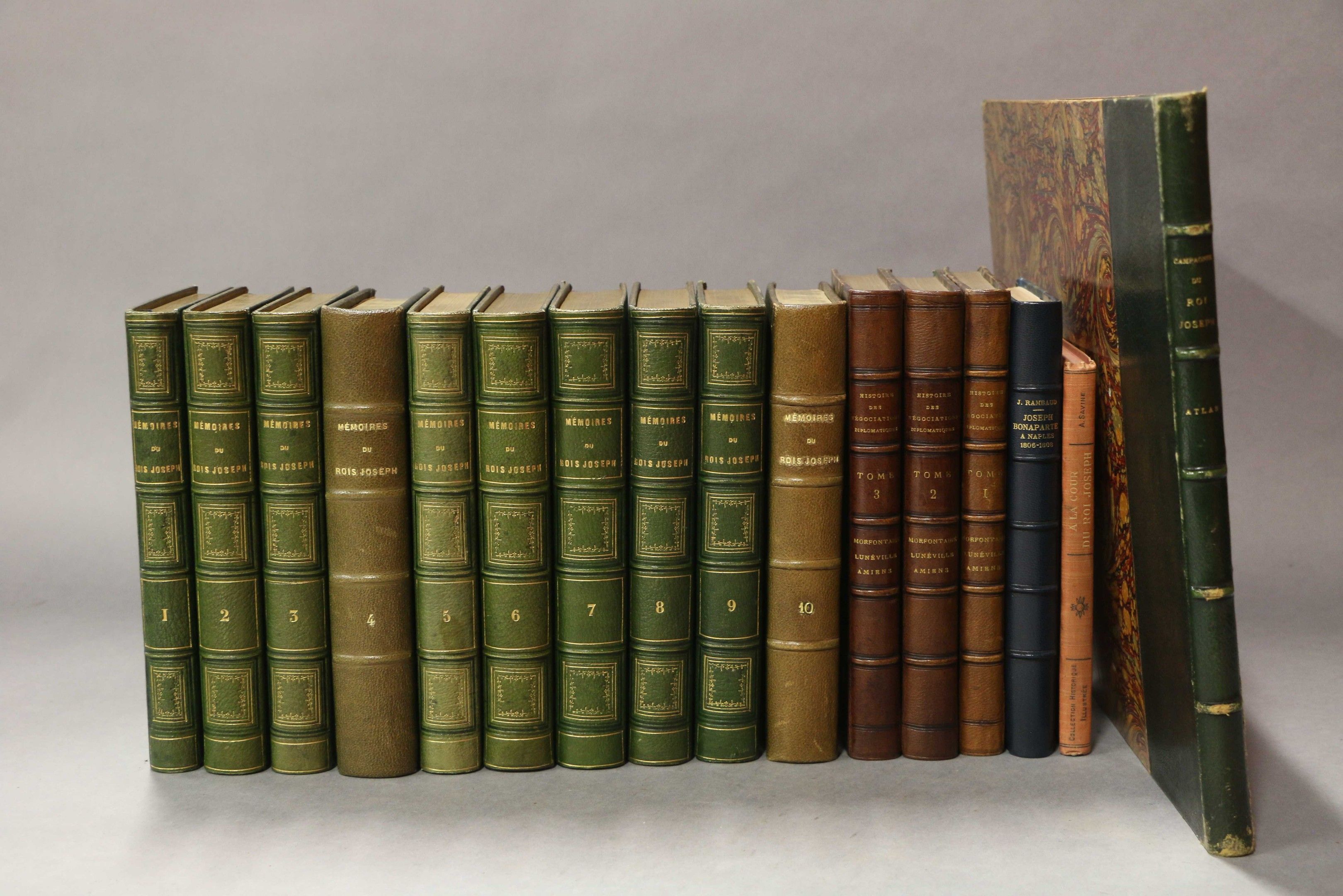 JOSEPH (king). Memoirs and political and military correspondence of King Joseph. Paris, Perrotin, 1856 -1854, 8 vol. in-8, full green chag., gilt framing on boards with gilt inscription on 1st board in the centre carrousel of the 2nd chasseurs 18 August 1858, prize offered by Mr. Pron, prefect of the Sarthe, ribbed spine, decorated, gilt tr. Vol. 4 et 10, Paris, Perrotin, 1854, 2 vol.in-8, full green chag. spine, sun-stained (different binding). Set of 10 vols. Attached ATLAS des campagnes du roi Joseph. S.l., s.d, in-4 oblong, green half leather, ribbed spine, gilt head (Lemardeley). Ex-libris Prince de la Moscowa, marshal Ney. With 20 plates of battles engraved by Yung and Lalaisse. - DU CASSE. Histoire des négociations diplomatiques relatives aux traités de Mortefontaine, de Lunéville et d'Amiens pour faite suite aux mémoires du roi Joseph. Paris, Dentu, 1855, 3 vol. in-8, burgundy half calf, spine ribbed. Qq. wetnesses. Former library of the château de Plessis-Brion. - RAMBAUD. Lettres inédites ou éparses de Joseph Bonaparte à Naples (1806-1808). Paris, Plon,1911, in-8, navy blue half calf, ribbed spine (modern binding). On y joint : Savine. A la cour du roi Joseph. Set of 16 vol.