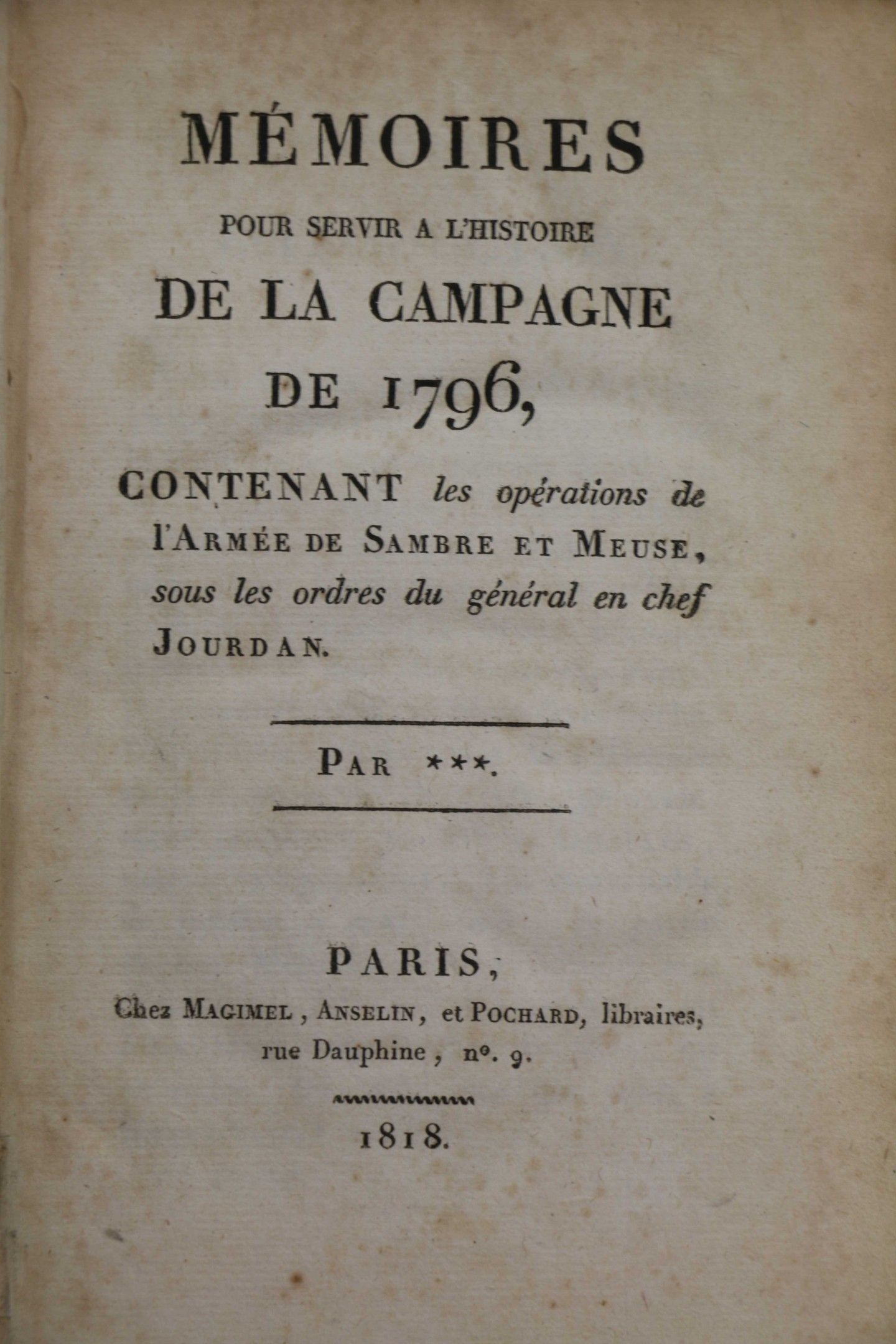 JOURDAN - MEMOIRES pour servir à l'histoire de la campagne de 1796 contenant les opérations de l'armée de Sambre et Meuse sous les ordres du général en chef Jourdan. Paris, Magimel, 1818, in-8, dark green half-rel. bas., smooth spine, decorated and faded (contemporary binding). FIRST EDITION. With 4 tables. Some brown spots.
