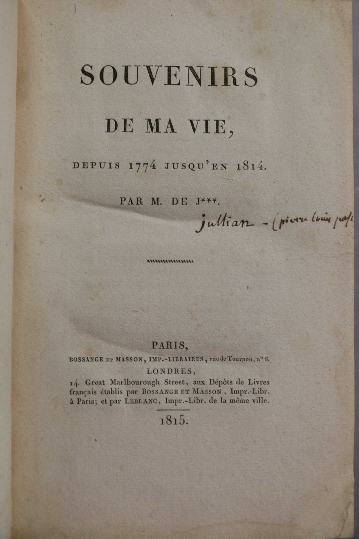 JULLIAN. Souvenirs de ma vie depuis 1774 jusqu'en 1814. Paris, Bossange et Masson, 1815, in-8, full garnet cloth, smooth spine, red title-piece (mod. rel.). FIRST EDITION. Mark of stamp on the false title.