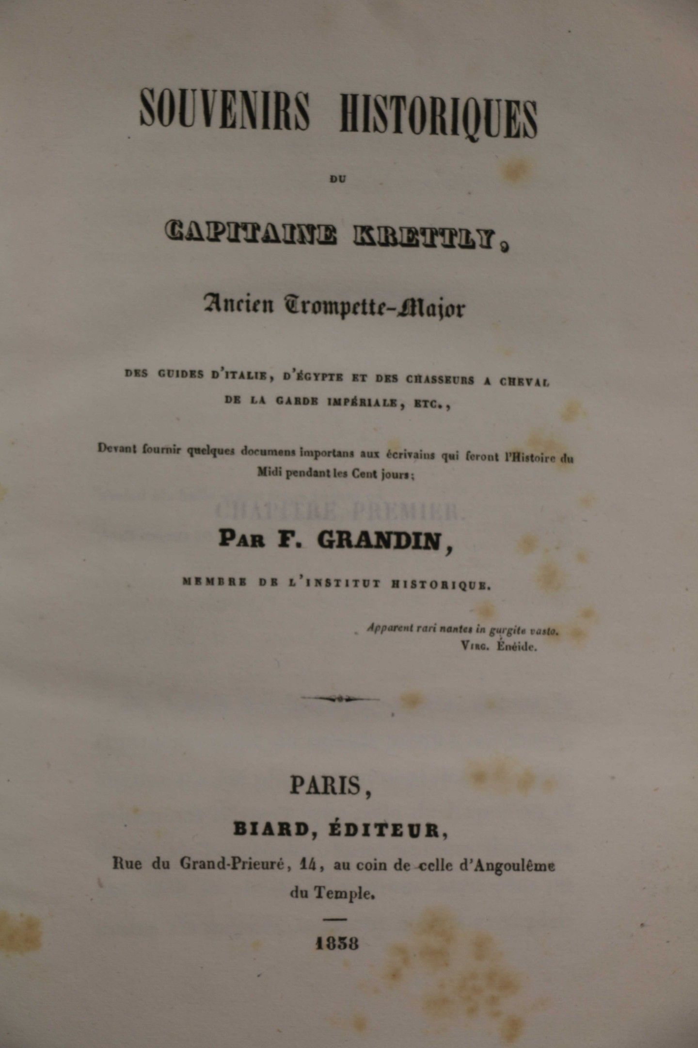 KRETTLY (Captain). Souvenirs historiques du capitaine Krettly, ancien Trompette-major des guides d'Italie, d'Egypte et des chasseurs à cheval de la garde impériale. Paris, Biard, 1838, in-8, worn marbled paper boards. Qq. rousseurs.