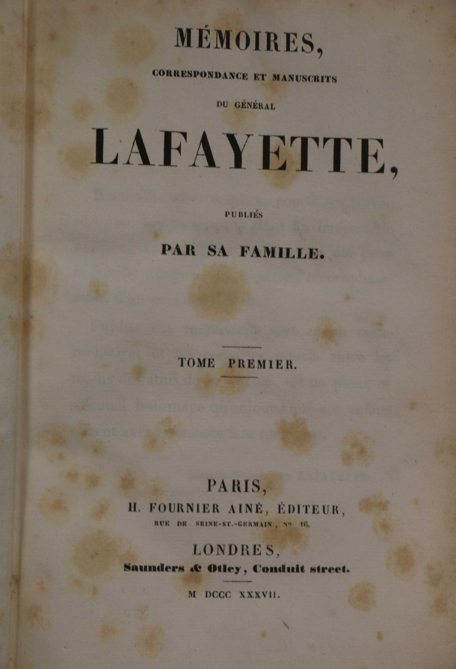 LA FAYETTE (General). Memoirs, correspondence and manuscripts of General Lafayette published by his family. Paris, Fournier, London, Saunders, Leipzig, Brockhaus, 1837-1838, 6 volumes bound in 3 vol. in-8, half calf, ribbed spines, decorated, black title-pieces (contemporary binding). FIRST EDITION. Frequent foxing and spotting. Incomplete of the map which is often missing.