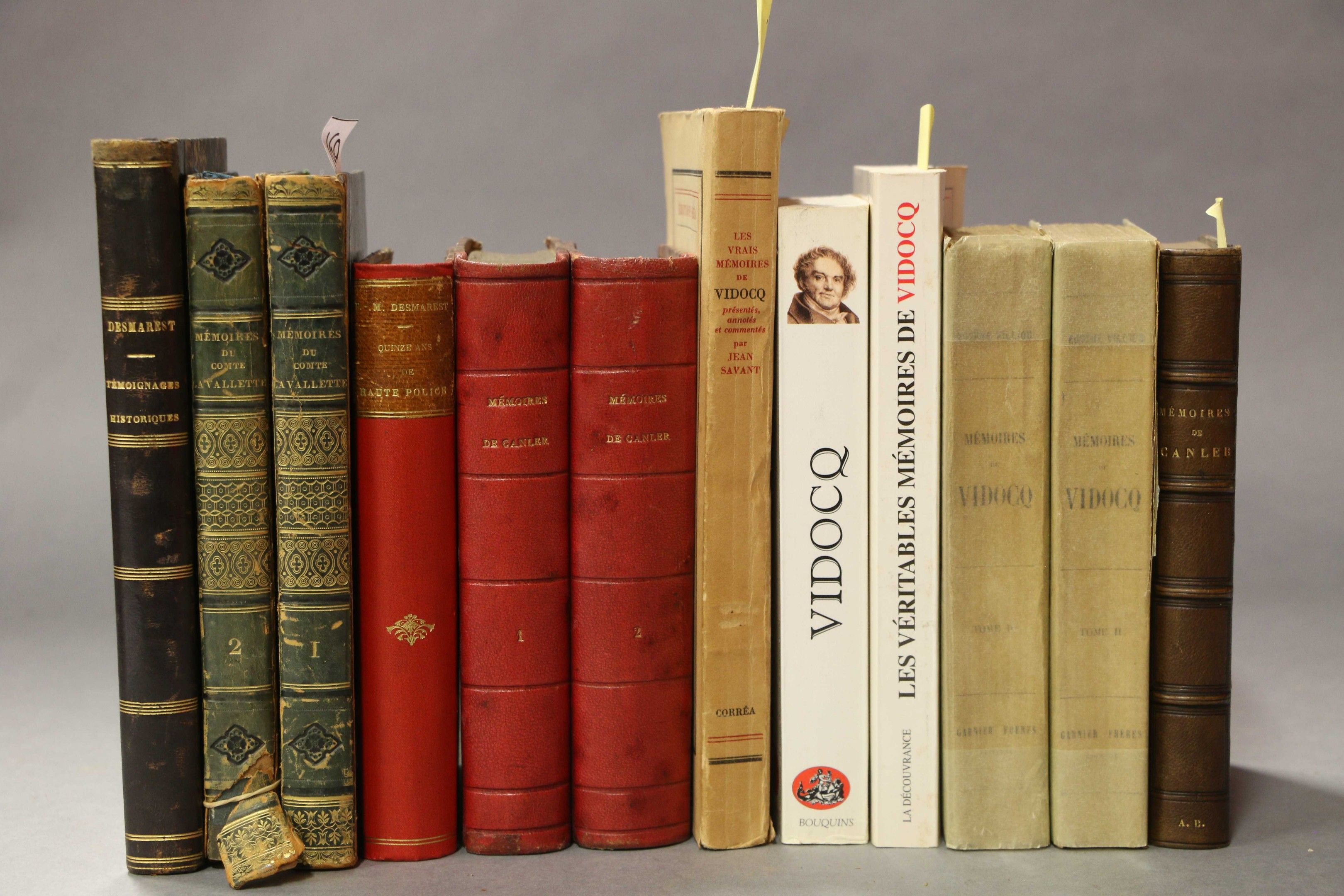 LAVALETTE. Mémoires et souvenirs du comte de Lavalette. Paris, Fournier, 1831, 2 vol. in-8, half calf, navy blue, smooth spine, ornamented (small fly damage to spine of volume 2). FIRST EDITION. - CANLER. Mémoires de Canler, ancien chef de sureté. Paris, Roy, 1882, 2 vol. in-12, red half calf, smooth spine. Second edition. Heavy foxing to edges. - DESMAREST. Quinze ans de haute police sous le Consulat et l'Empire. Paris, Garnier, 1900, in-12, red silk half-rel. - VIDOCQ. Mémoires de Vidocq, chef de la police de sureté jusqu'en 1827. Paris, Garnier, s.d., 2 vols, in-12, br. printed cover - SAVANT. Les vrais mémoires de Vidocq. Paris, Corréard, 1950, in-8, br. With a frontispiece. Also included. Vidocq. Paris, Laffont, 1998 and les véritables mémoires de Vidocq. 1997. - CANLER. Memoirs. Paris, Hetzel, s.d., in-12, brown half calf, spine ribbed. - DESMAREST. Témoignages historiques ou quinze ans de haute police sous Napoléon. Paris, Levavasseur, 1833, in-8, plum half calf, smooth spine. Set of 12 vol.