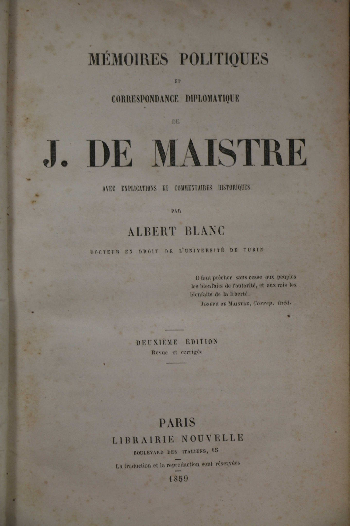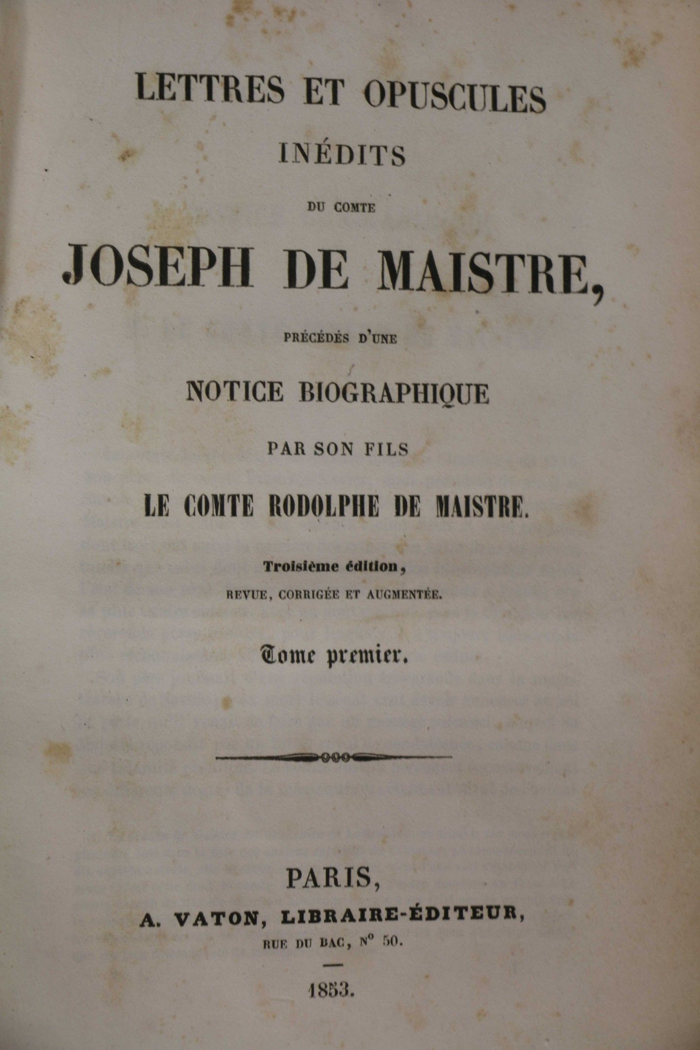 MAISTRE (Joseph de). Lettres et opuscules inédits du comte Joseph de Maistre, précédés d'une notice biographique par son fils le comte Rodolphe de Maistre. Third edition. Paris, Vaton,1853, 2 vol. in-8, brown half calf, smooth spine (worn binding). With a frontispiece. Some wetness at the beginning of the text. - MAISTRE (J. de). Political memoirs and diplomatic correspondence. Second edition. Paris, Librairie nouvelle, 1859, in-8, half calf, smooth spine (binding rubbed). Set of 3 vols.