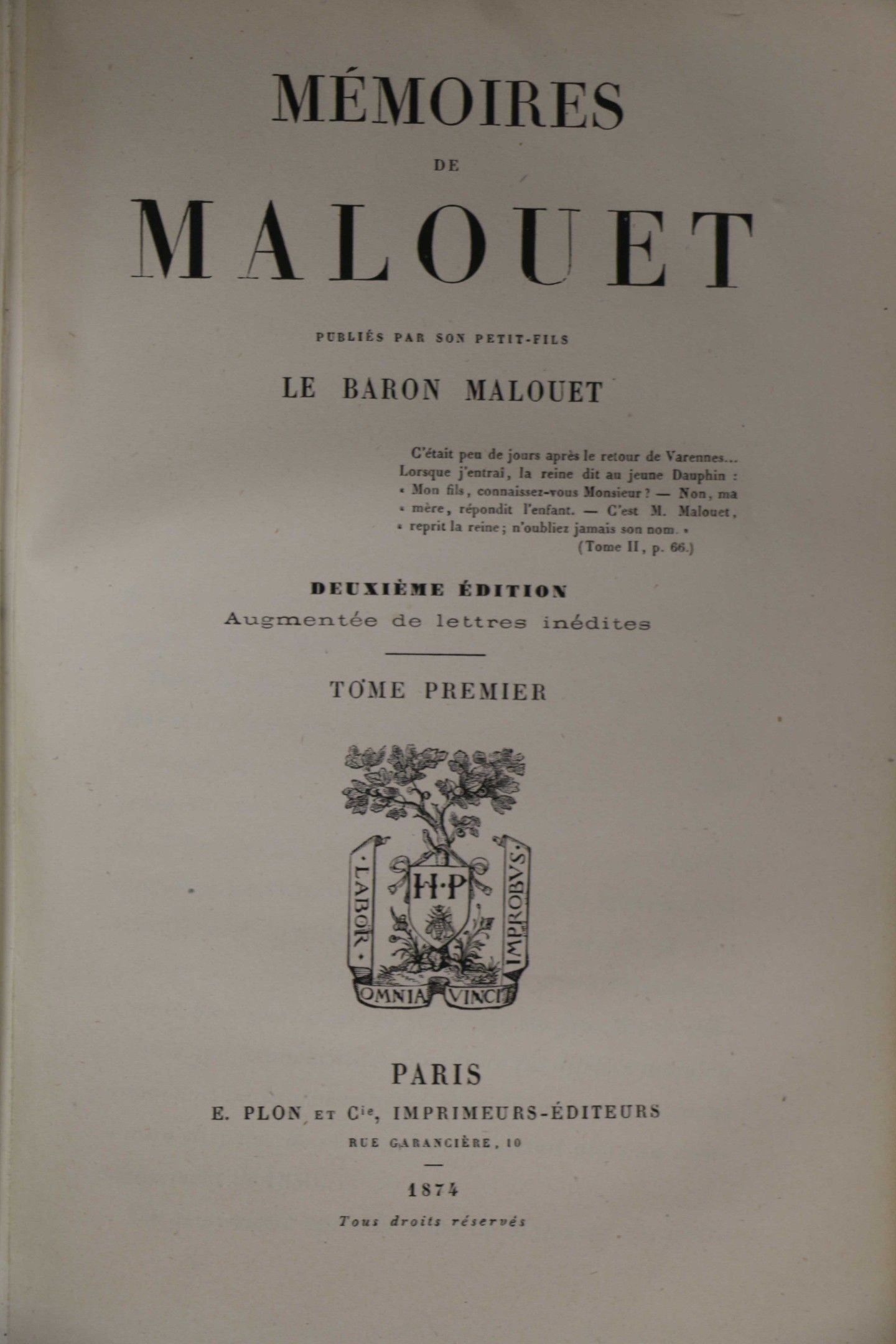 MALOUET (Baron). Memoirs. Second edition. Paris, Plon, 1874, 2 vol. in-8, half calf black chag. spines, decorated with gilt caissons, gilt tr. (contemporary binding). With a frontispiece. Some soiling to endpapers.