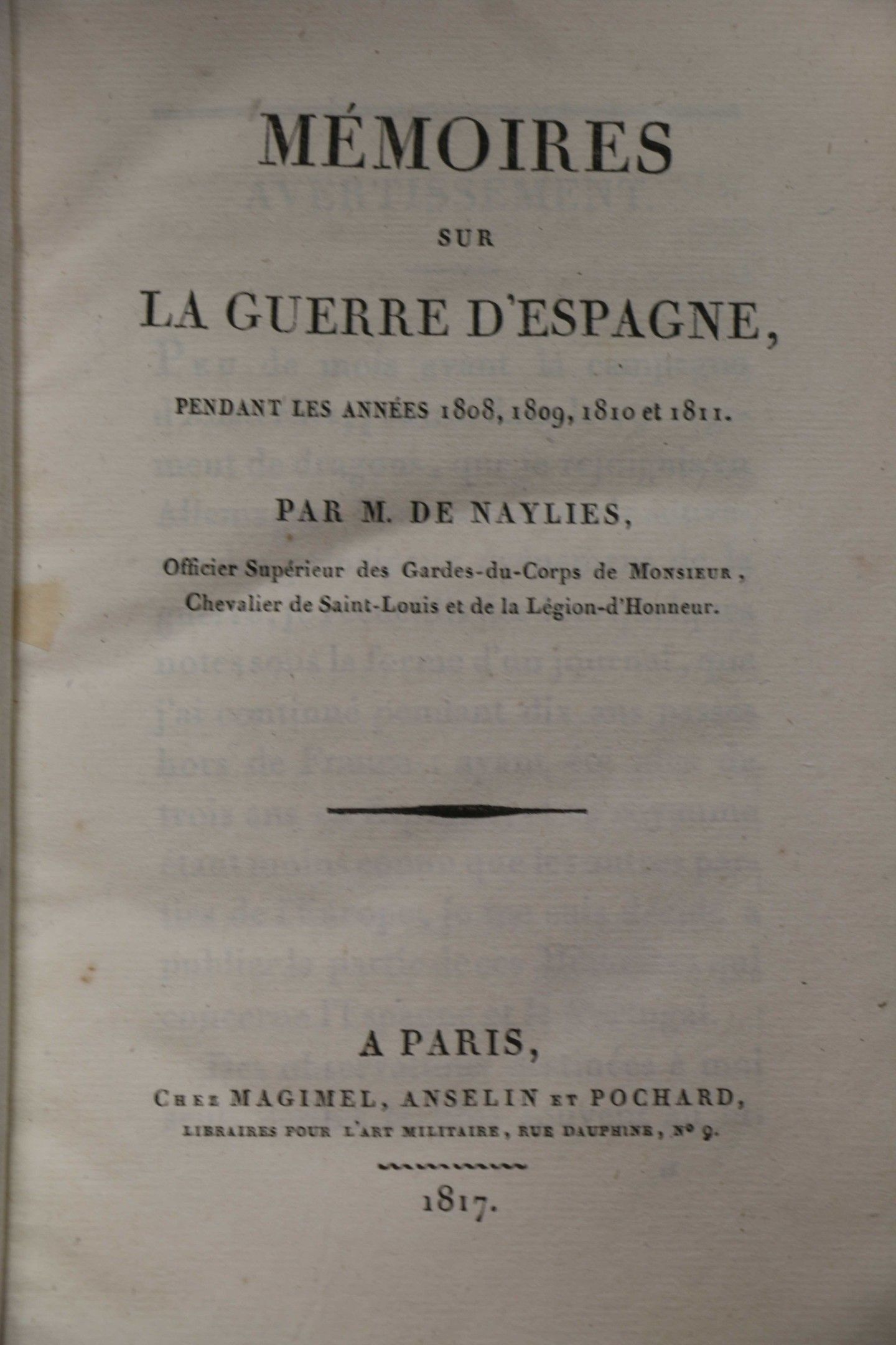 NAYLIES (M. de). Mémoires sur la guerre d'Espagne pendant les années 1808, 1809, 1810 et 1811. Paris, Magimel, 1817, in-8, half calf blue, spine ribbed, decorated (contemporary binding). FIRST EDITION. From the library of Souverain-Moulin. Minor wear to spine.