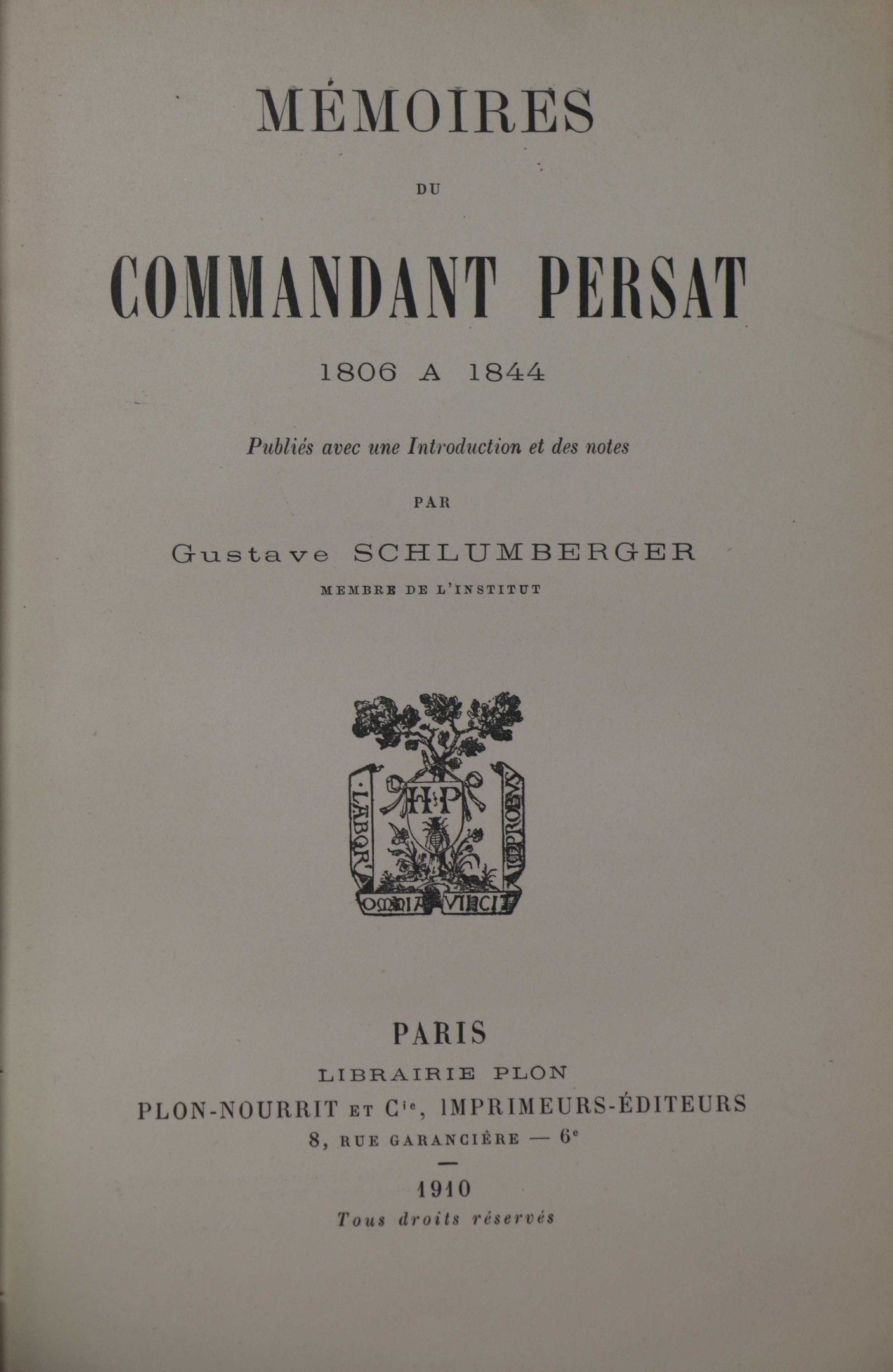 PERSAT (Commandant). Memoirs of Commandant Persat. 1806 à 1844. Paris, Plon, 1910, in-8, rust percal.half-rel., smooth spine.