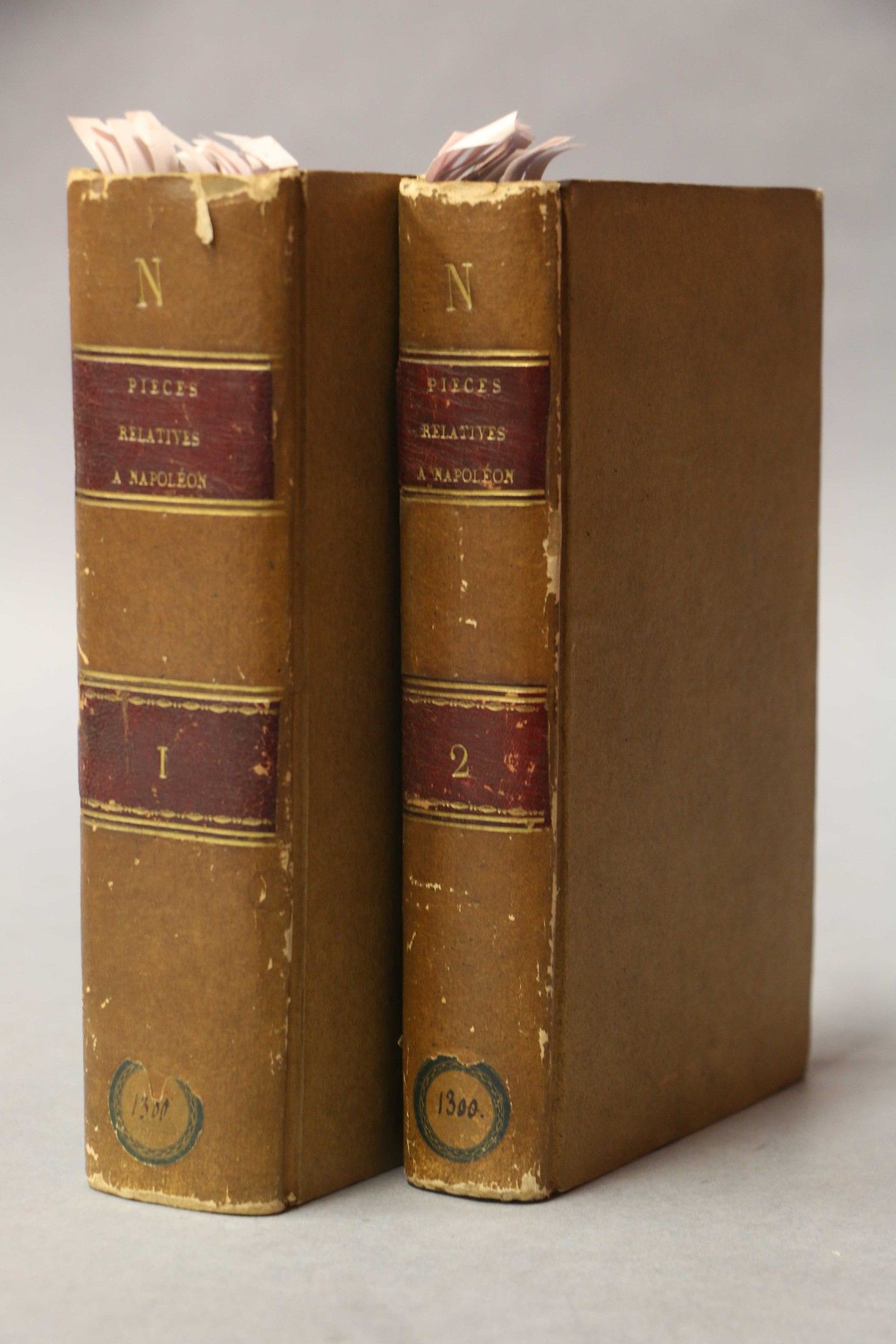 PIECES relatives à Napoléon. S.l., s.d, 2 vol. in-8, bradel, full beige paper, smooth spine, garnet-red title page.