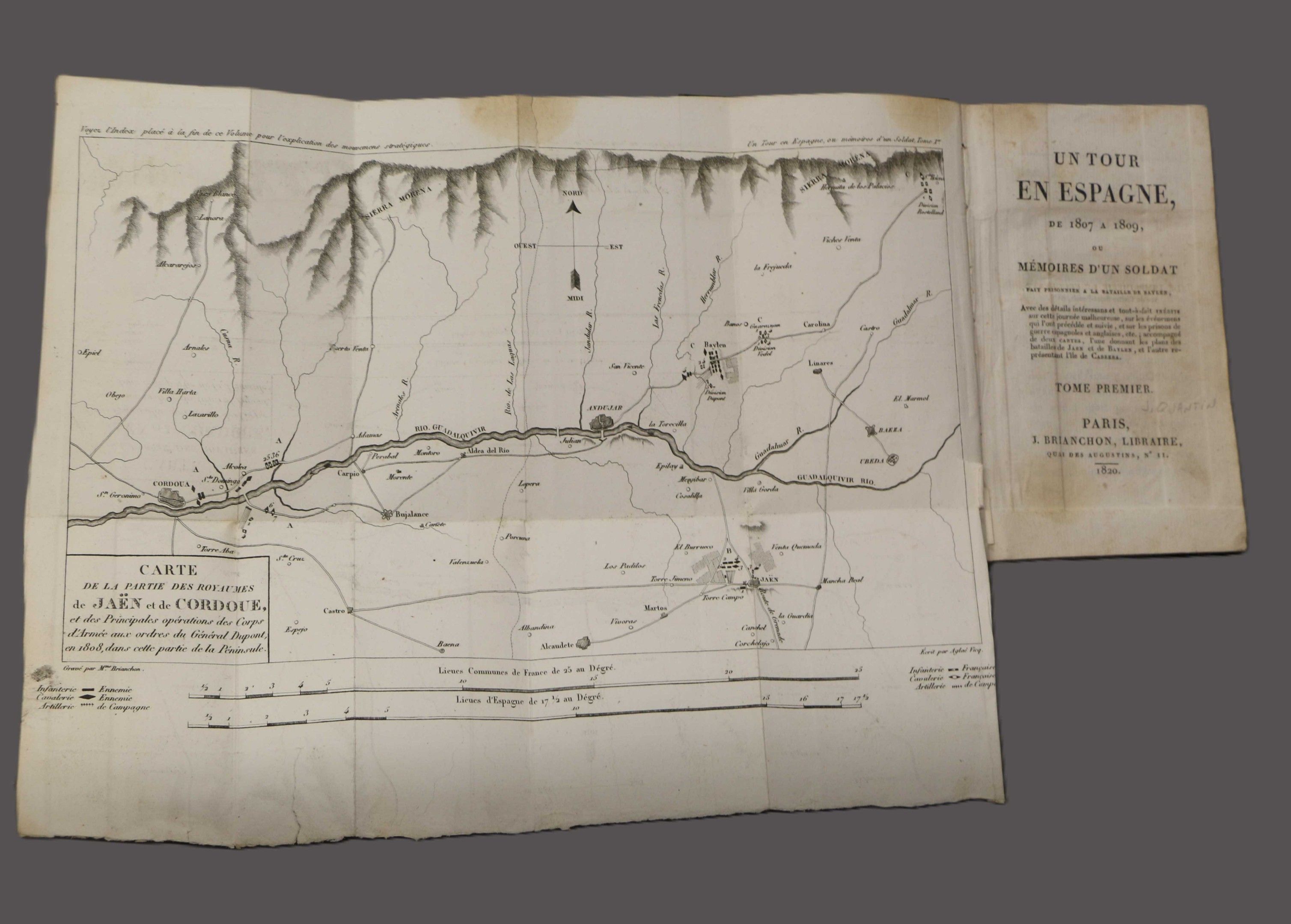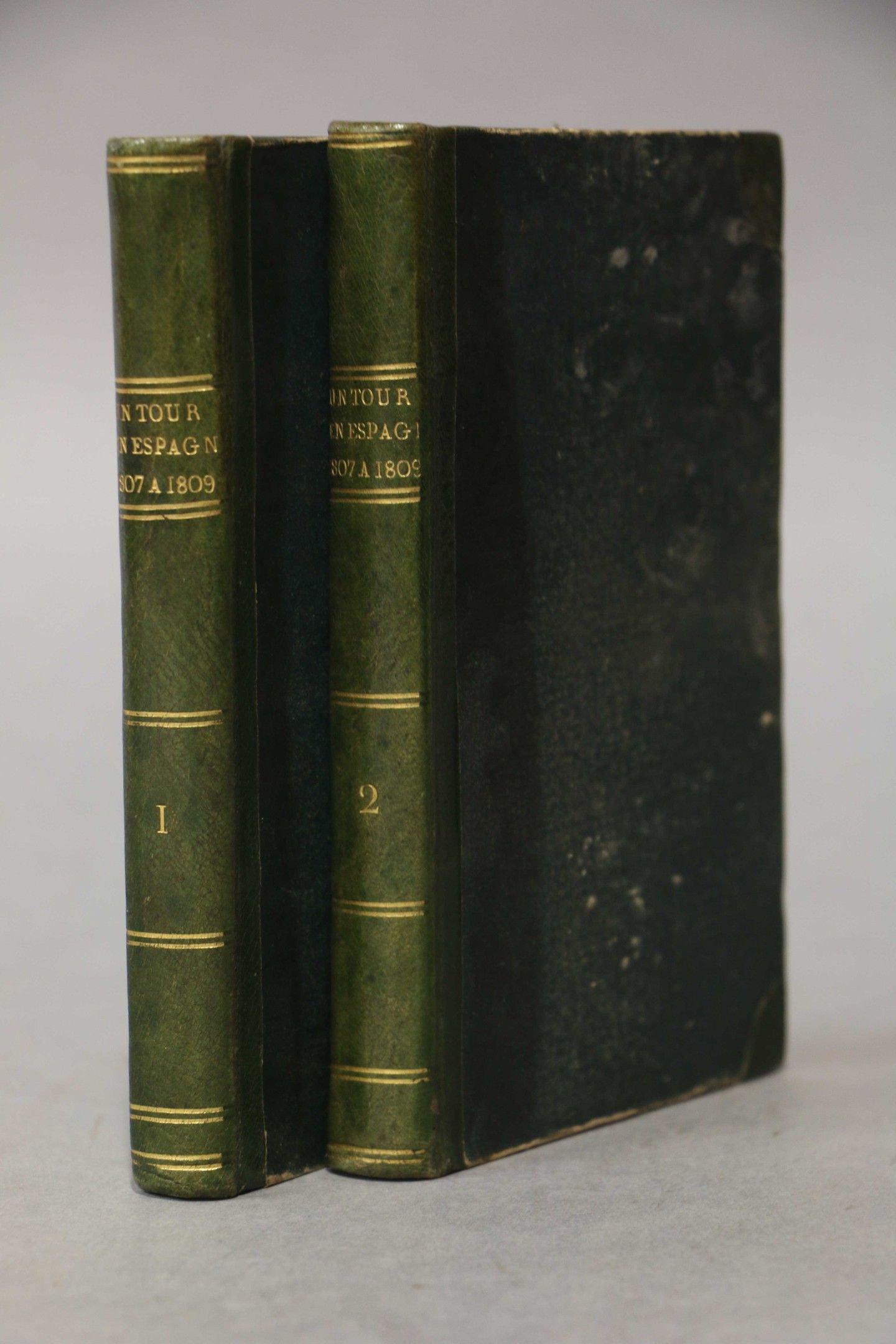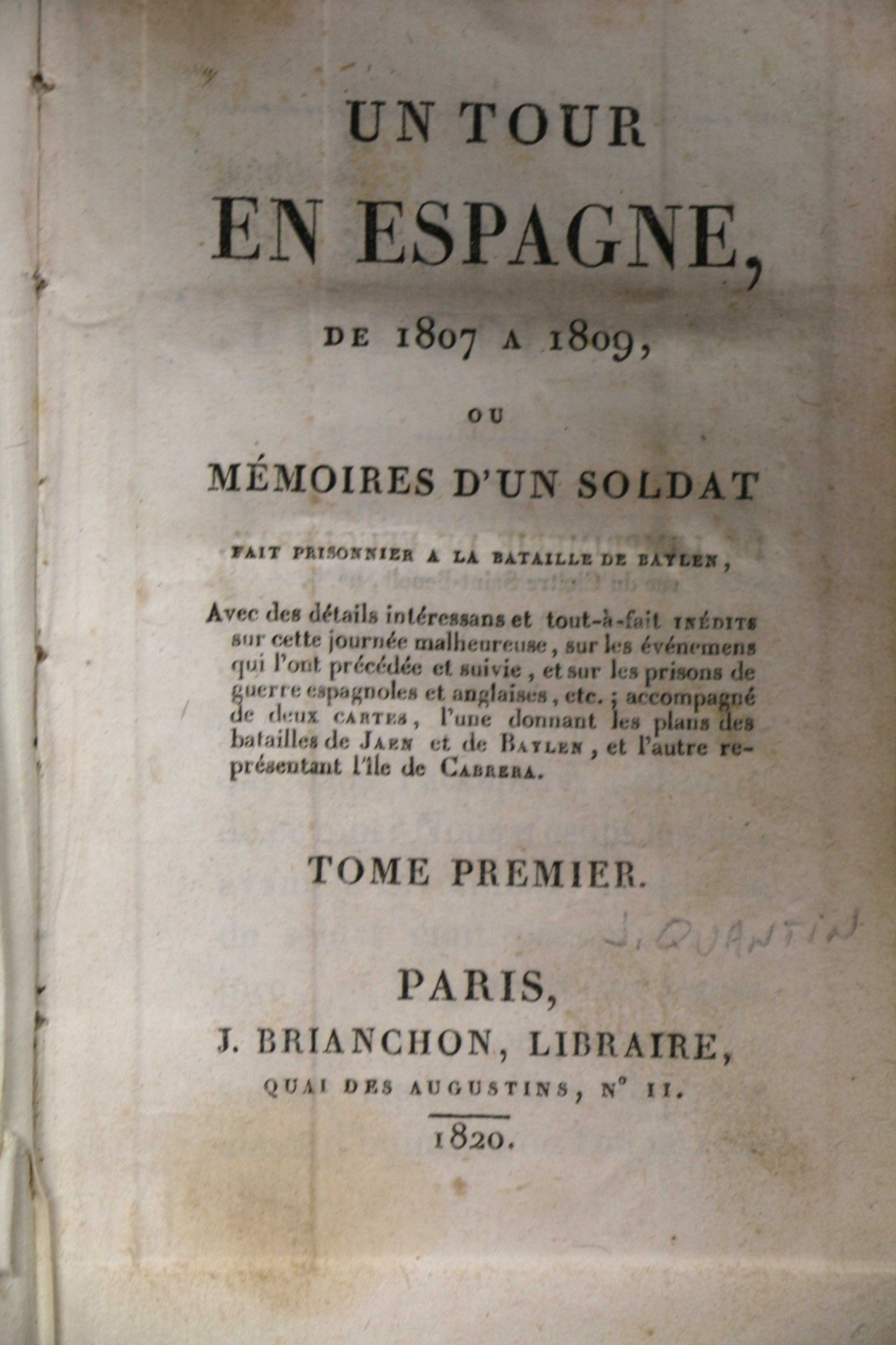 QUANTIN (J). Un tour en Espagne de 1807 à 1809 ou mémoires d'un soldat fait prisonnier à la bataille de Baylen. Paris Brianchon, 1820, 2 vol. in-12, green half-rel. bas., smooth spine. With 1 frontispiece map and a table. Incomplete of the map in vol. 2.