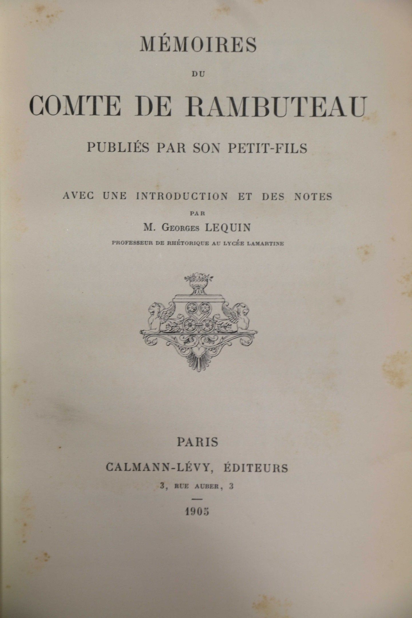 RAMBUTEAU (Cte de). Memoirs of the Count of Rambuteau, published by his grandson. Paris, Calmann-Lévy, 1905, in-8, brown half calf, spine ribbed. With a frontispiece and 8 plates. From the library of Mr. Baron de Nervo.