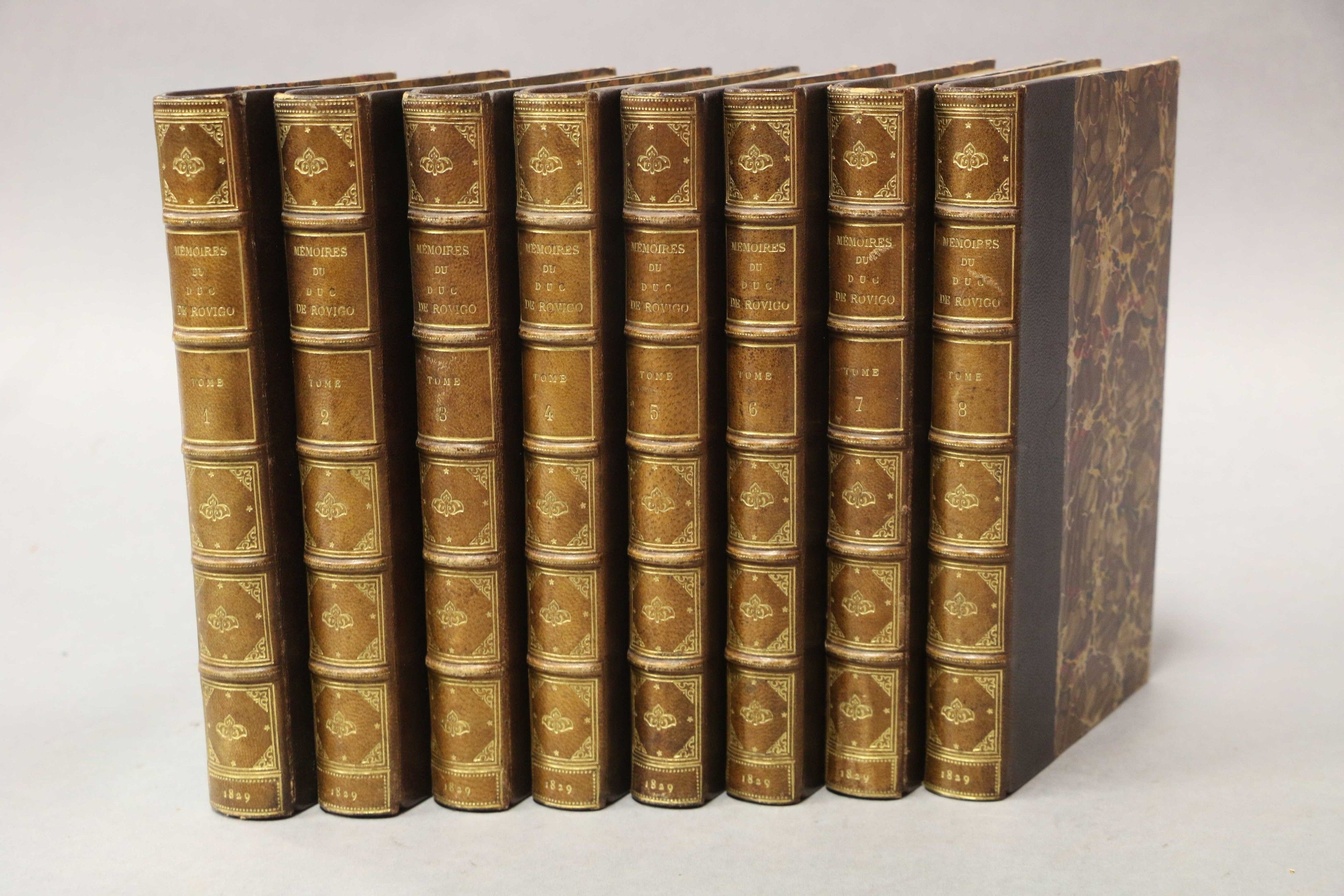 ROVIGO (Savary, Duc de). Mémoires de duc de Rovigo pour servir à l'histoire de l'empereur Napoléon. Seconde édition. Paris, Bossange,1829, 8 vol. in-8, half calf plum chag., spines ribbed, ornamented and unstained (contemporary binding). With 5 frontispieces. Some brown spots.